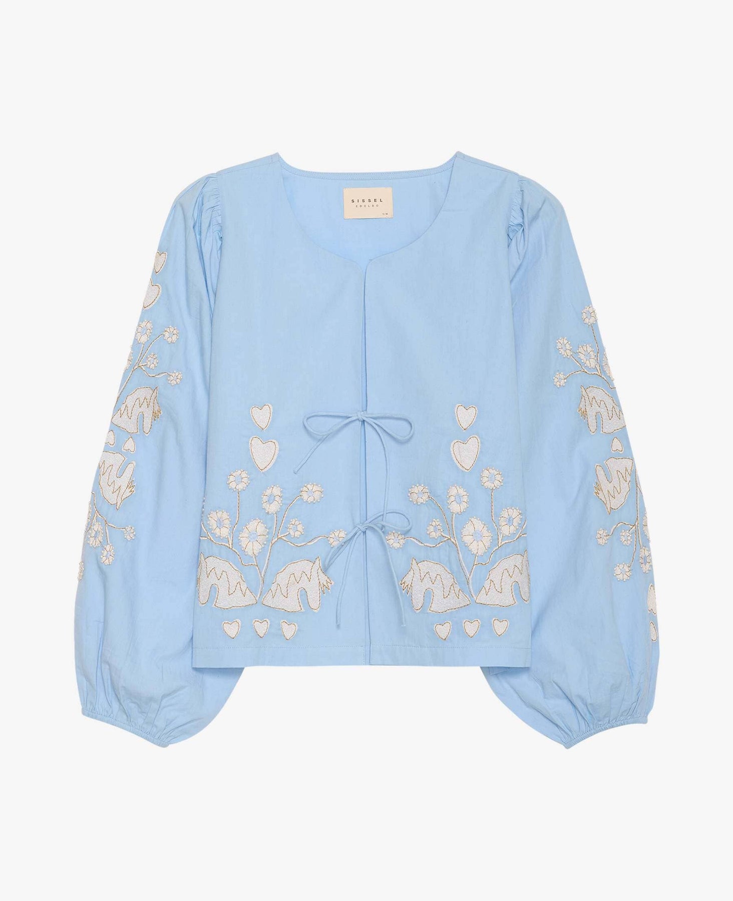 Jasnoniebieska bluzka od Sissel Edelbo z haftowanymi sercami i kwiatami z przodu oraz na rękawach. Bluzka ma wiązanie z przodu i zdobienia z pereł.