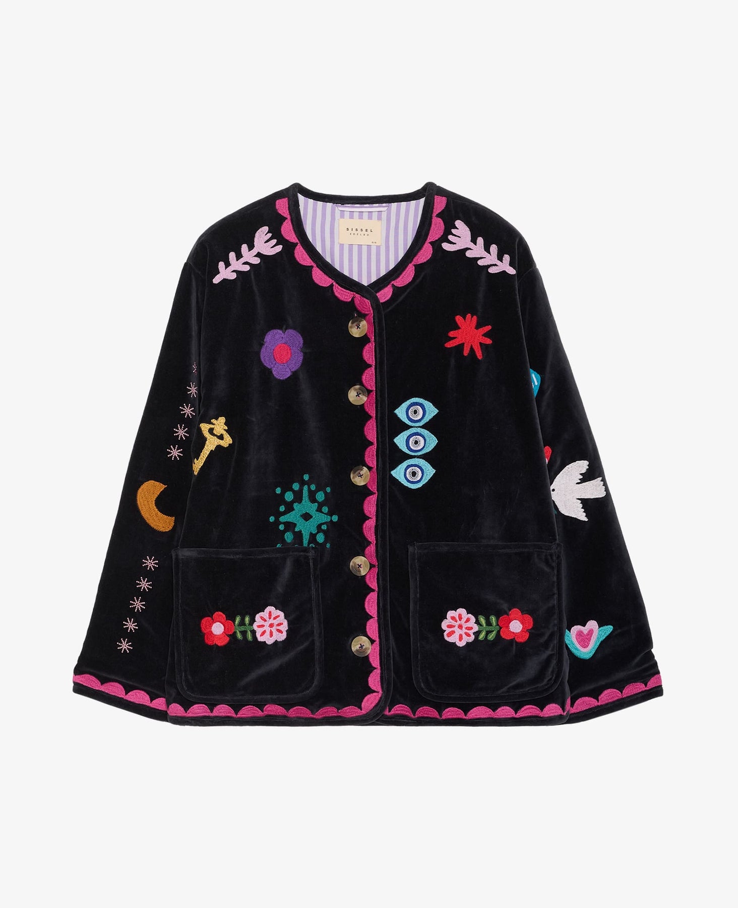 Czarna kurtka marki Sissel Edelbo, wykonana z nadwyżkowego sztruksu z kolorowymi haftami. Kurtka ma motywy tygrysów, kwiatów, węża oraz koraliki.