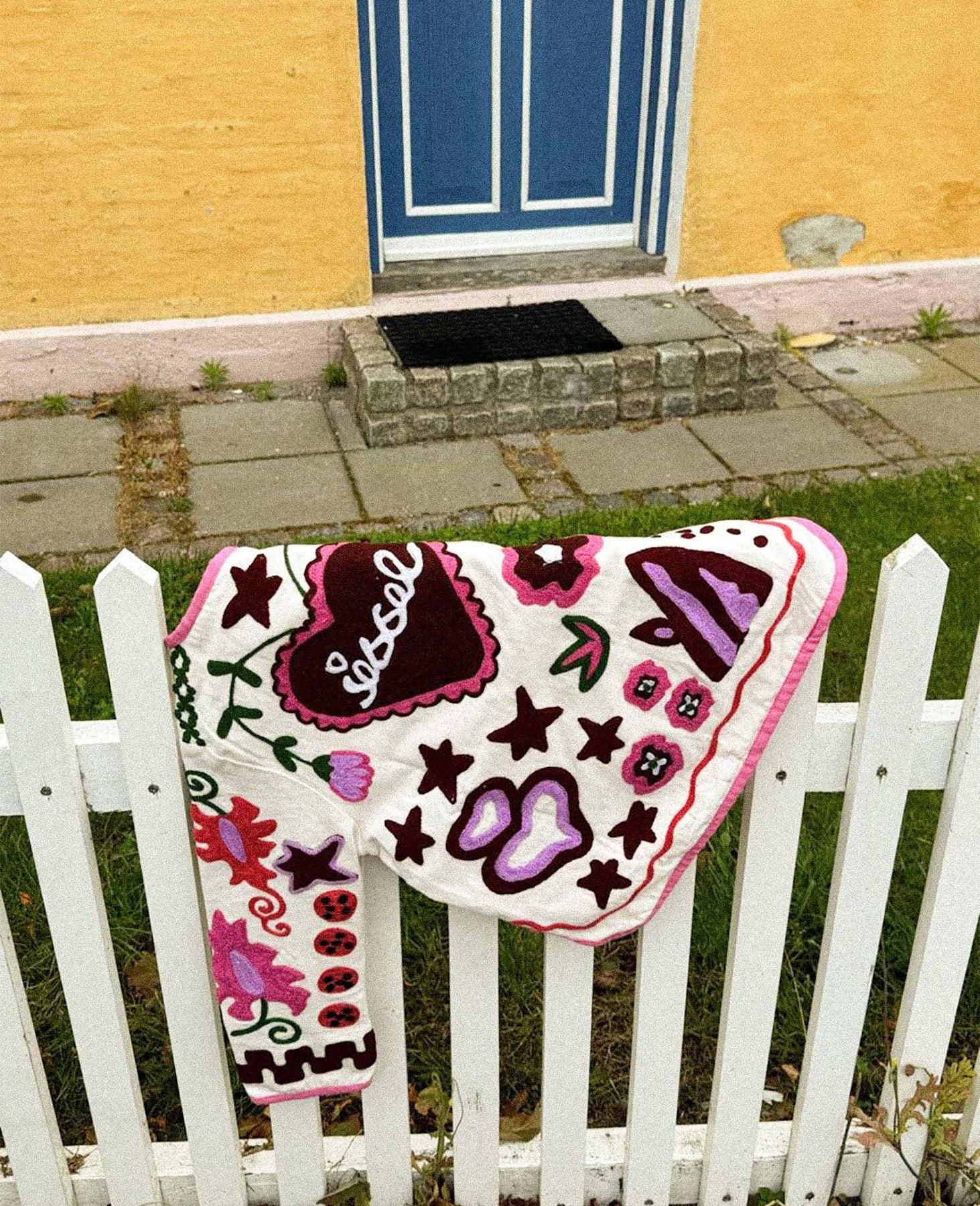 Króka kurtka od Sissel Edelbo z bawełnianego płótna z ręcznie wykonanym haftem Suzani. Posiada dwie przednie kieszenie i jest ozdobiona kwiatami oraz wzorami w odcieniach różu, zieleni i burgundu.