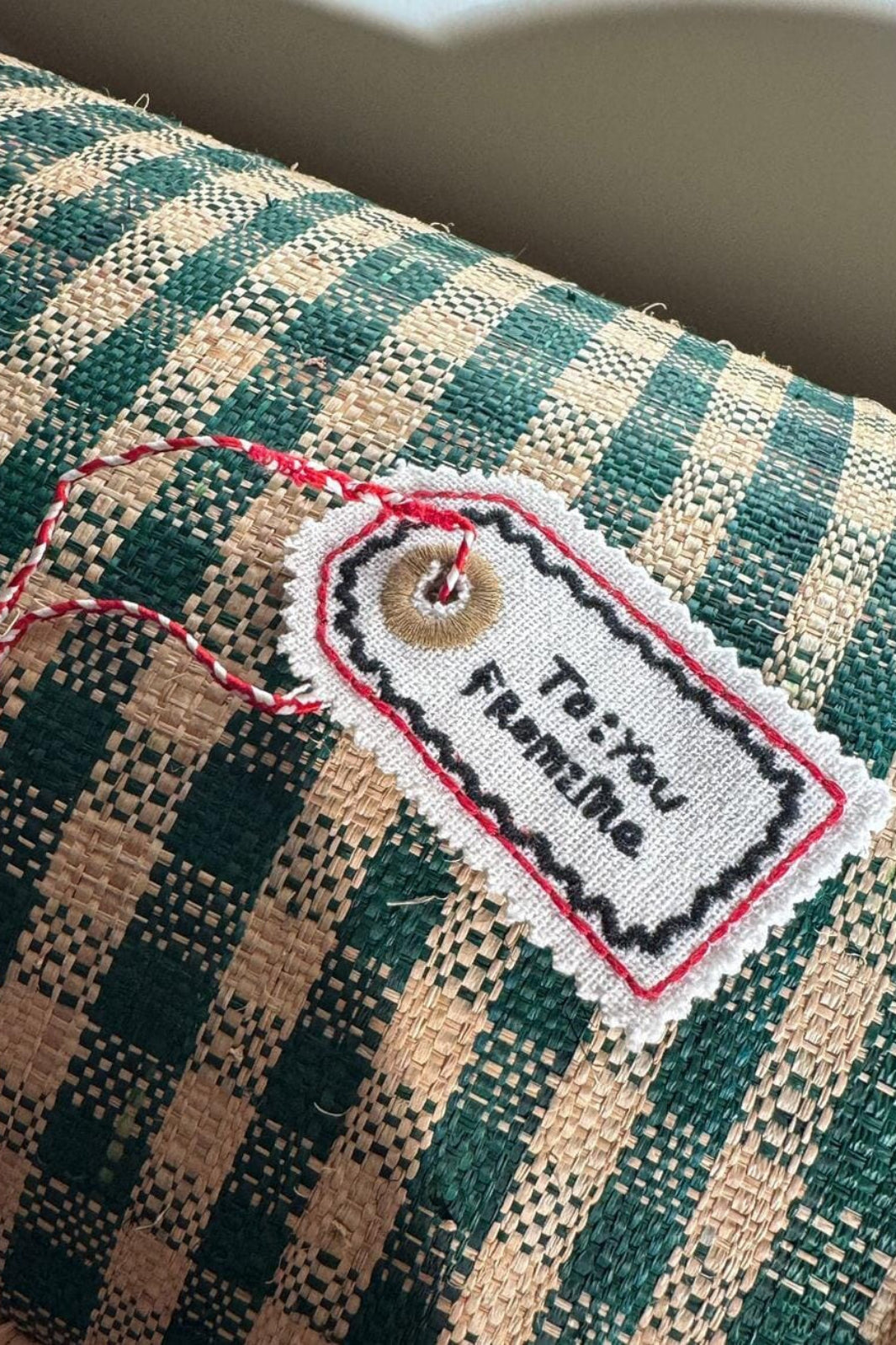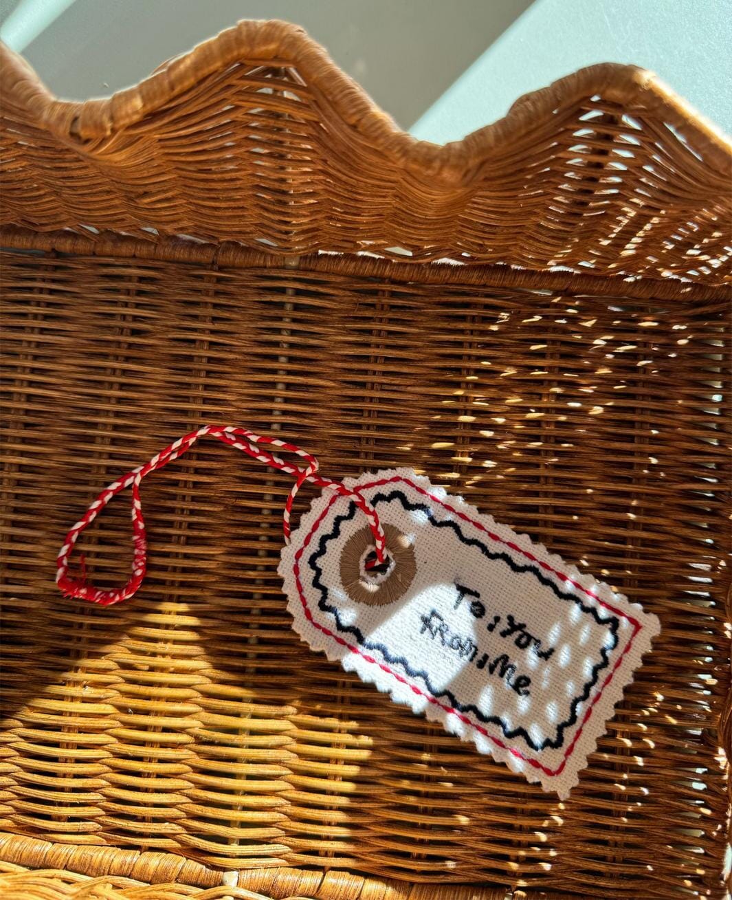 Ozdoba na tag od Sissel Edelbo, wykonana z nadmiarowego materiału tweed bouclé. Ozdoba ma prostokątny kształt z falistymi brzegami i czerwoną/białą plecioną sznurkiem.
