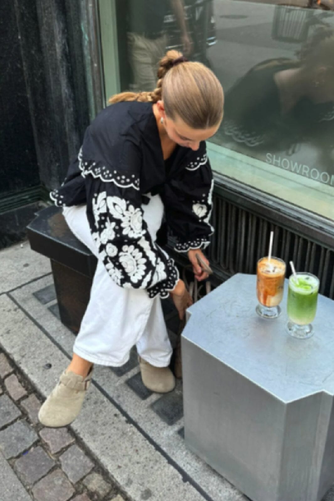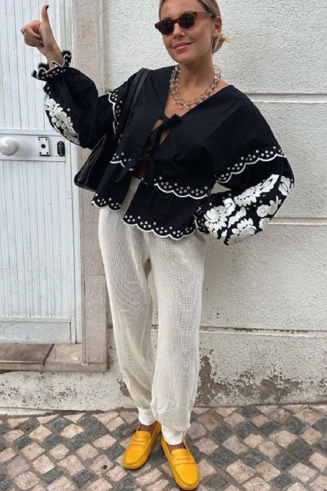 Czarny top z ekologicznej bawełny popelinowej z białymi łabędziami. Top ma dekolt w kształcie litery V i długie balonowe rękawy z haftowanymi detalami wzdłuż krawędzi i na rękawach.