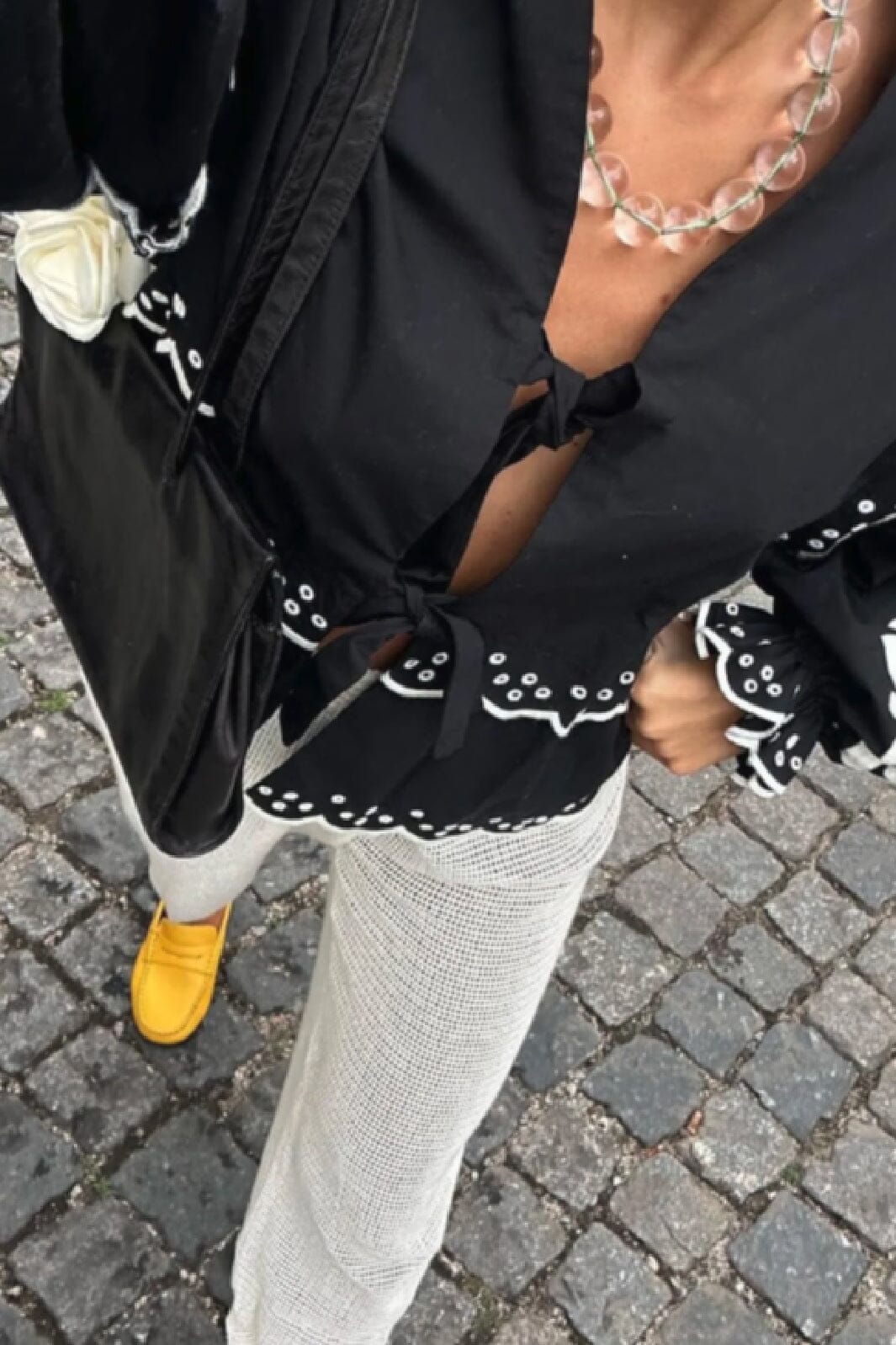- Dekolt w kształcie litery V z wiązaniem