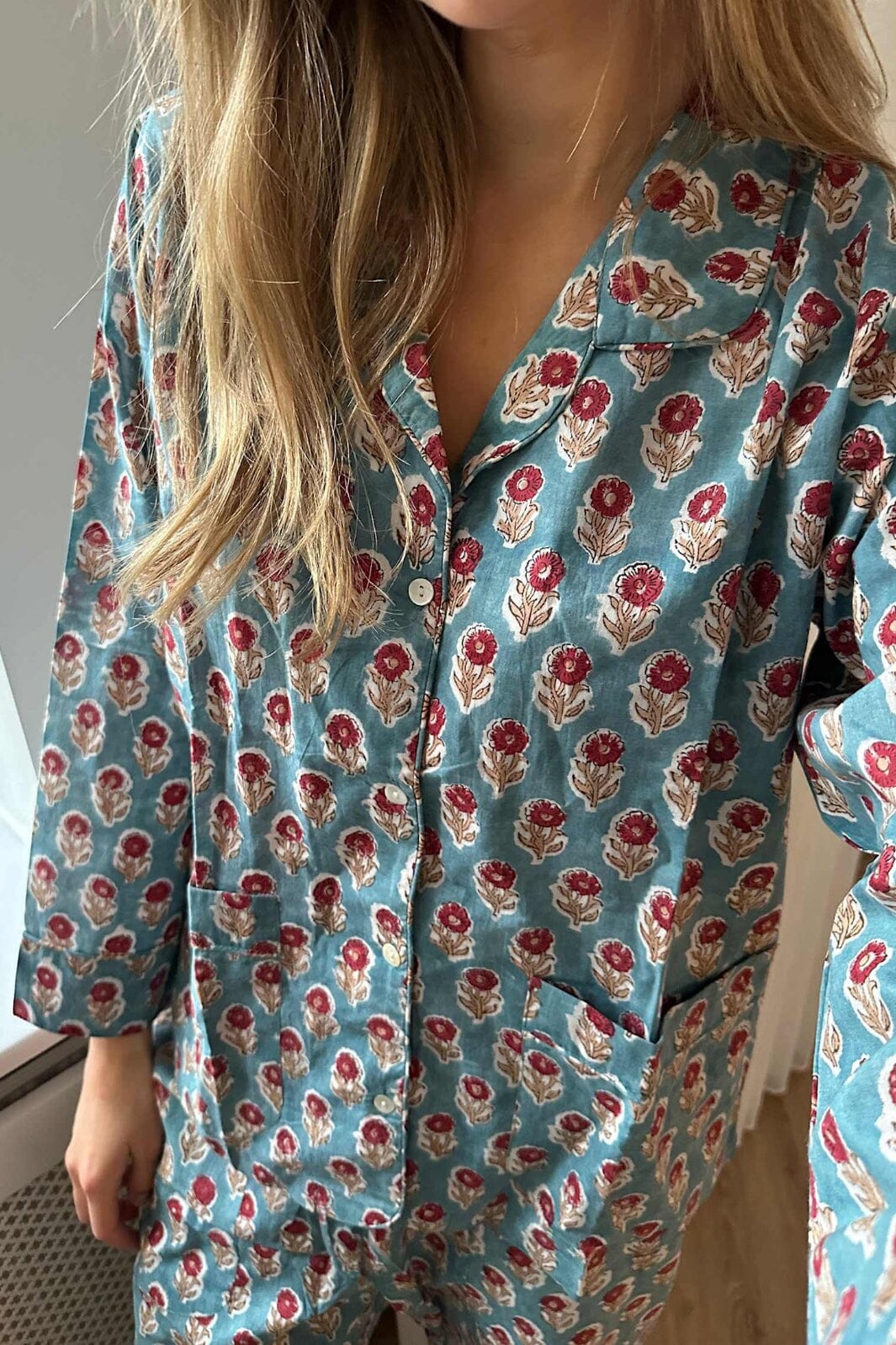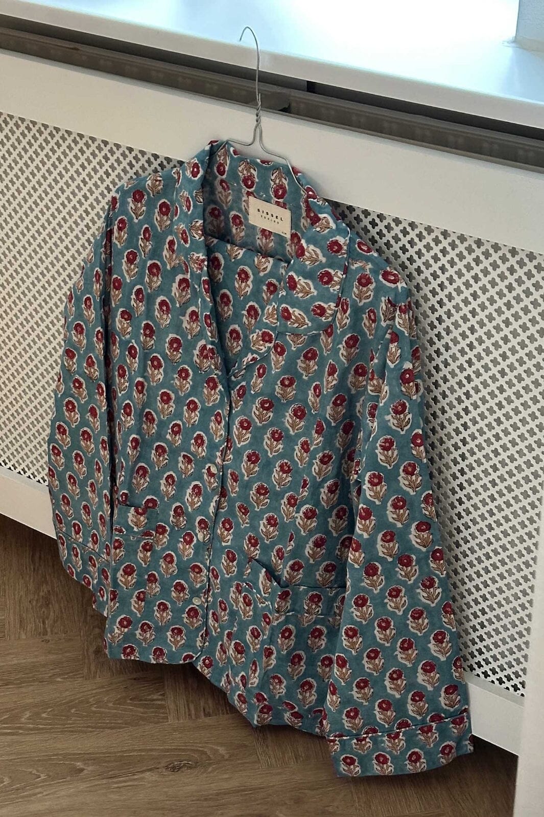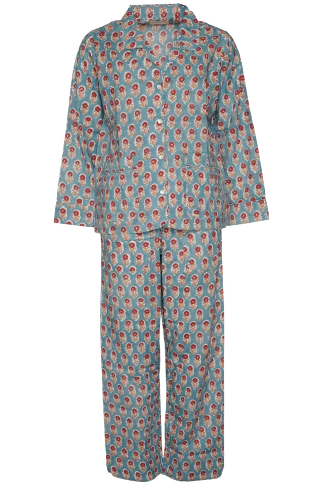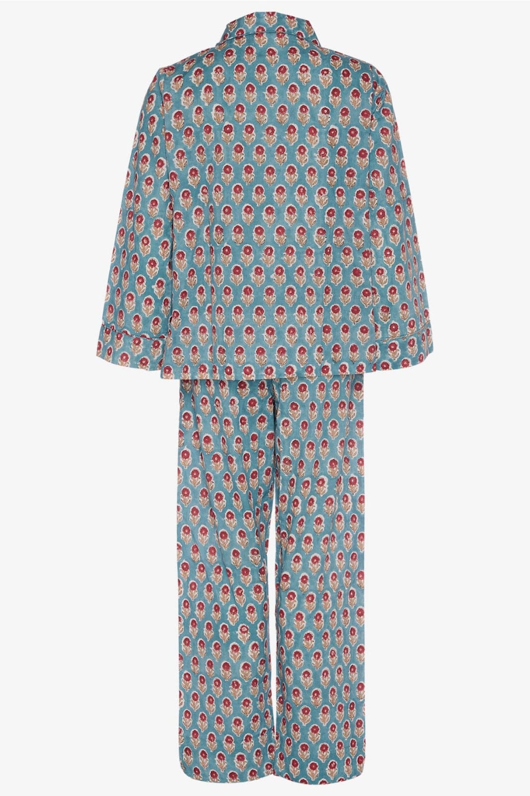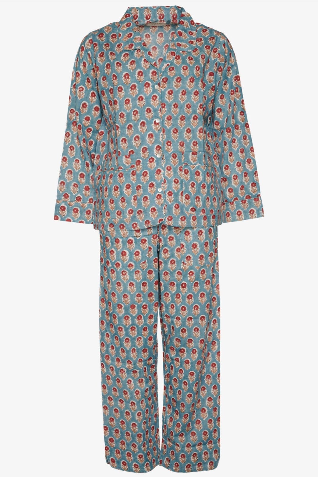Piżama w kolorze przykurzonego niebieskiego od Sissel Edelbo z tradycyjnym indyjskim nadrukiem blokowym. Zestaw składa się z koszuli z długim rękawem i spodni z elastycznym pasem.