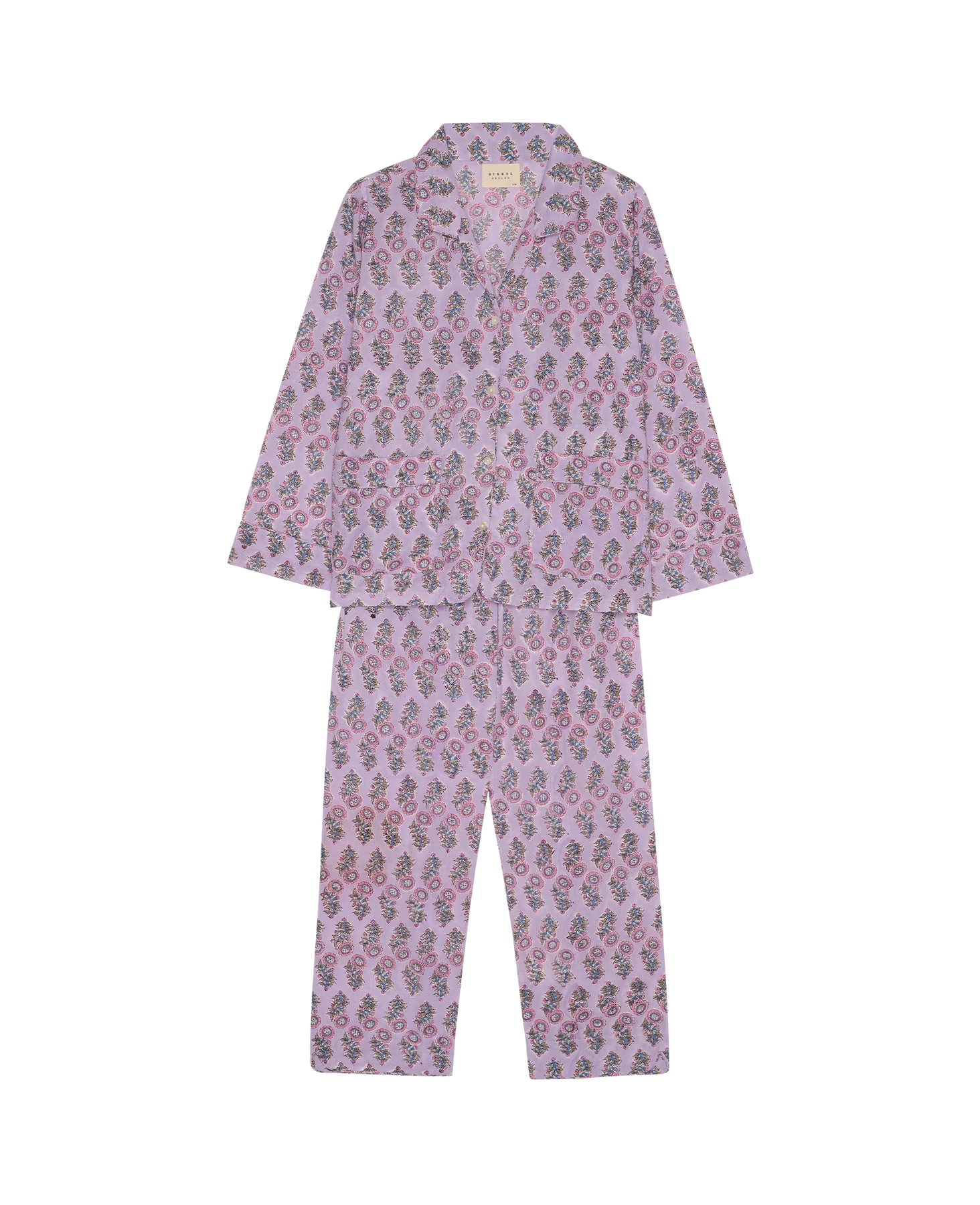 Komplet piżamowy od Sissel Edelbo w fioletowym kolorze z kwiatowym wzorem. Koszula ma zapięcie na guziki i mały kołnierzyk, a spodnie mają elastyczny pas.