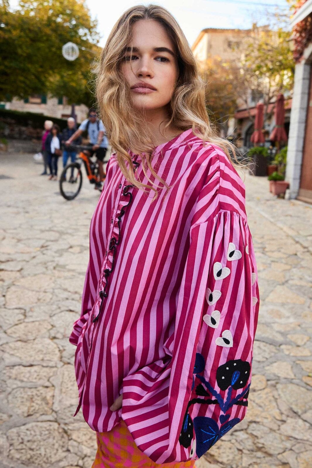 Różowa w paski koszula od Sissel Edelbo z ekologicznej bawełny popelin. Koszula ma hafty kwiatowe na rękawach oraz marszczony przód z guzikami i kołnierzykiem.