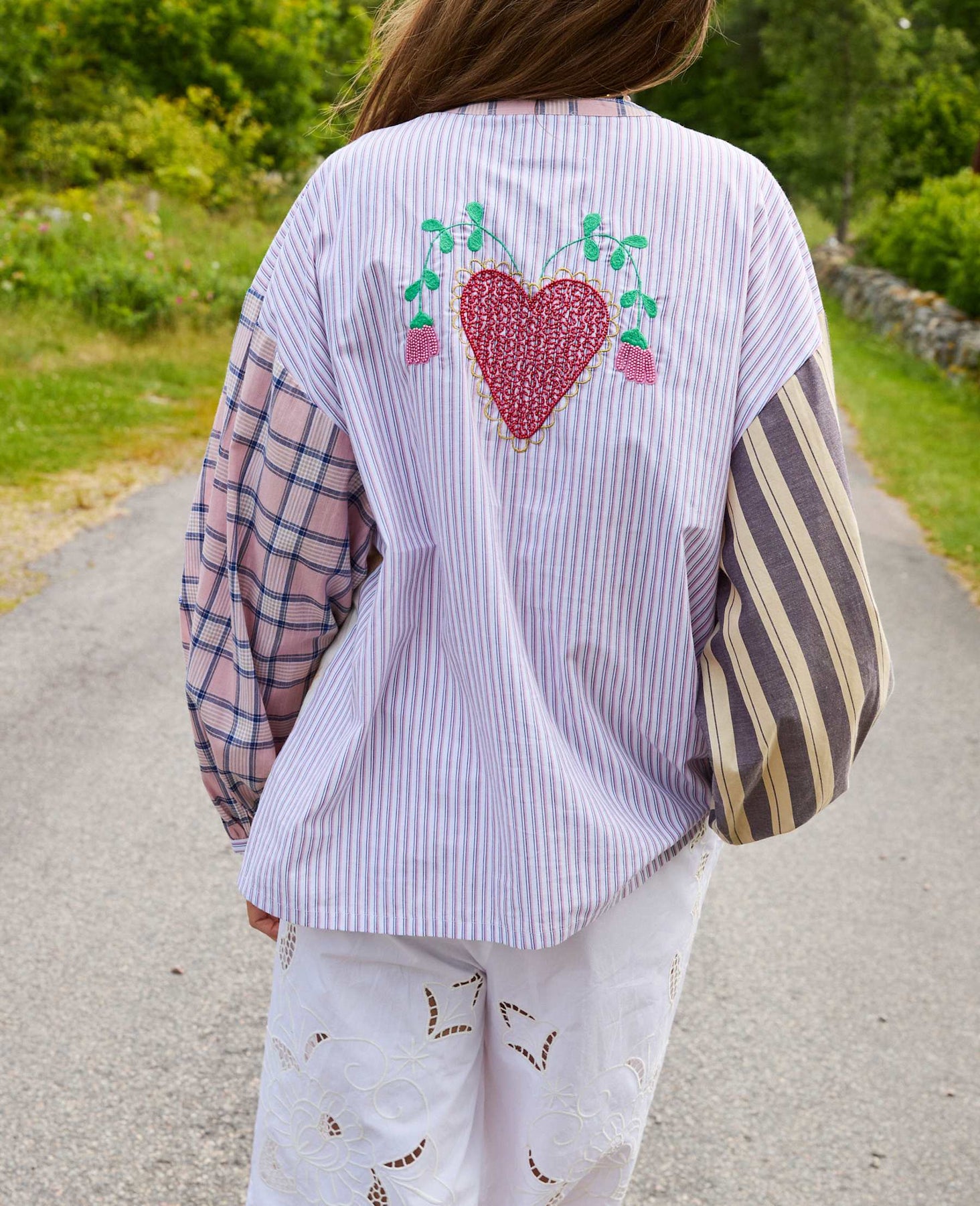 Koszula od Sissel Edelbo z wielokolorowym patchworkowym wzorem w kratę, paski i kwiatowy nadruk. Koszula ma guziki z masy perłowej oraz haftowane serce na plecach.