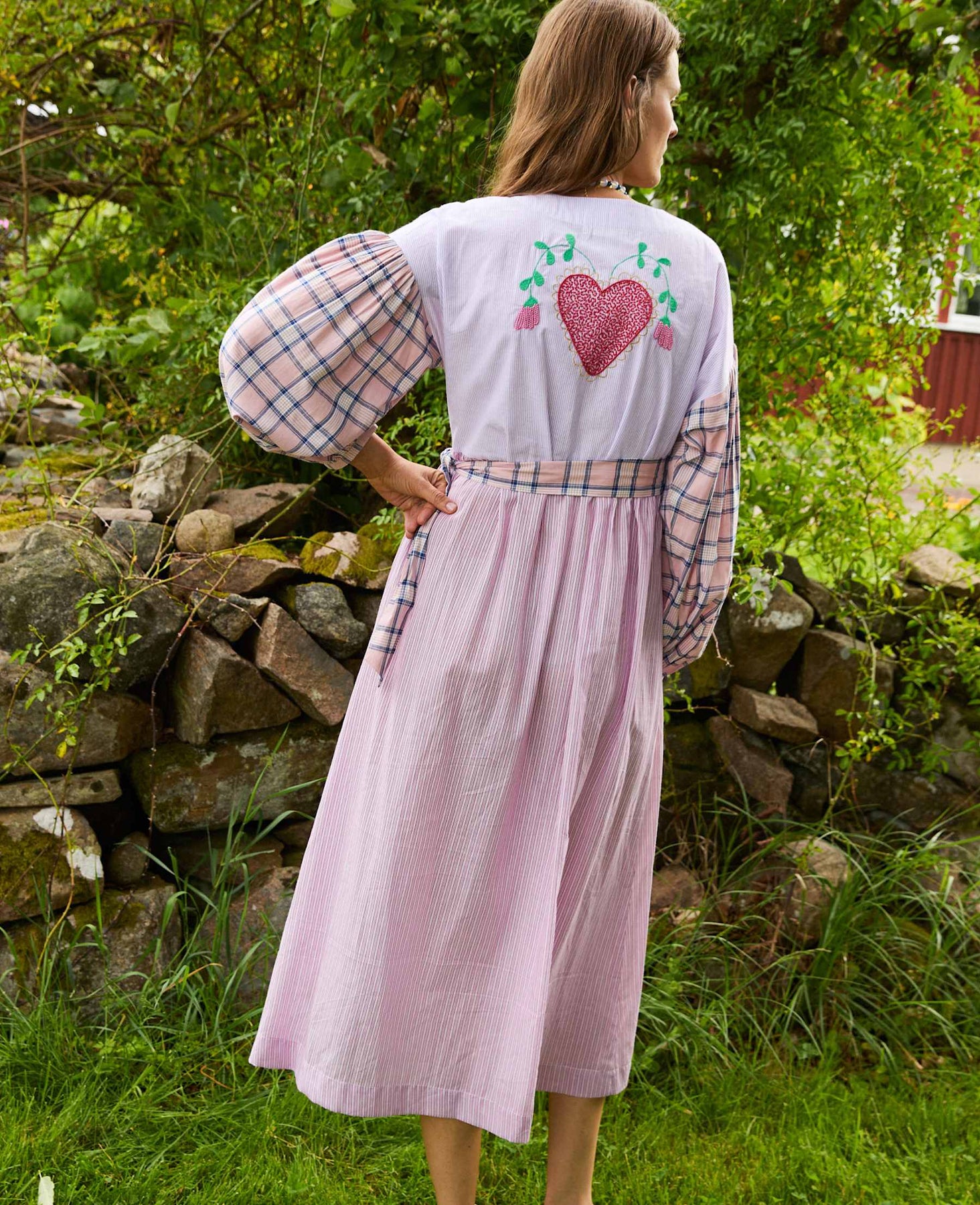 Sukienka kopertowa od Sissel Edelbo z wielokolorowym wzorem w kratę i paski. Sukienka wykonana jest z nadwyżek bawełny oraz tkanin deadstock.