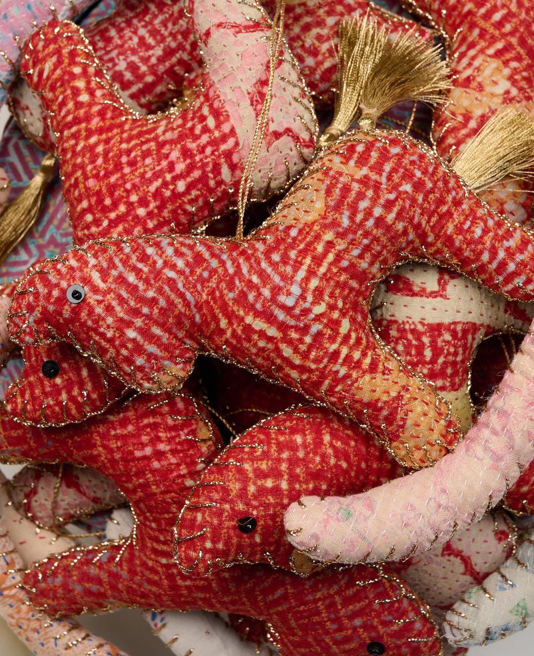 Ozdoba konika bujanego od Sissel Edelbo, wykonana z resztek koców kantha. Ozdoba ma czerwono-biały wzór z złotą frędzelką jako ogonem.