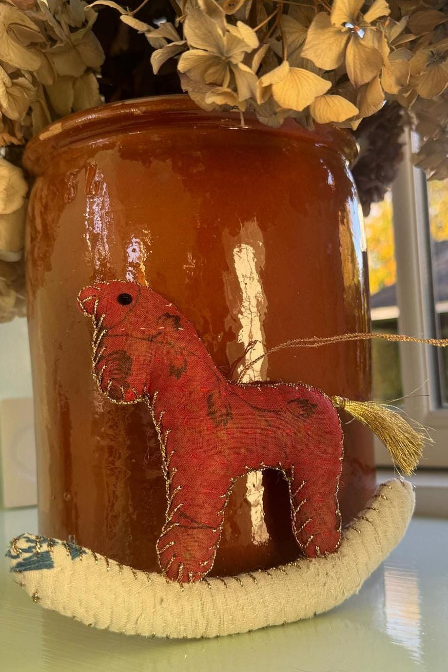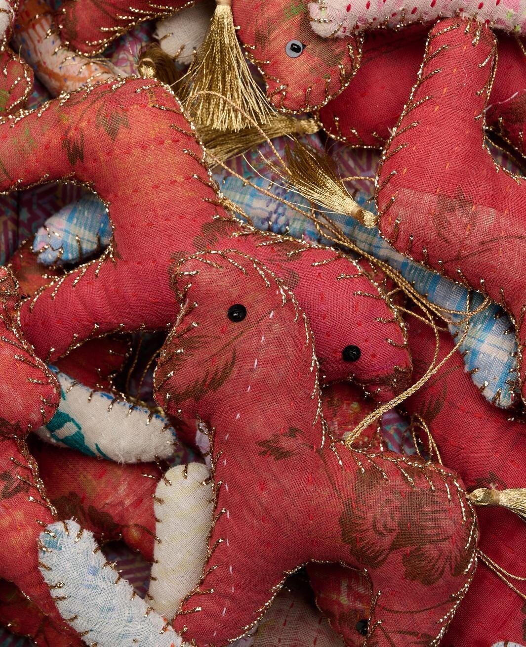 Ozdoba konika bujanego od Sissel Edelbo, wykonana z resztek koców kantha. Każda ozdoba ma czerwone ciało z białym dnem i złotą frędzelką.