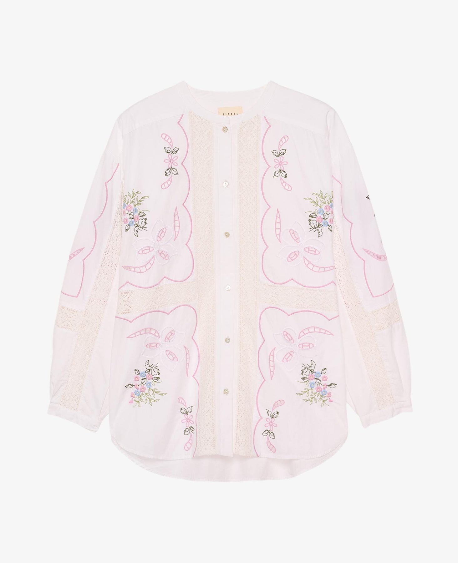 Biała koszula marki Sissel Edelbo z haftowanymi motywami kwiatowymi w pastelowych kolorach i koronkowymi detalami. Koszula ma luźny krój i wykonana jest z bawełny organicznej.