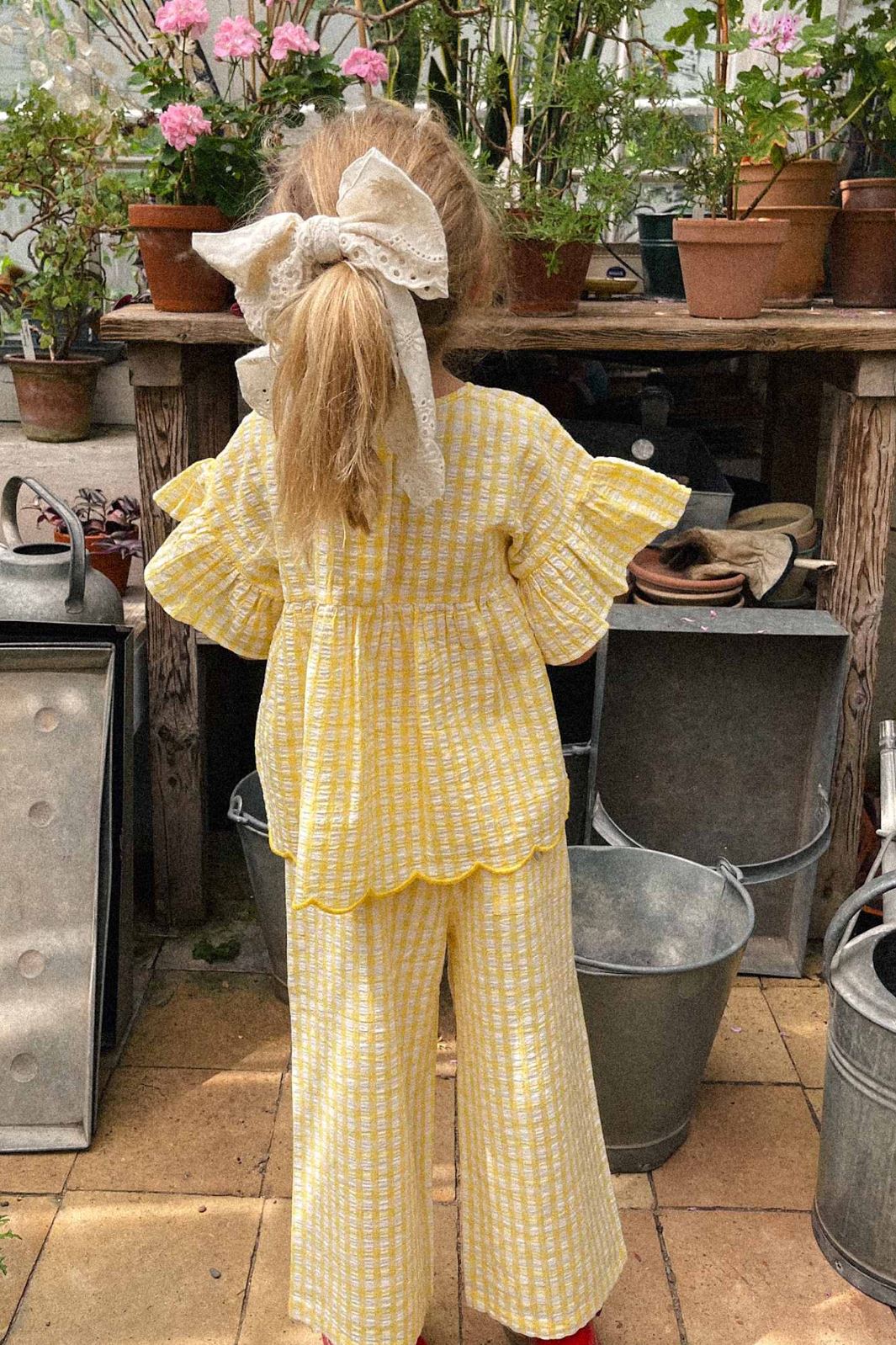 Żółte w kratkę spodnie od Sissel Edelbo z bawełny organicznej. Spodnie mają luźny krój z gumką w talii i ładnym, małym, niebiesko-paskowanym detalem serca na tylnej kieszeni.