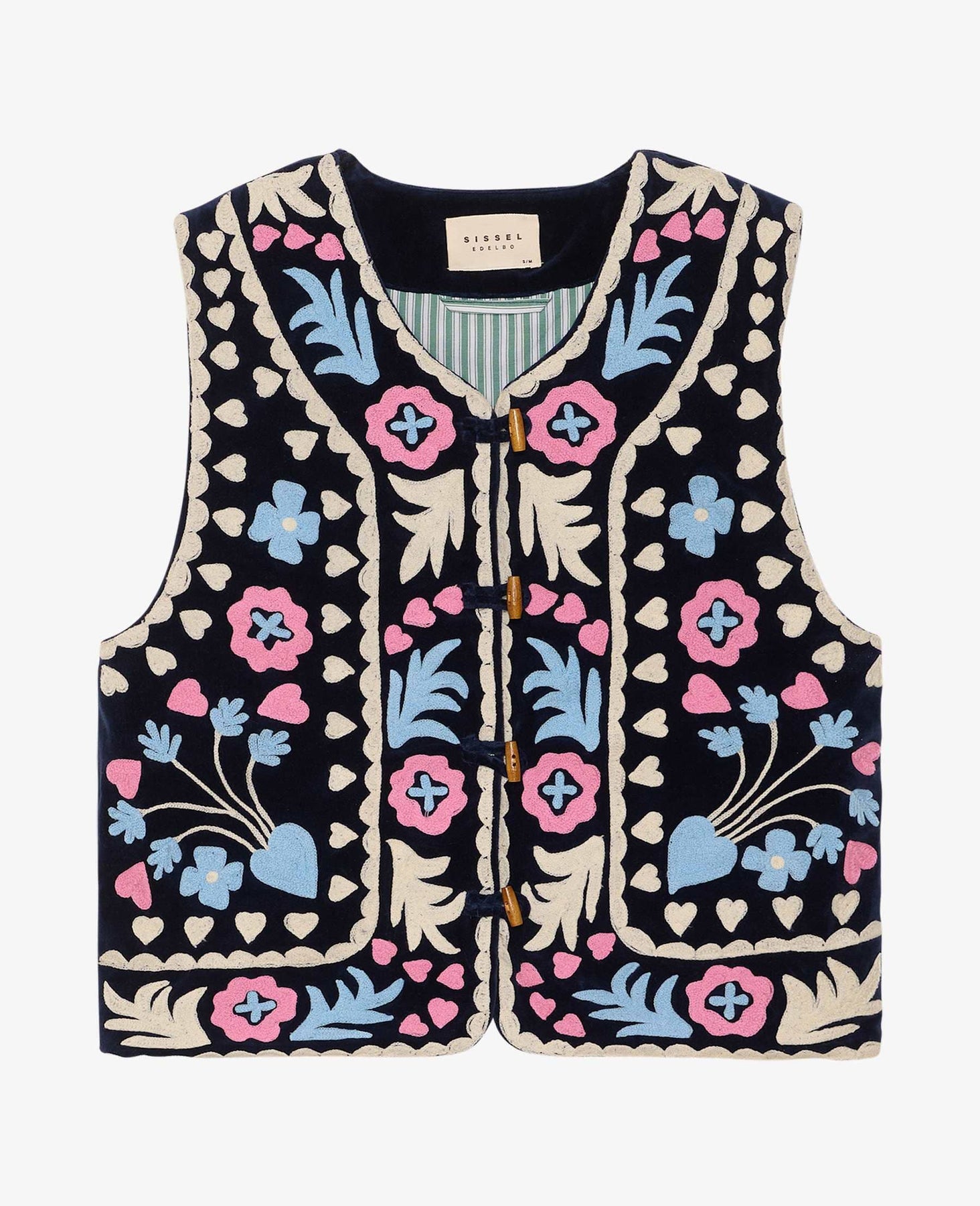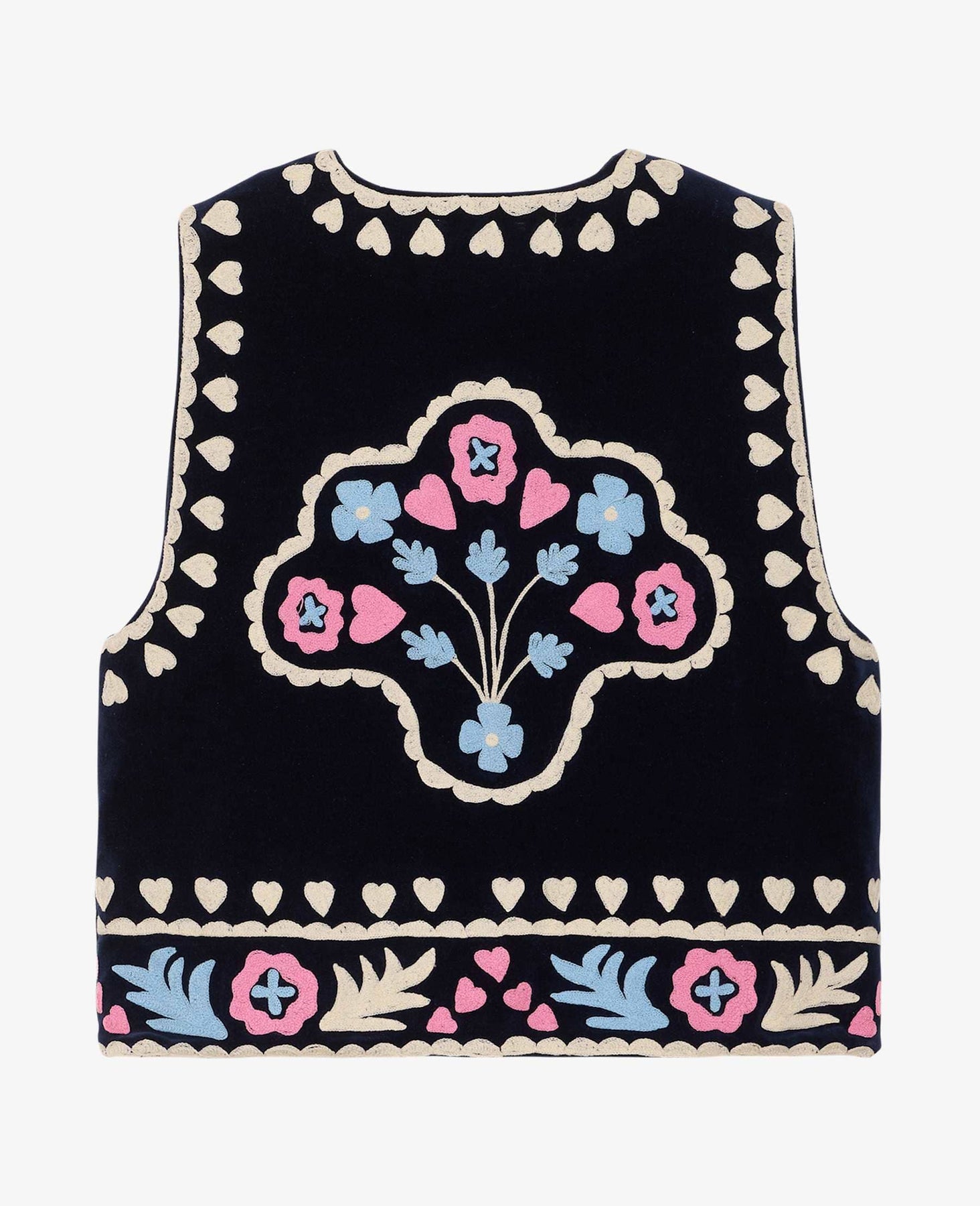 Granatowa kamizelka od Sissel Edelbo z haftem Suzani w kwiatowy wzór. Wykonana z nadwyżkowej bawełny welurowej i podszyta pasiastą bawełną.