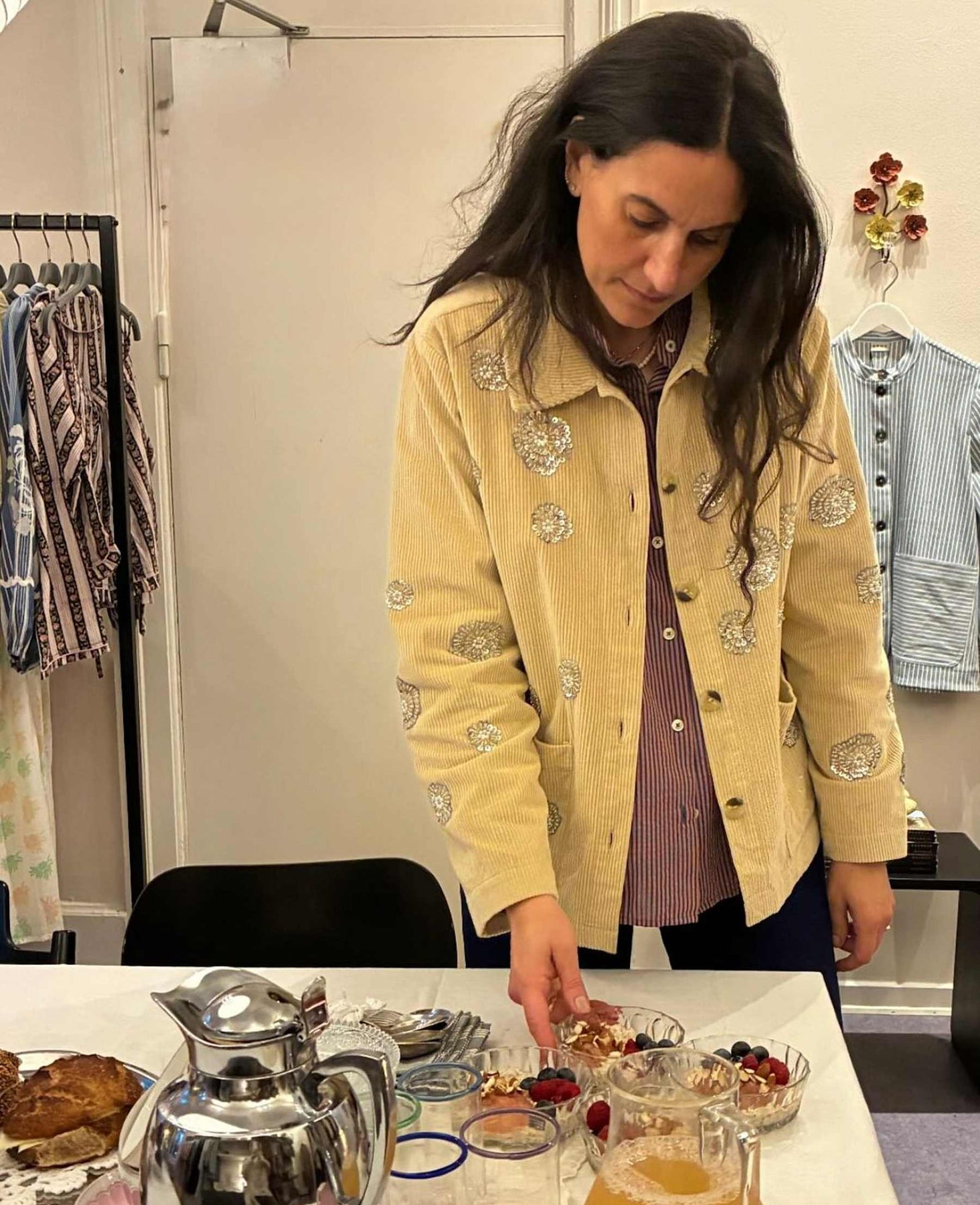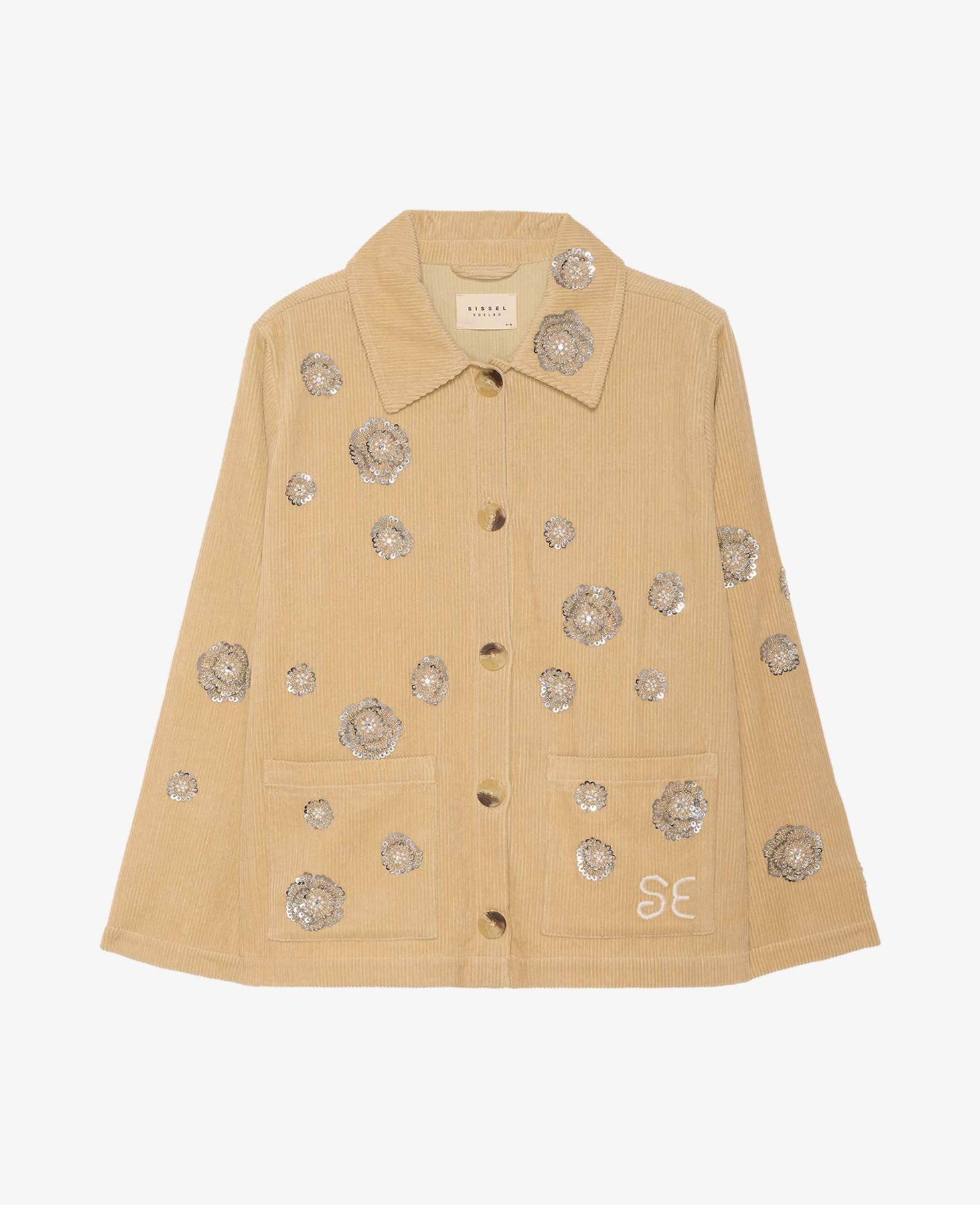 Beżowa kurtka marki Sissel Edelbo, wykonana z nadwyżek sztruksu. Kurtka ozdobiona jest cekinami i rozetami z pereł w różnych rozmiarach, ułożonymi w nieregularny wzór.