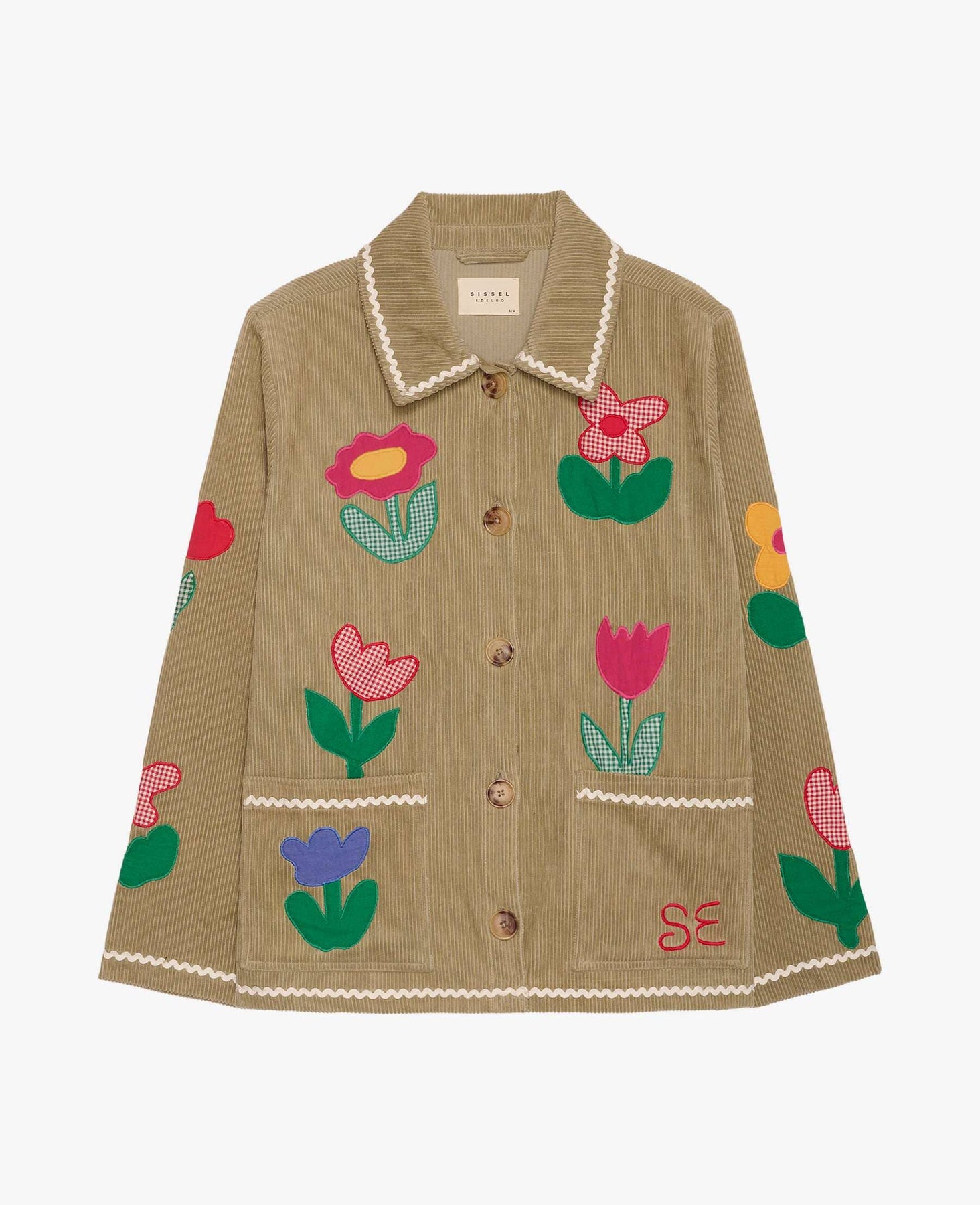 Kurtka od Sissel Edelbo, wykonana z nadwyżkowego sztruksu w zielonym odcieniu. Kurtka ma luźny krój z małym koszulowym kołnierzykiem i długimi rękawami.