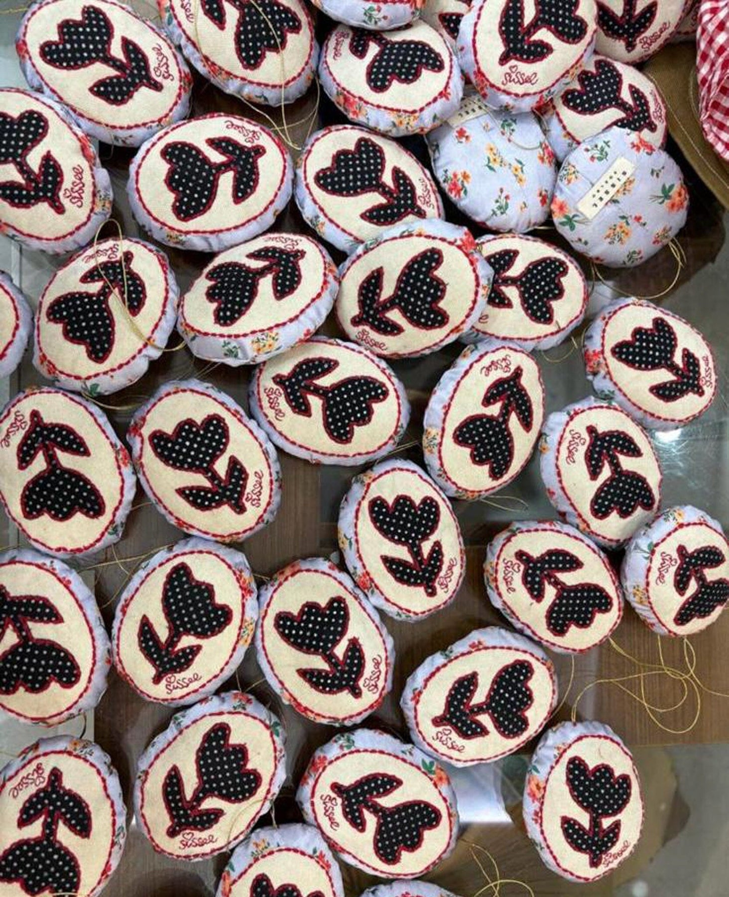 Ozdoba wielkanocne jajko od Sissel Edelbo z haftowanym kwiatowym wzorem w fioletowych odcieniach. Tył ma kolorowy kwiatowy wzór na jasnym tle.