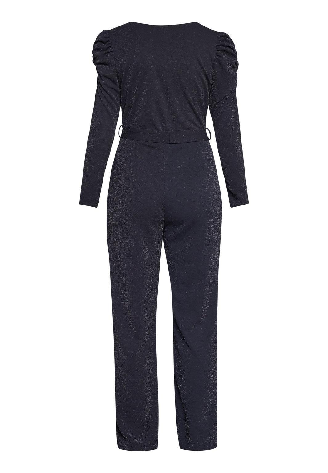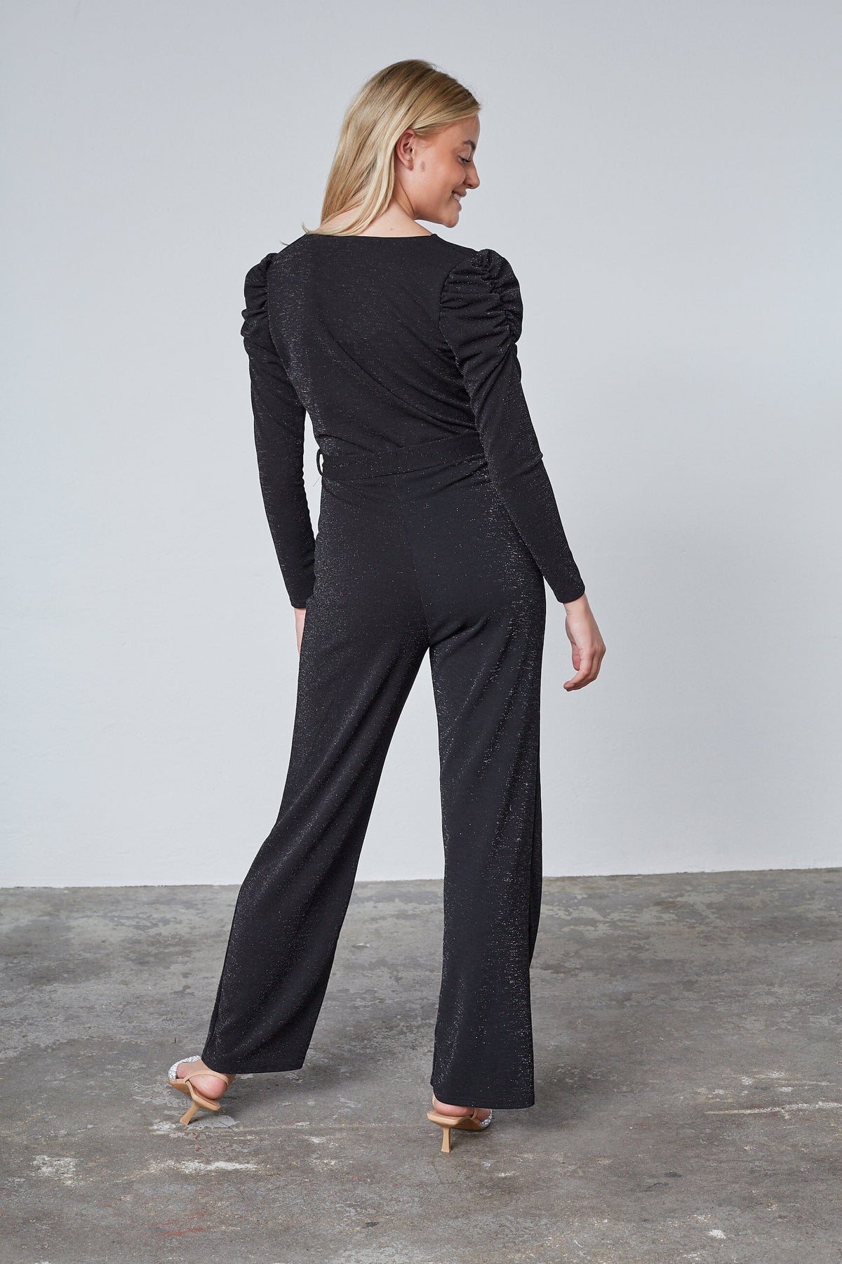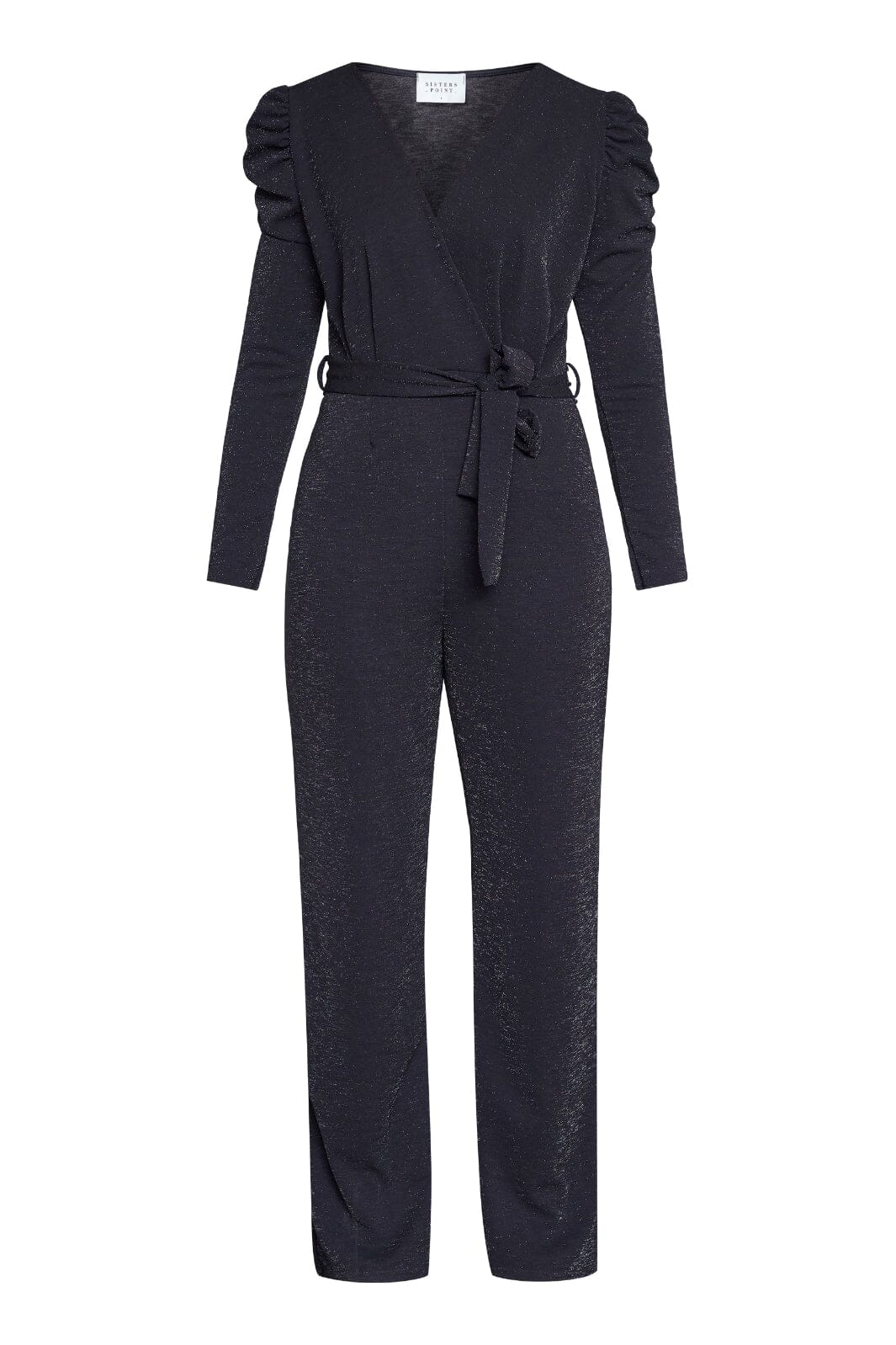 Czarny kombinezon od Sisters Point z efektem srebrnego brokatu. Ma dekolt w kształcie V, bufiaste rękawy z marszczonymi detalami na ramionach oraz pasek do związania w talii.