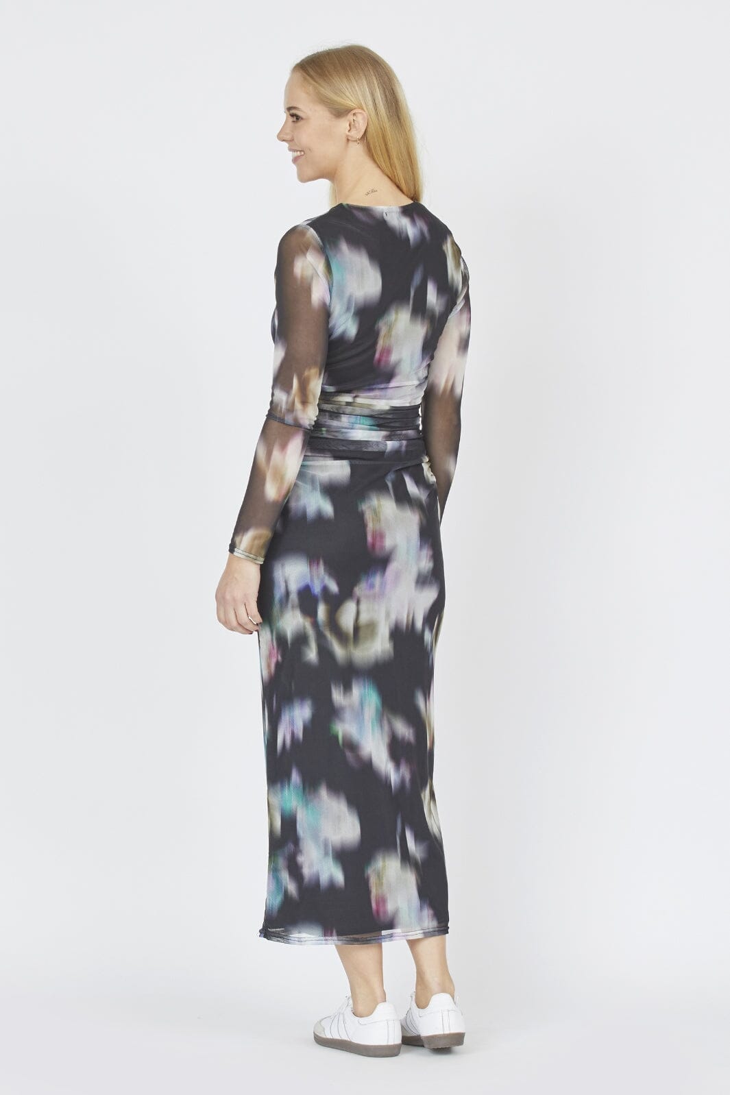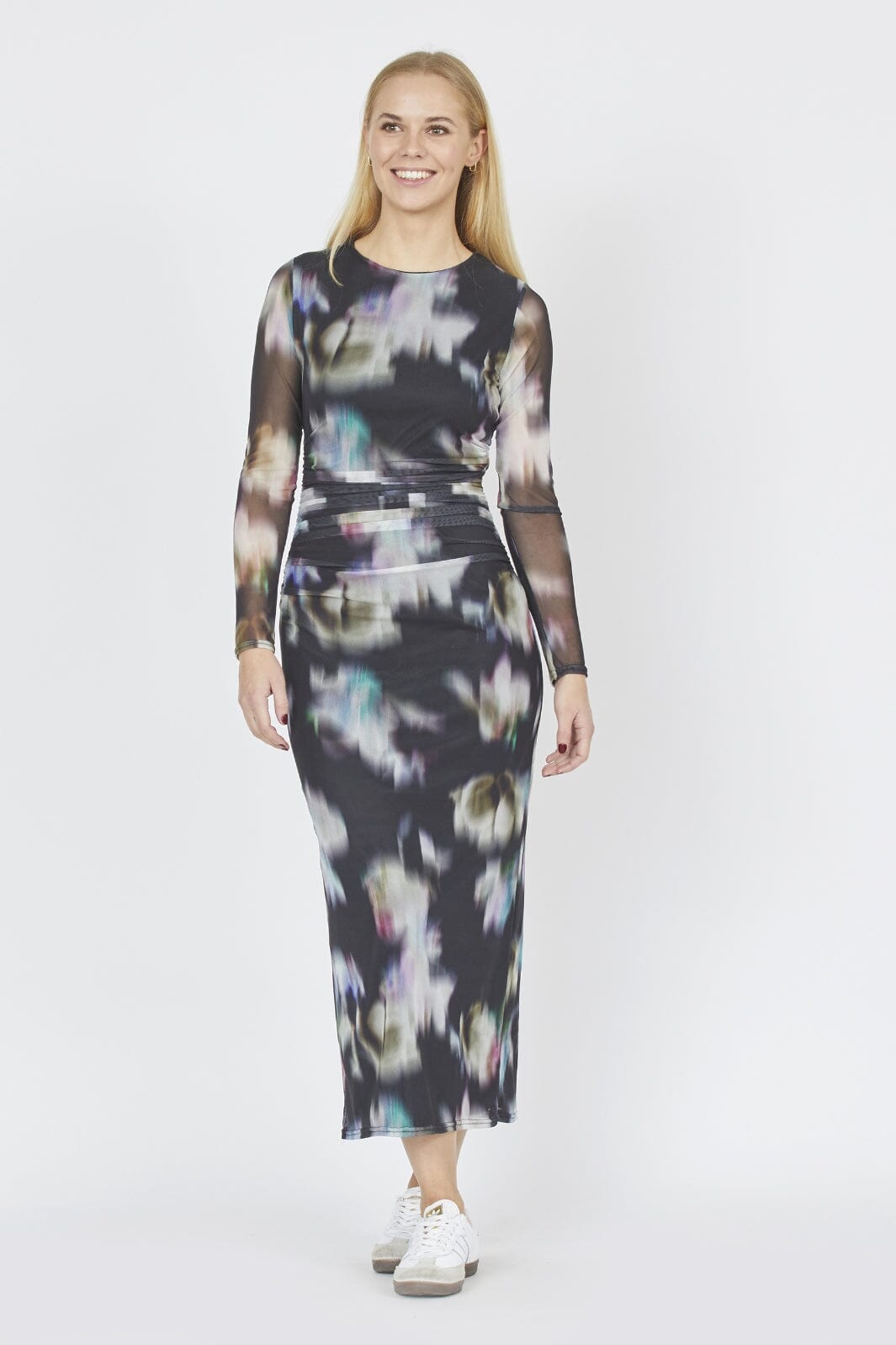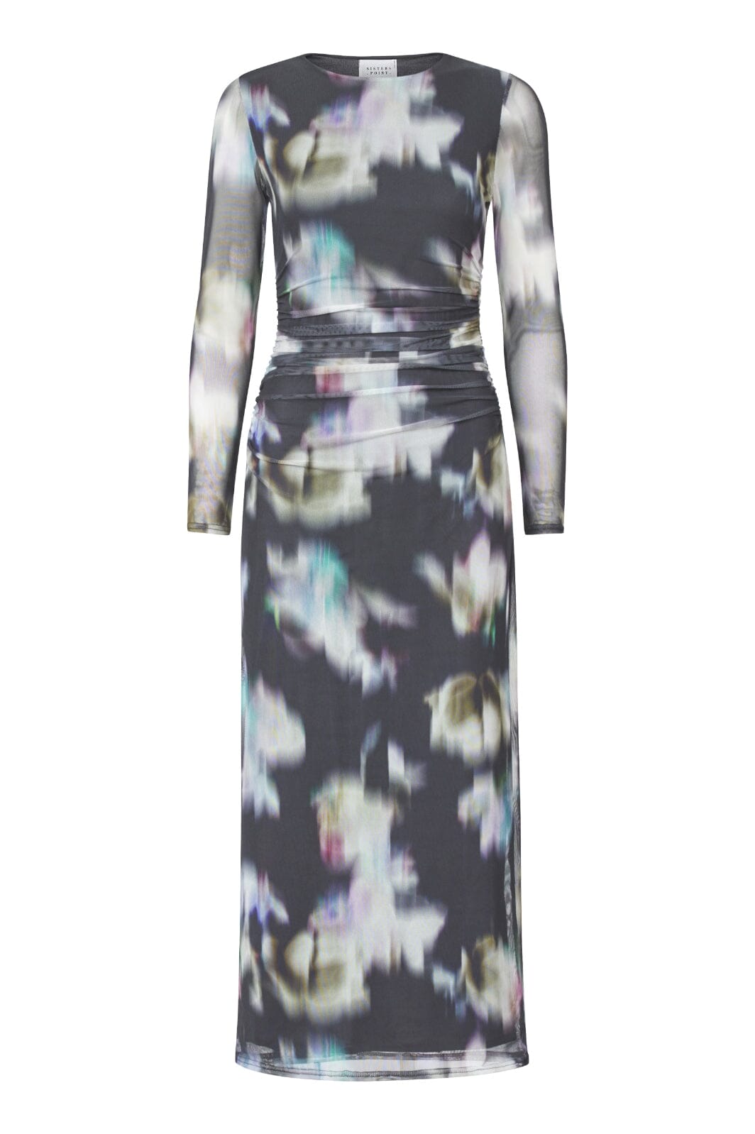 Długo rękawowa sukienka od Sisters Point z cyfrowym nadrukiem w stonowanych kolorach i kwiatowych wzorach. Sukienka ma detale marszczenia w talii i sięga do połowy łydki.