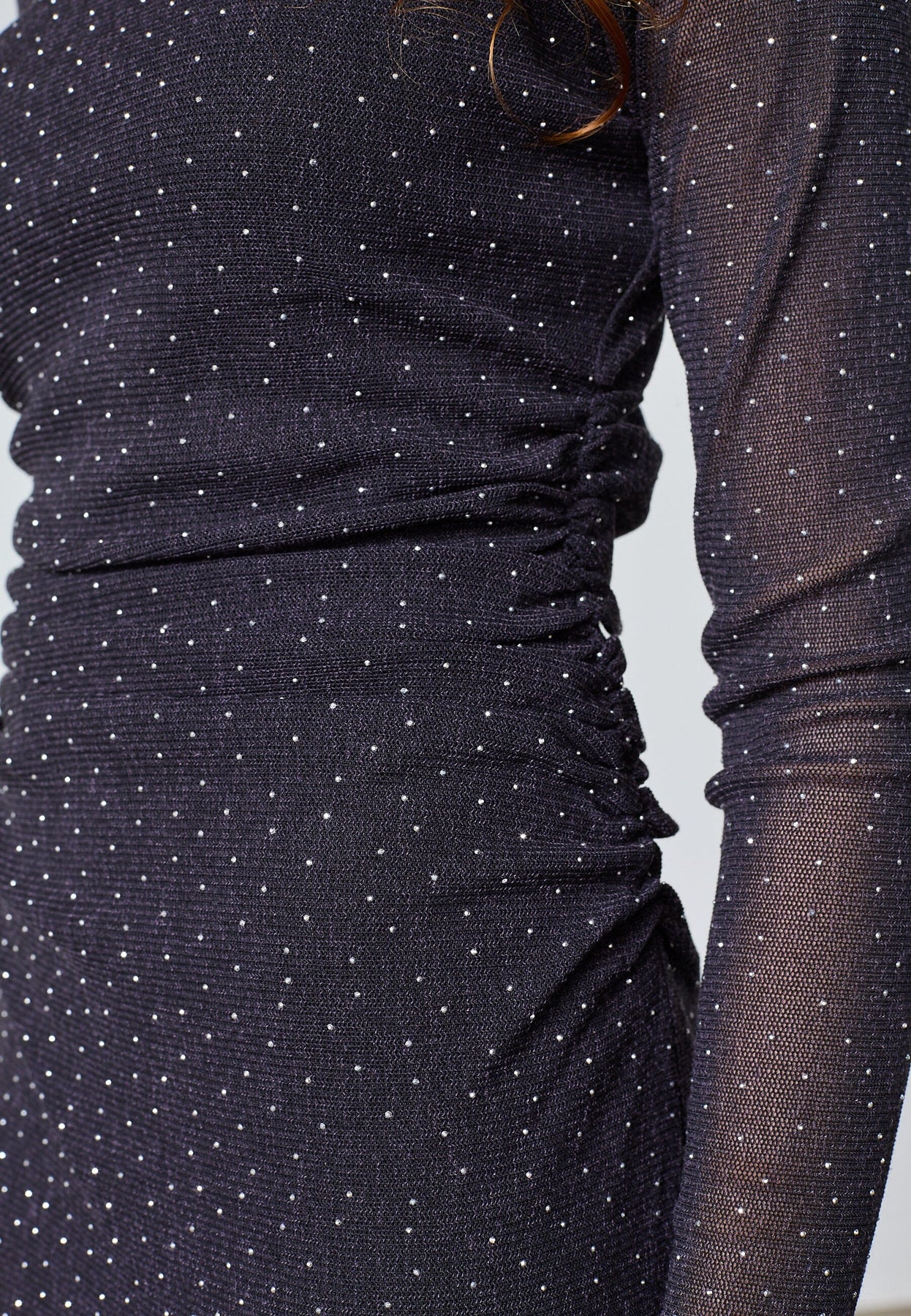 Czarna sukienka od Sisters Point z srebrnymi kropkami. Ma długie rękawy i okrągły dekolt. Sukienka sięga do połowy łydki i ma marszczenia po bokach.