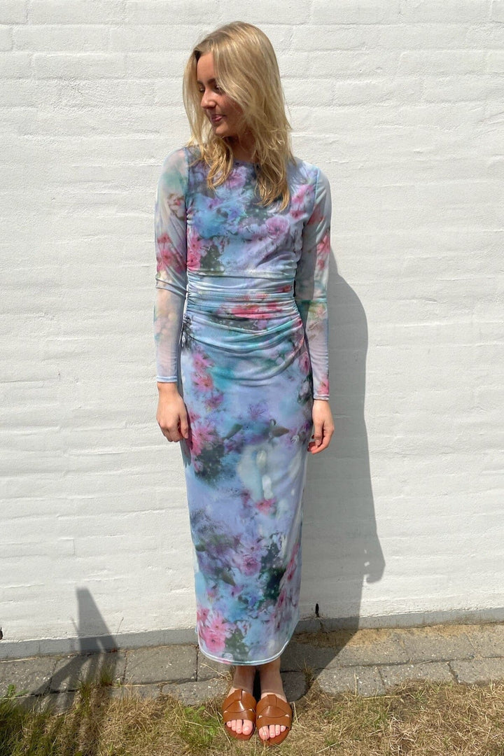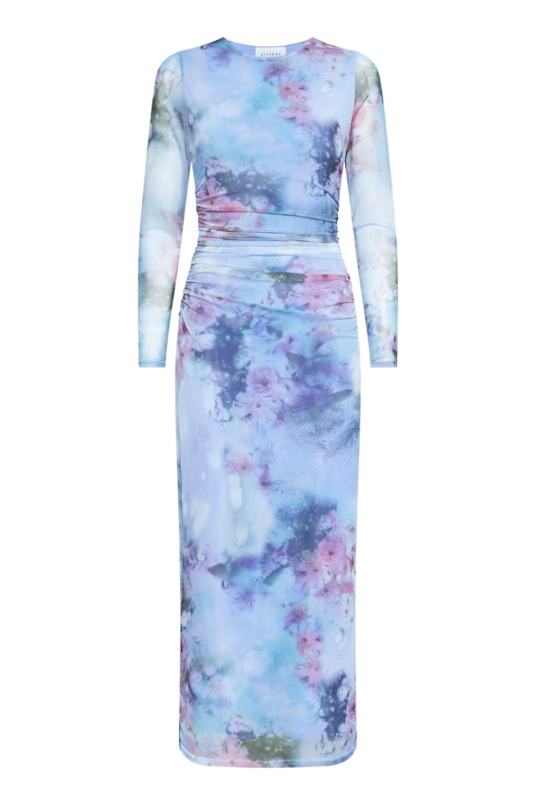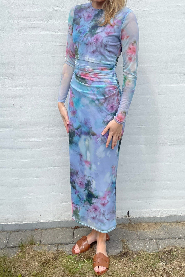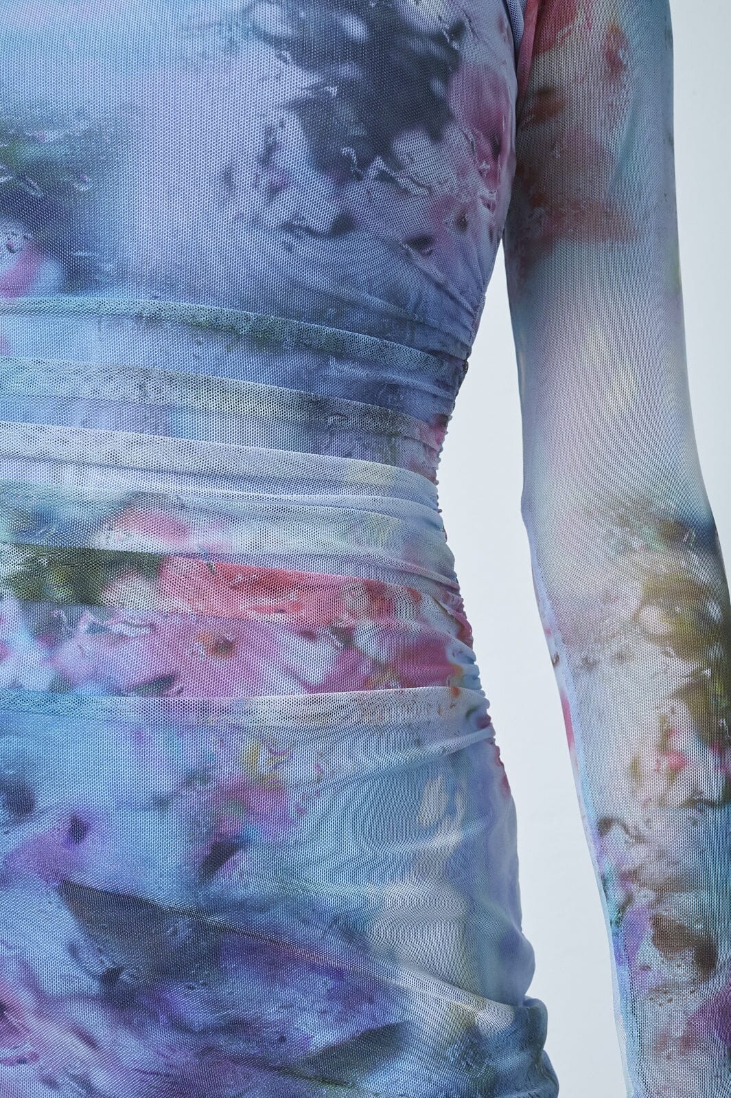 Sukienka z siateczki od Sisters Point z wzorem tie-dye w odcieniach niebieskiego, różowego i zielonego. Sukienka ma długie rękawy, okrągły dekolt i detale marszczenia w talii.