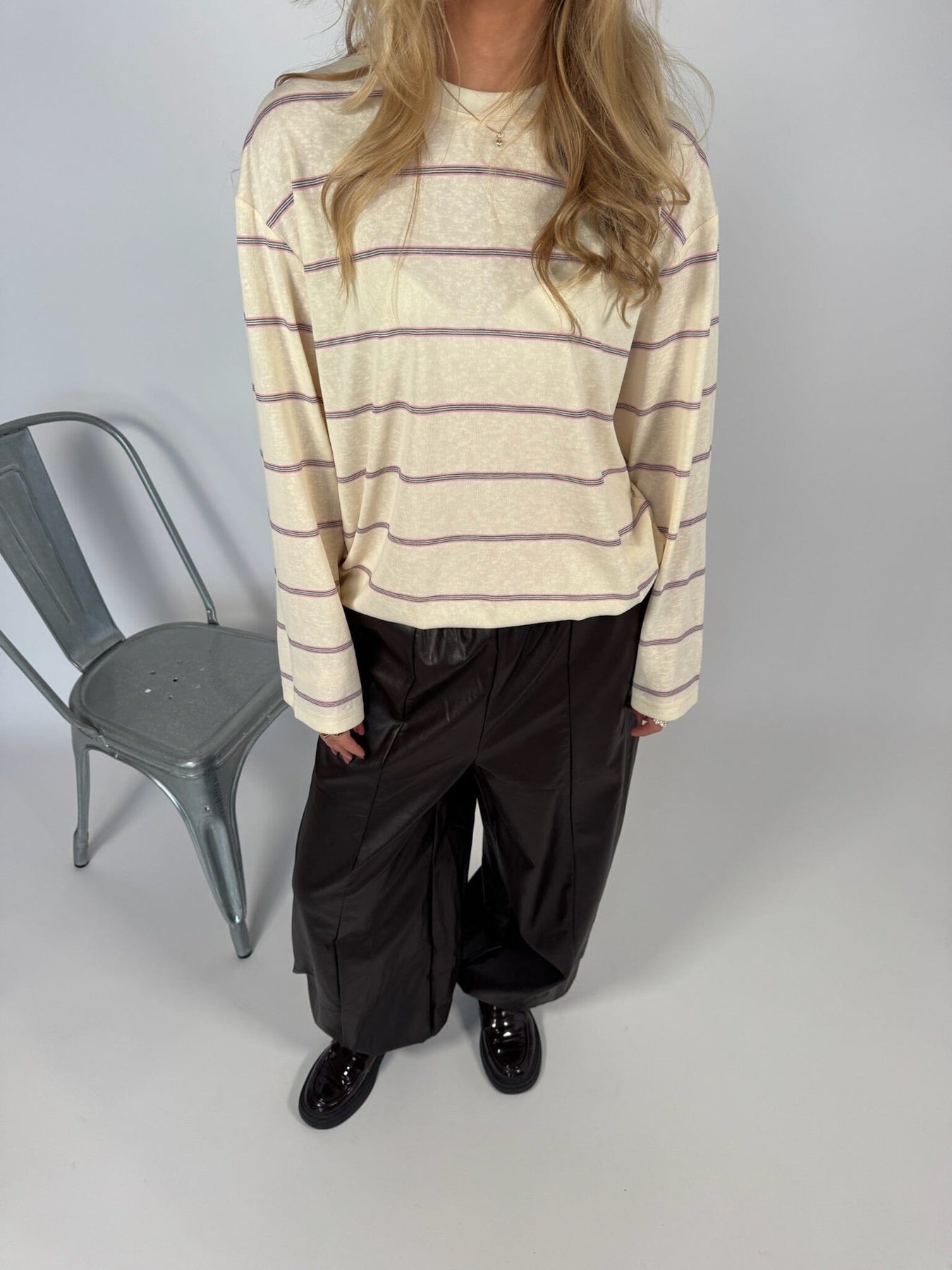 Kremowa bluzka w paski od Sisters Point. Bluzka ma swobodny krój z długimi rękawami i klasycznym okrągłym dekoltem.