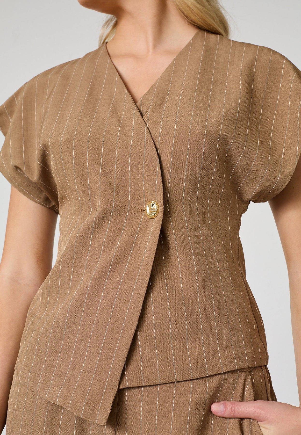 Bluzka od Sisters Point w beżowym kolorze z cienkimi, pionowymi paskami pinstripe. Bluzka ma krótkie, szerokie rękawy oraz efekt kopertowy ze złotym guzikiem.