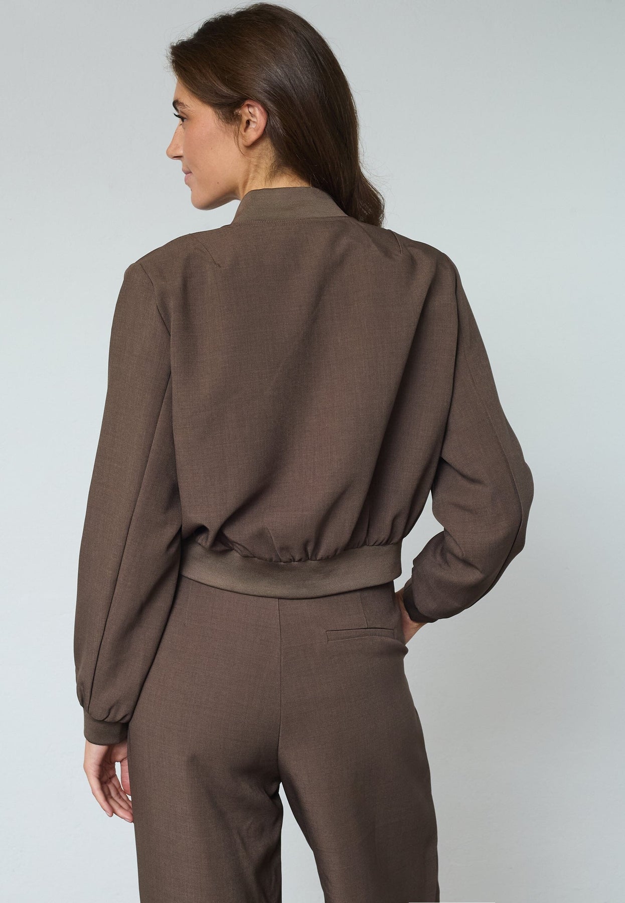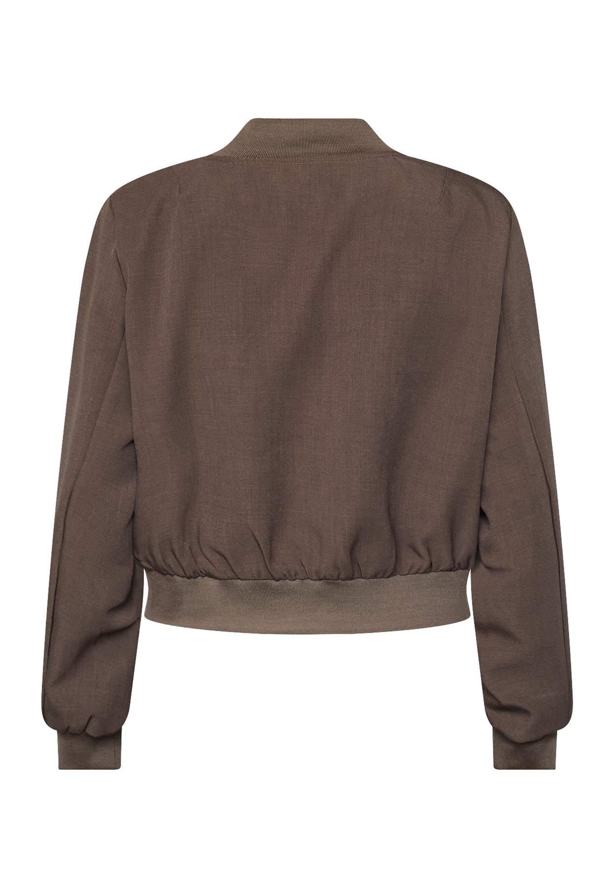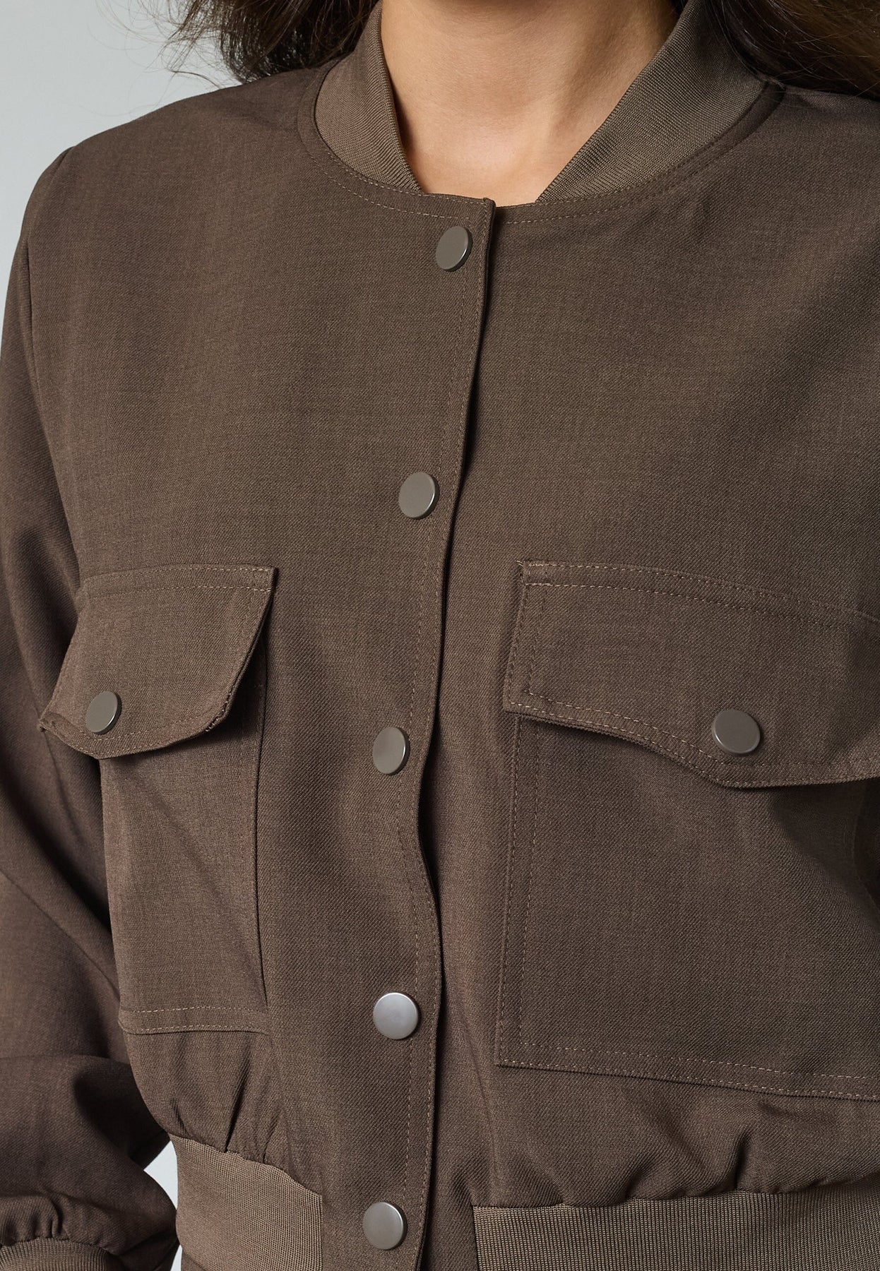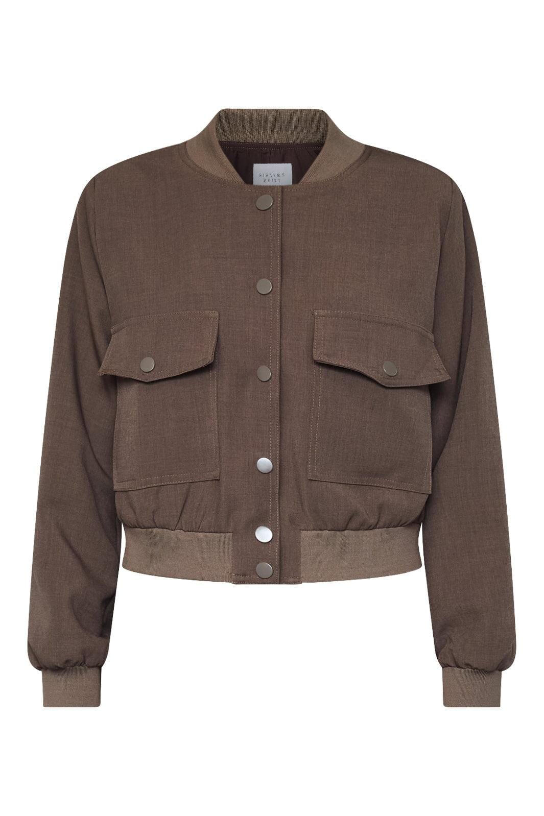 Krótka kurtka marki Sisters Point w brązowym odcieniu. Kurtka ma dekoracyjne przeszycia, zatrzaski na środku z przodu oraz dwie kieszenie na piersi z klapami.