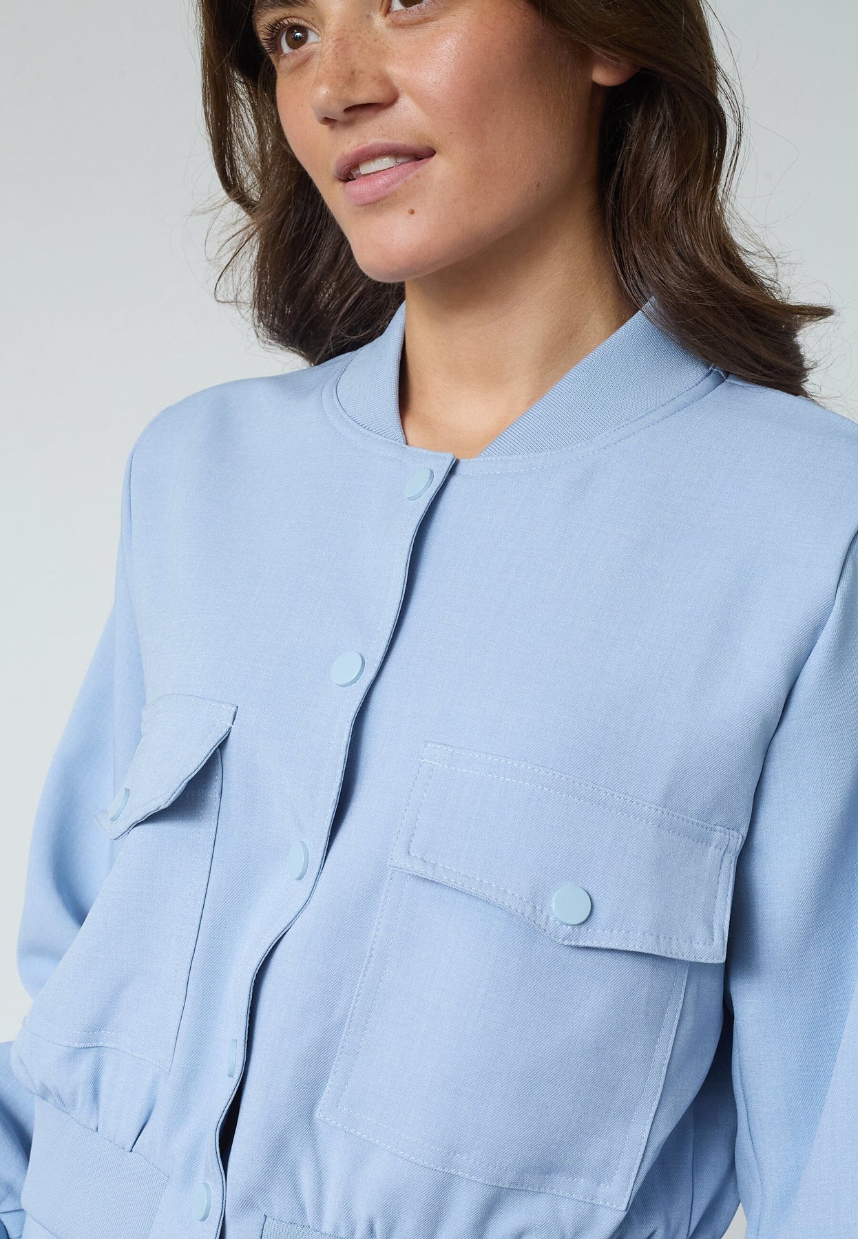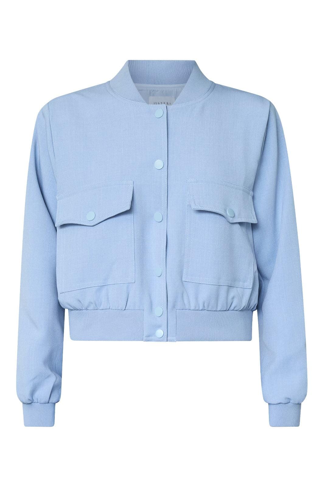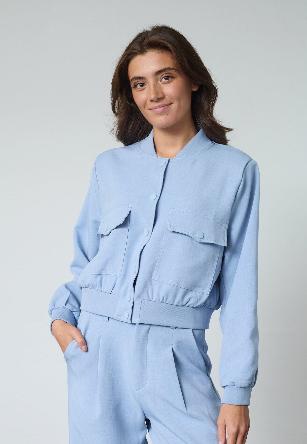 Jasnoniebieska kurtka od Sisters Point, wykonana z poliestru z dodatkiem elastanu. Kurtka ma krótkie krojenie i nadaje się na swobodne okazje.