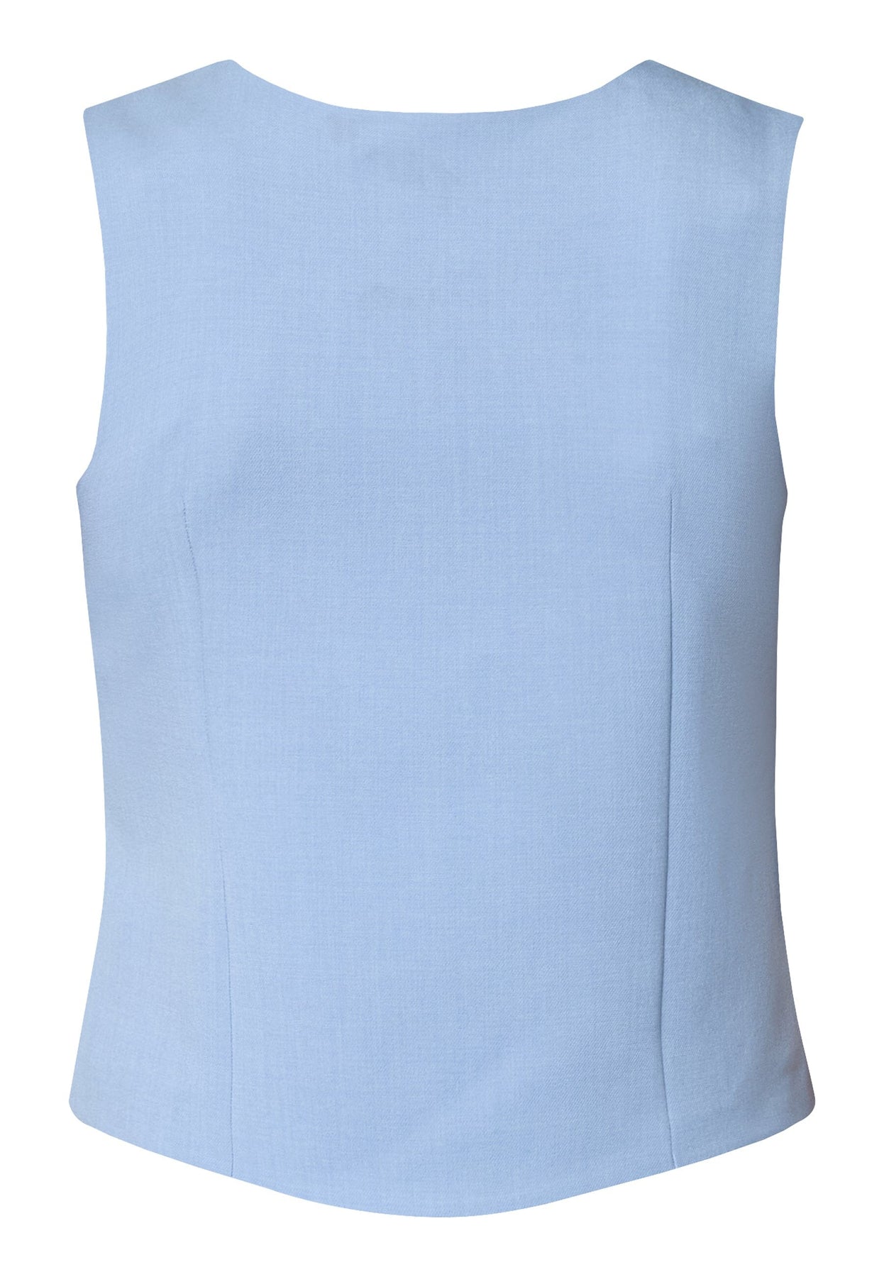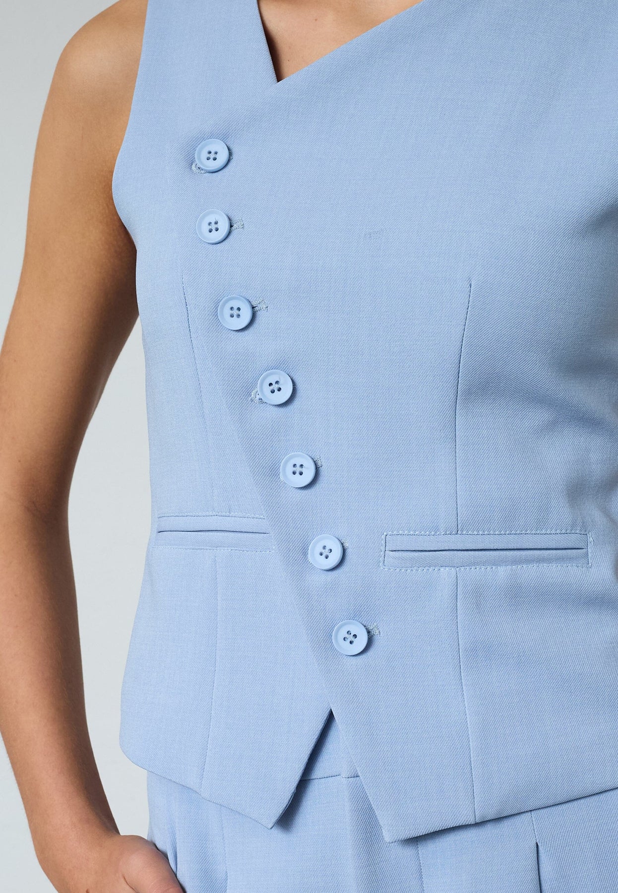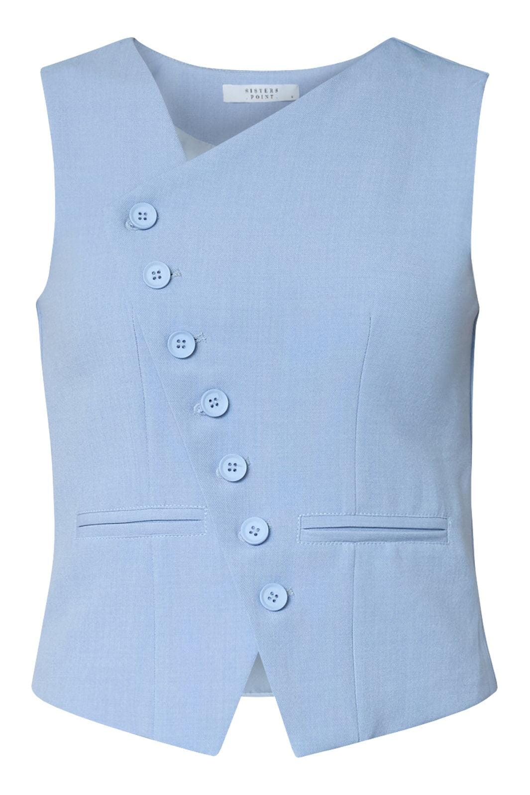 Jasnoniebieska kamizelka od Sisters Point z asymetrycznym zapięciem na guziki i dekoltem w kształcie litery V. Kamizelka ma sześć guzików z przodu oraz dwie dekoracyjne kieszenie.