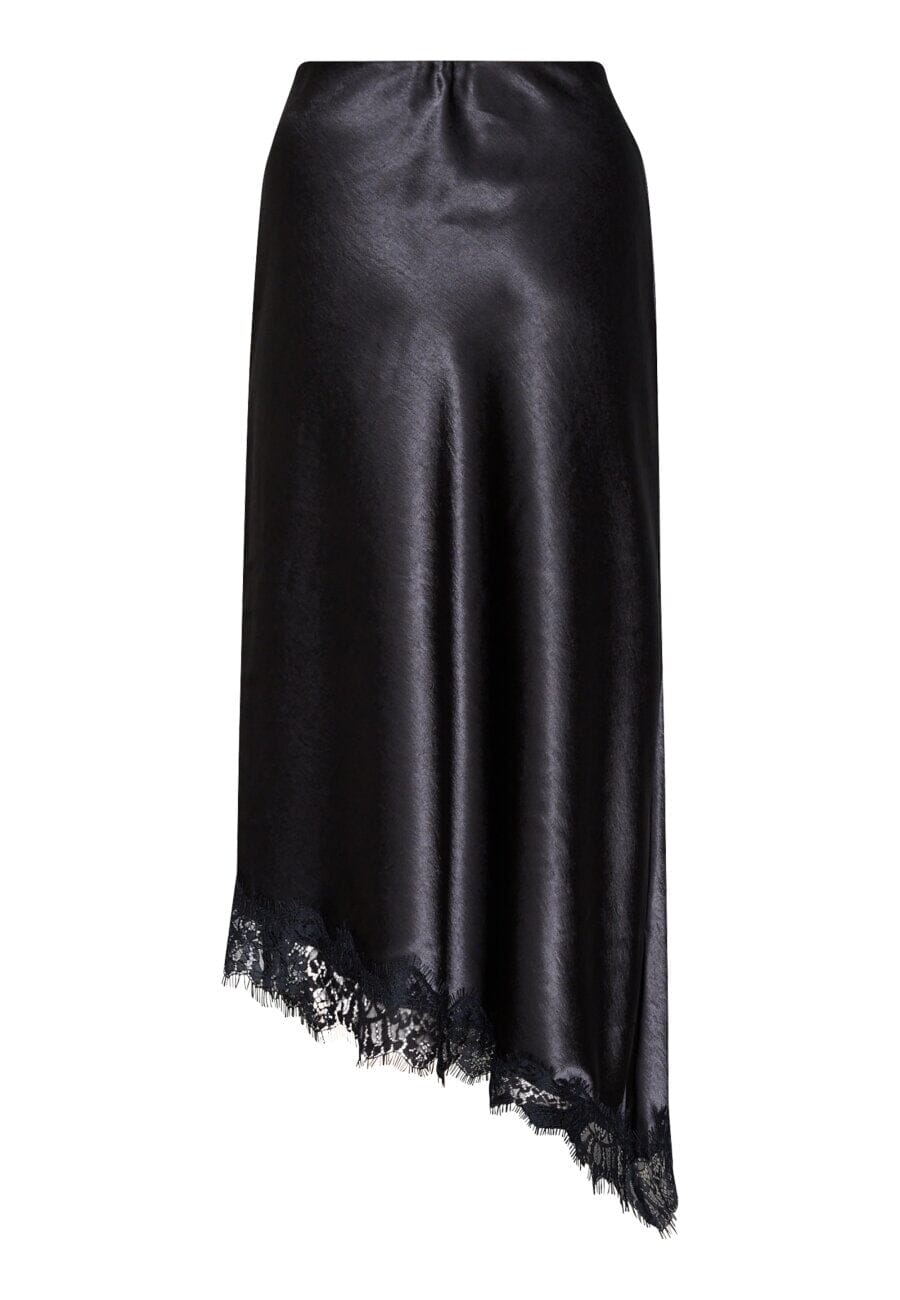 Czarna spódnica Sisters Point z połyskującym, satynowym wykończeniem z tkanego poliestru. Spódnica ma asymetryczny krój z ukośnym brzegiem ozdobionym koronką.