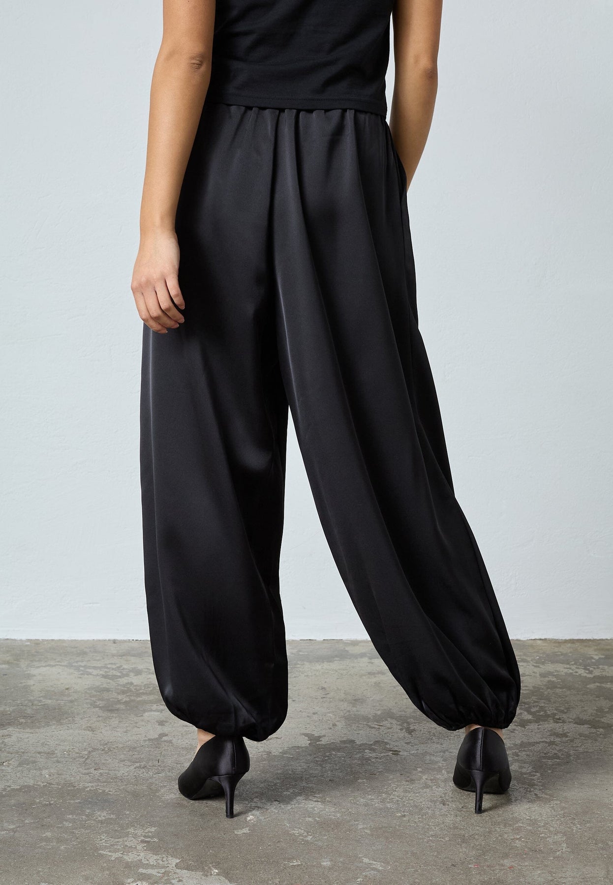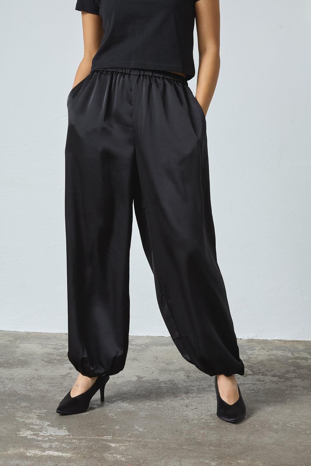 Czarne spodnie od Sisters Point, wykonane w 100% z poliestru o gładkiej, błyszczącej powierzchni. Spodnie mają luźny krój i elastyczny pas.