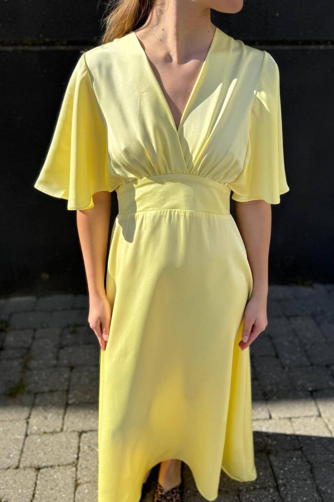 Jasnożółta sukienka od Sisters Point z detalami smock na plecach. Sukienka ma głęboki dekolt w kształcie V i luźne rękawy z falbanami. Detale smock zapewniają dobre dopasowanie w talii.