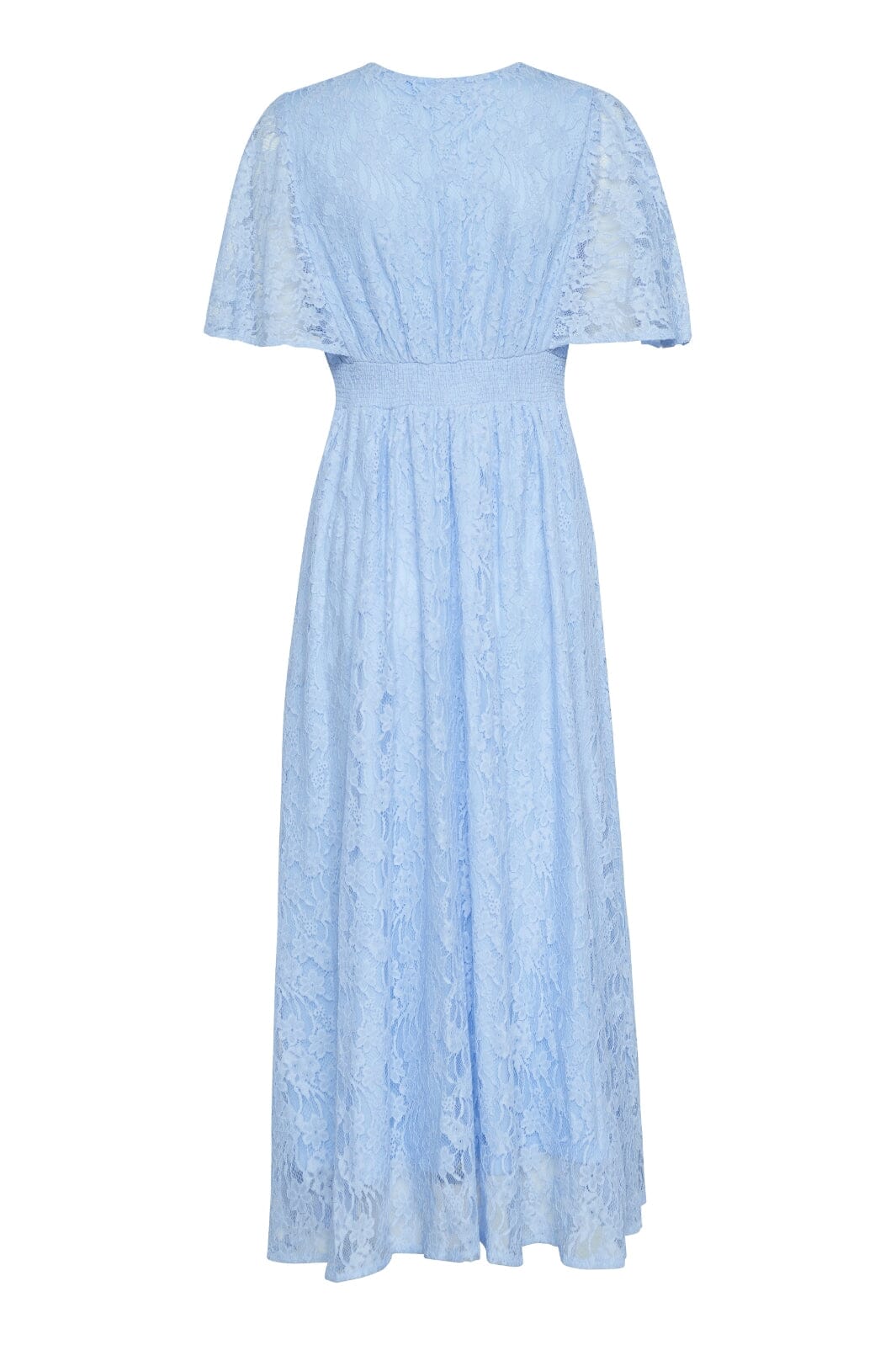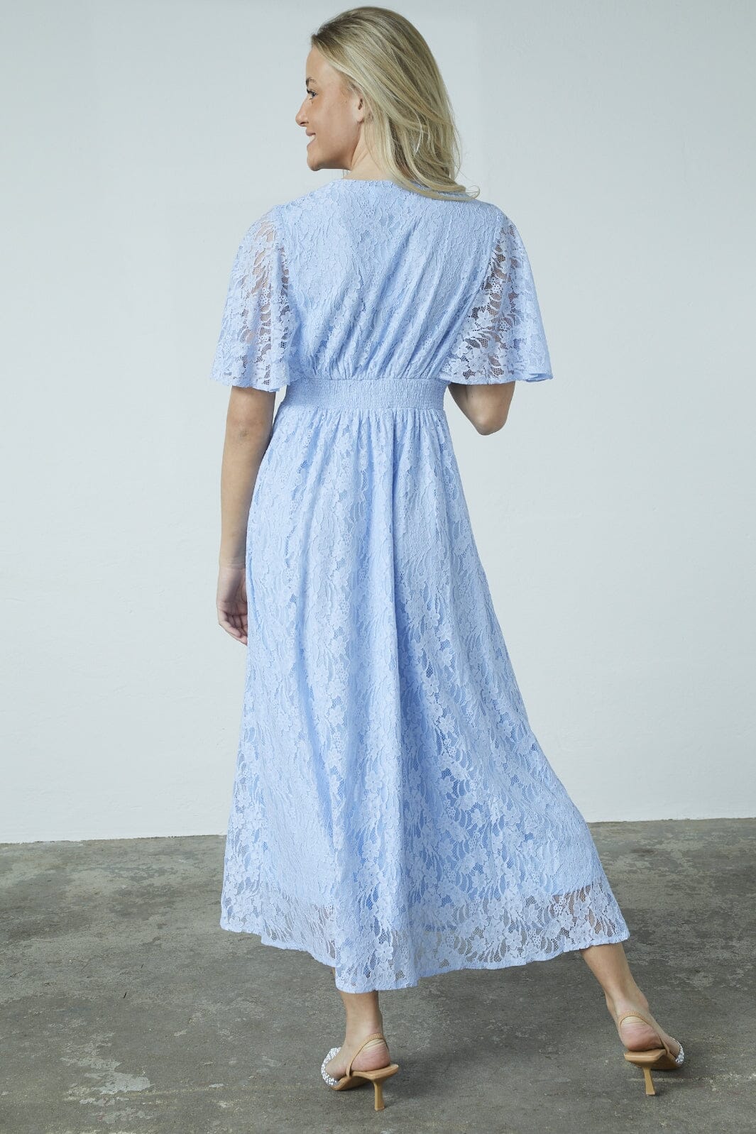 Jasnoniebieska sukienka koronkowa od Sisters Point z dekoltem w kształcie V. Sukienka ma krótkie rękawy z falbankami i kwiatowy wzór koronkowy na całym materiale.