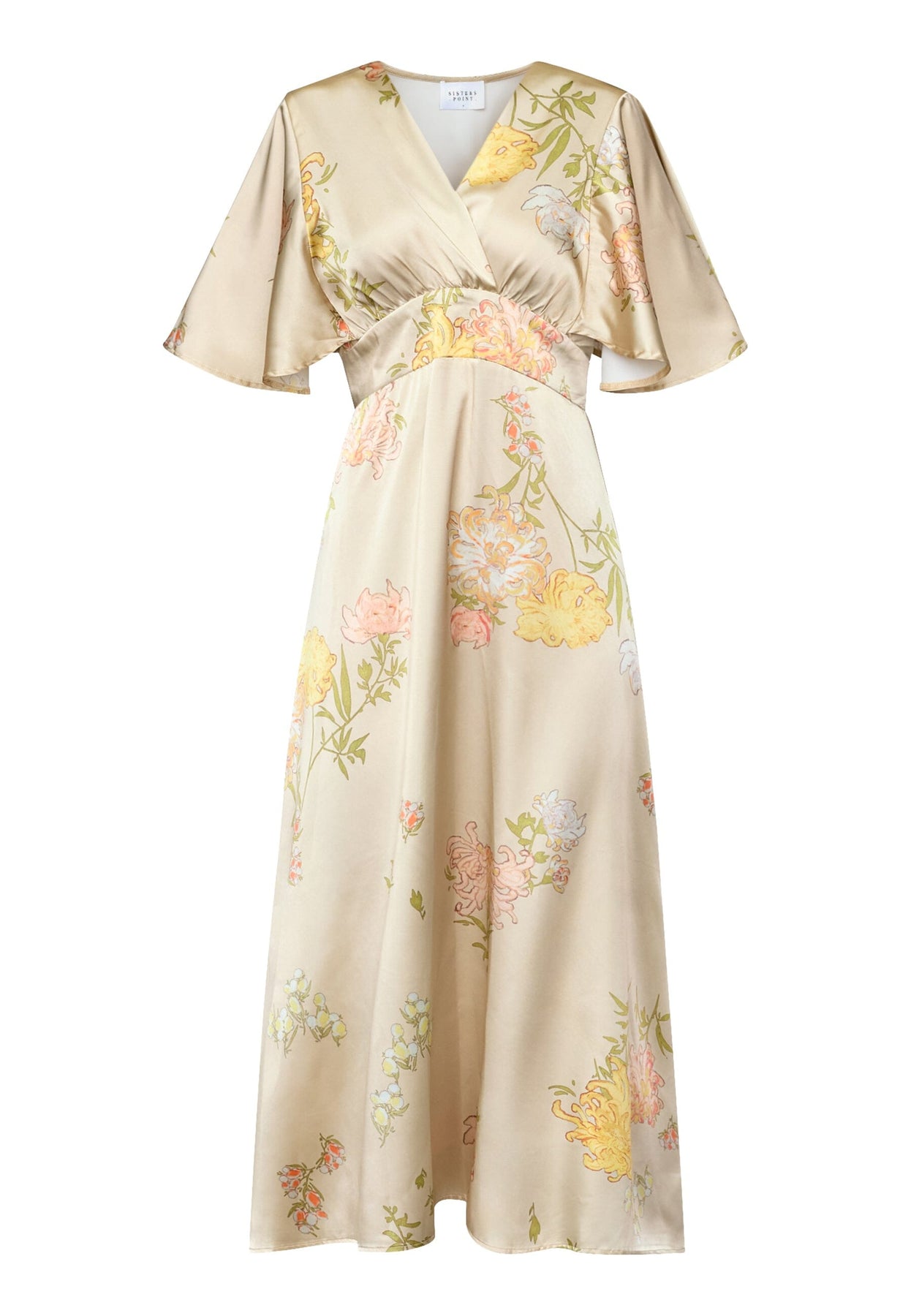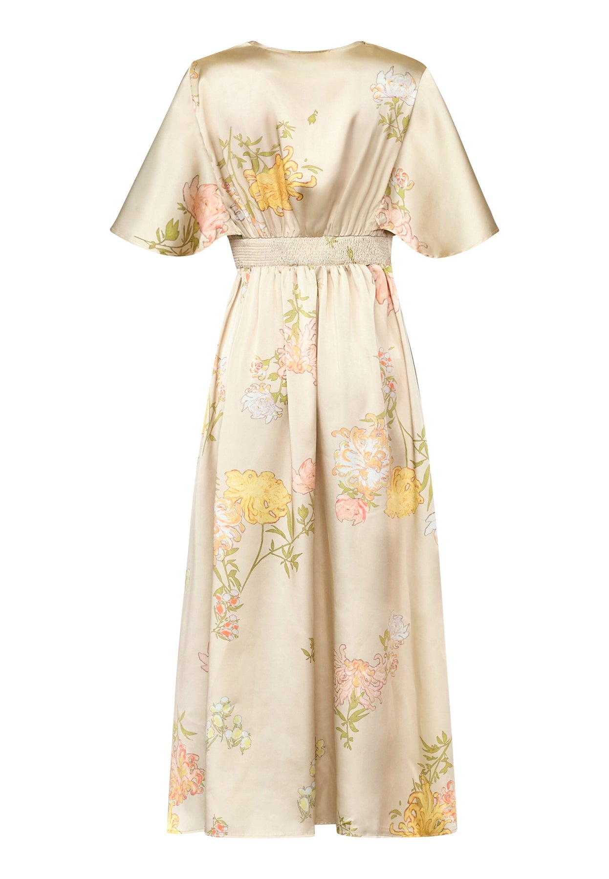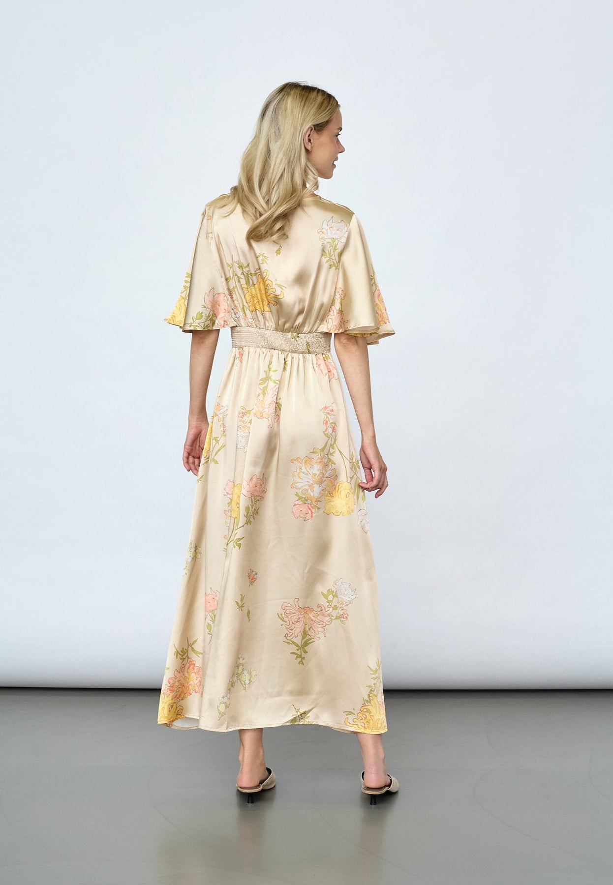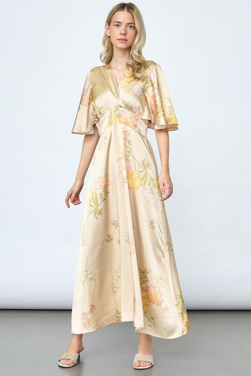 Sukienka Sisters Point z jasnobeżowego poliestru w kolorze słomy z kwiatowym wzorem w odcieniach różu, żółtego i zielonego. Sukienka ma falbany i dekolt w kształcie litery V.