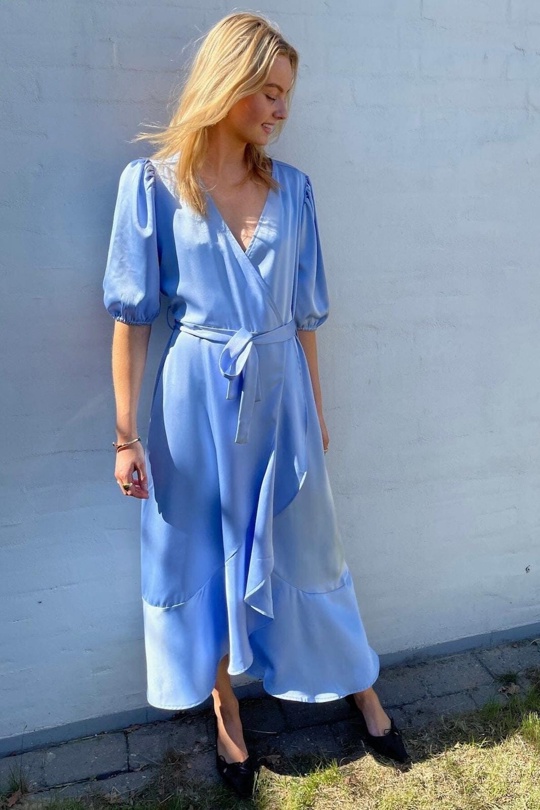 Jasnoniebieska sukienka od Sisters Point w miękkiej jakości. Sukienka ma projekt kopertowy z paskiem i bufiastymi rękawami, które nadają ładną sylwetkę. Warstwowy dół dodaje dodatkową warstwę do projektu.