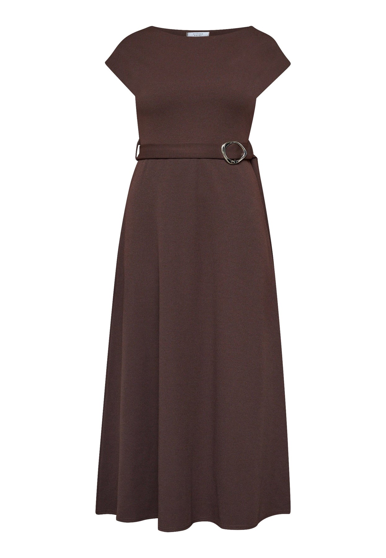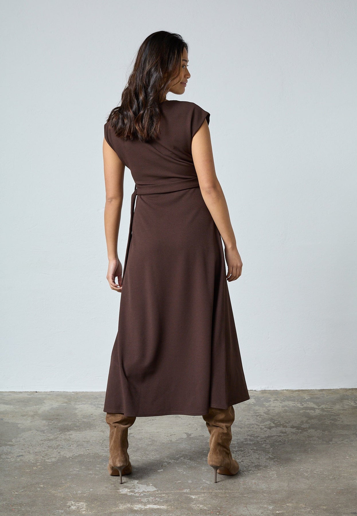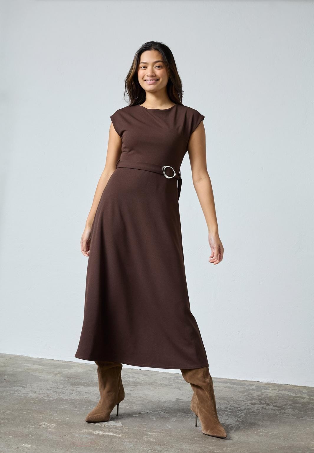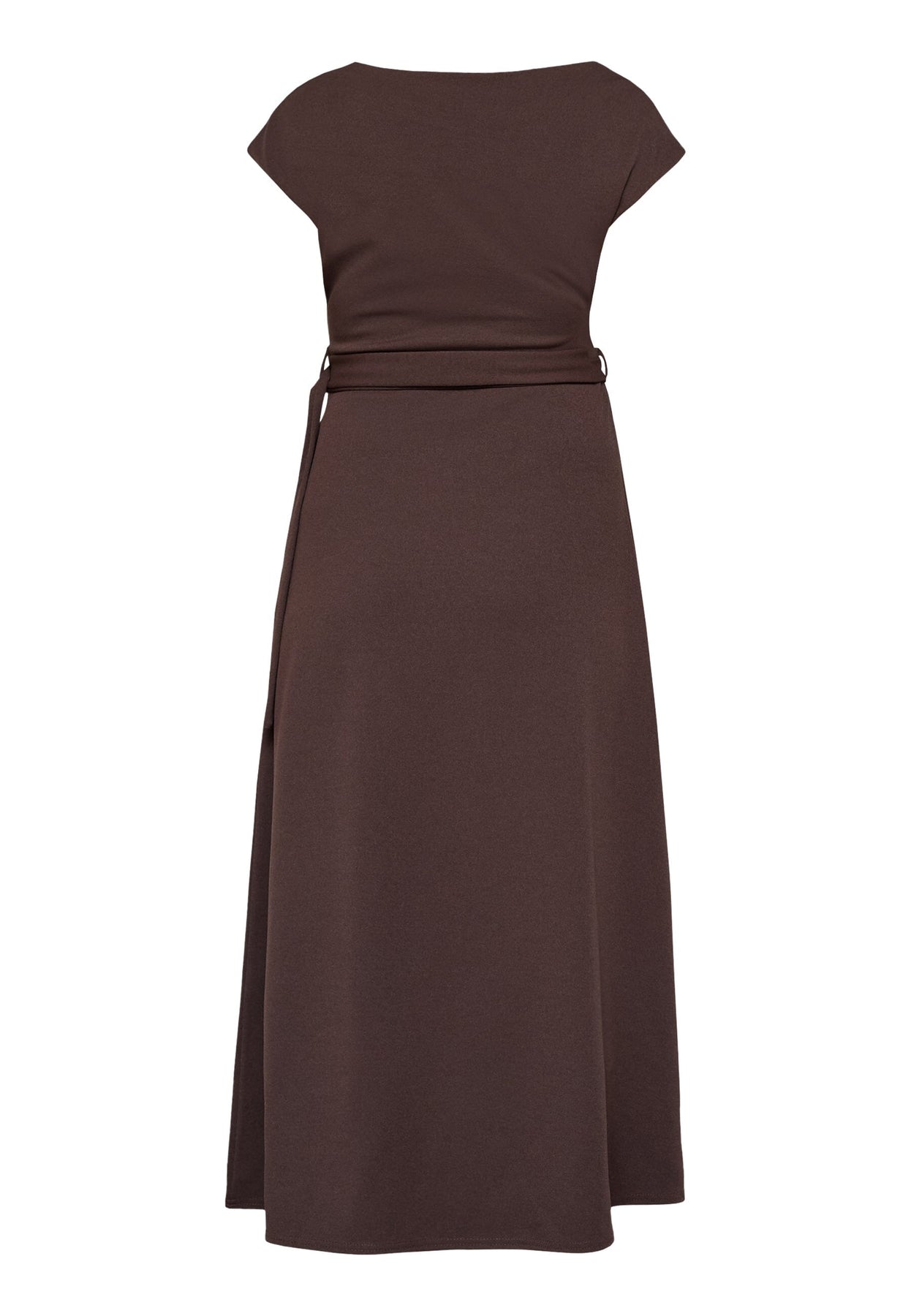 Sukienka o średniej długości od Sisters Point w głębokim czekoladowobrązowym kolorze. Sukienka wykonana jest z gładkiego poliestru, który ciężko się układa i nadaje sylwetce wyraźną strukturę.