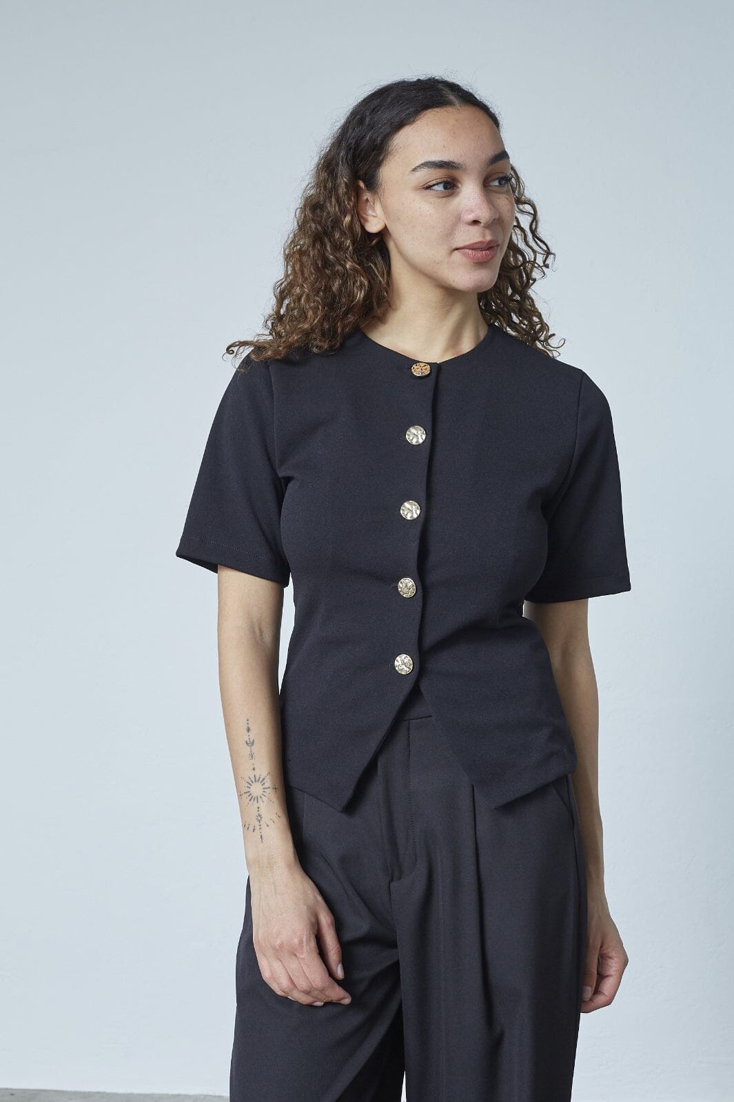 Czarny top od Sisters Point o dopasowanym kroju. Top ma krótkie rękawy i okrągły dekolt oraz dekoracyjne guziki z przodu i lekki rozporek na dole.