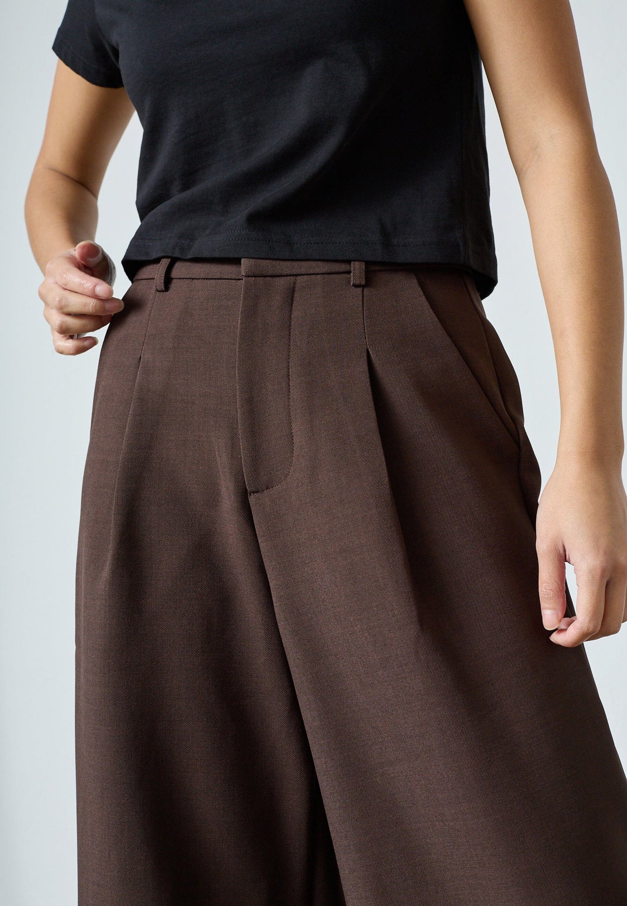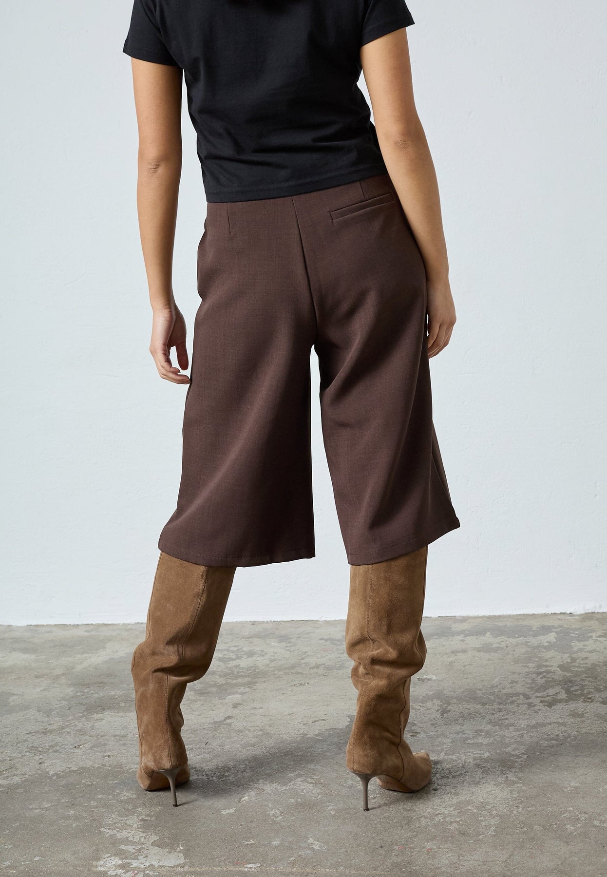 Czekoladowobrązowe szorty marki Sisters Point, wykonane w 92% z poliestru i w 8% z elastanu. Szorty mają luźny krój i sięgają tuż przed kolano.