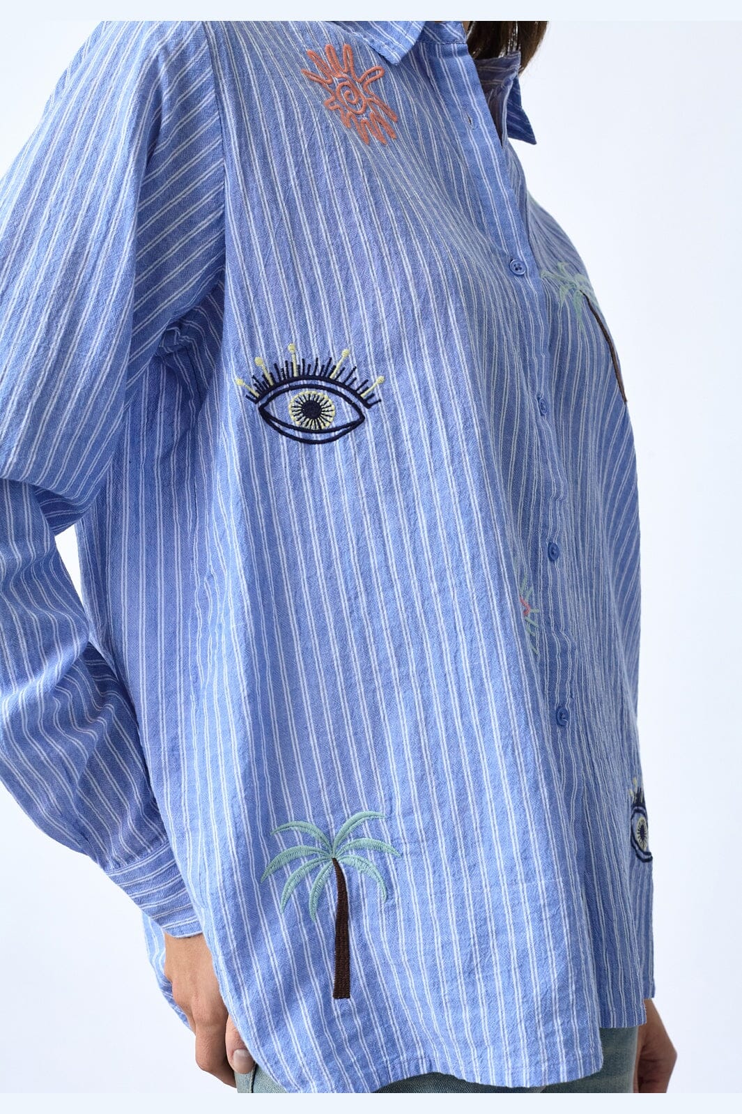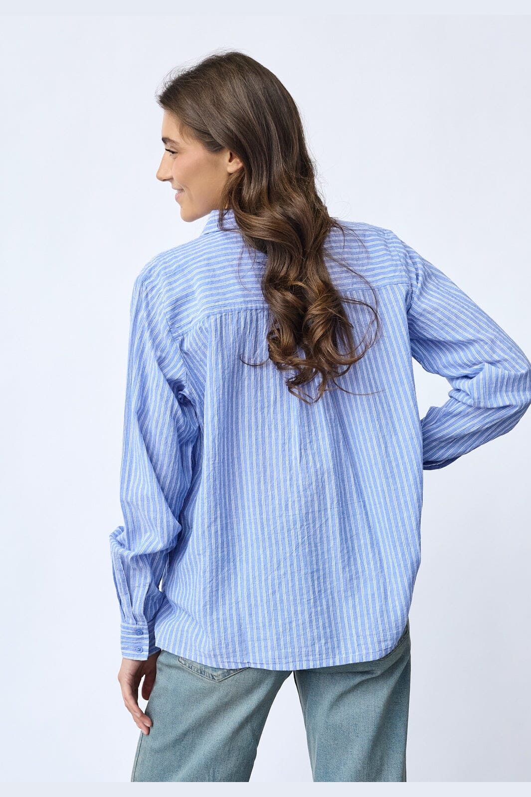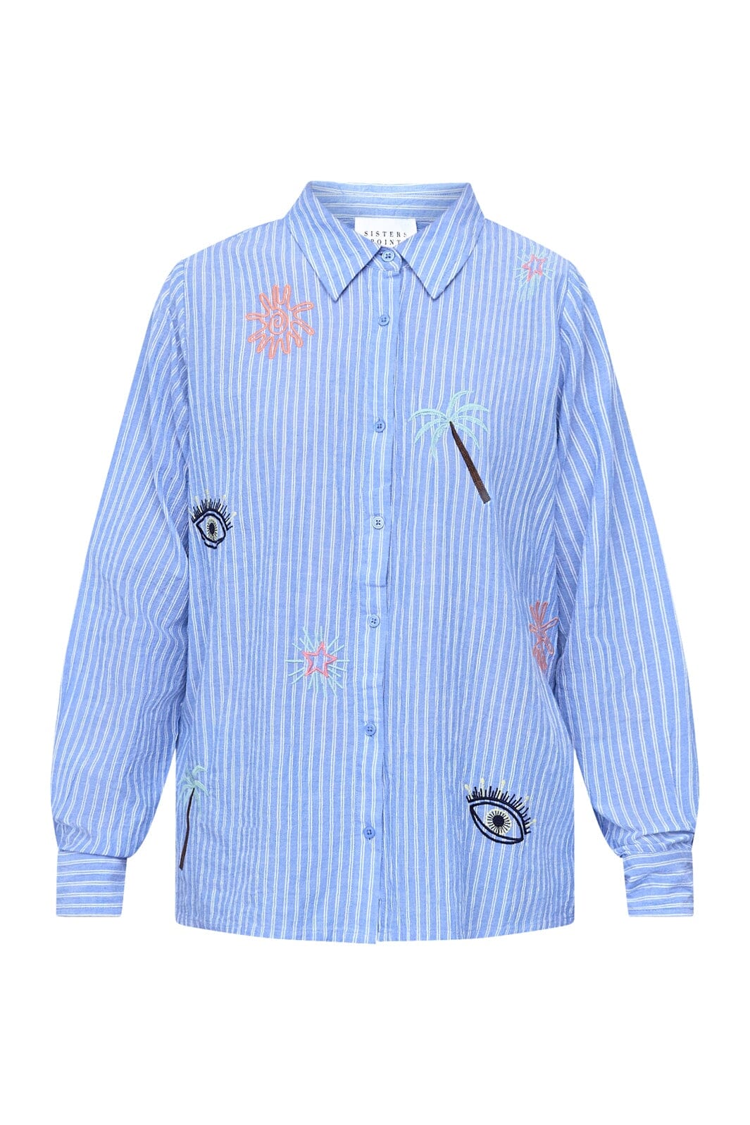 Koszula Sisters Point w niebieskie i białe paski. Koszula ma haft oraz luźny krój.