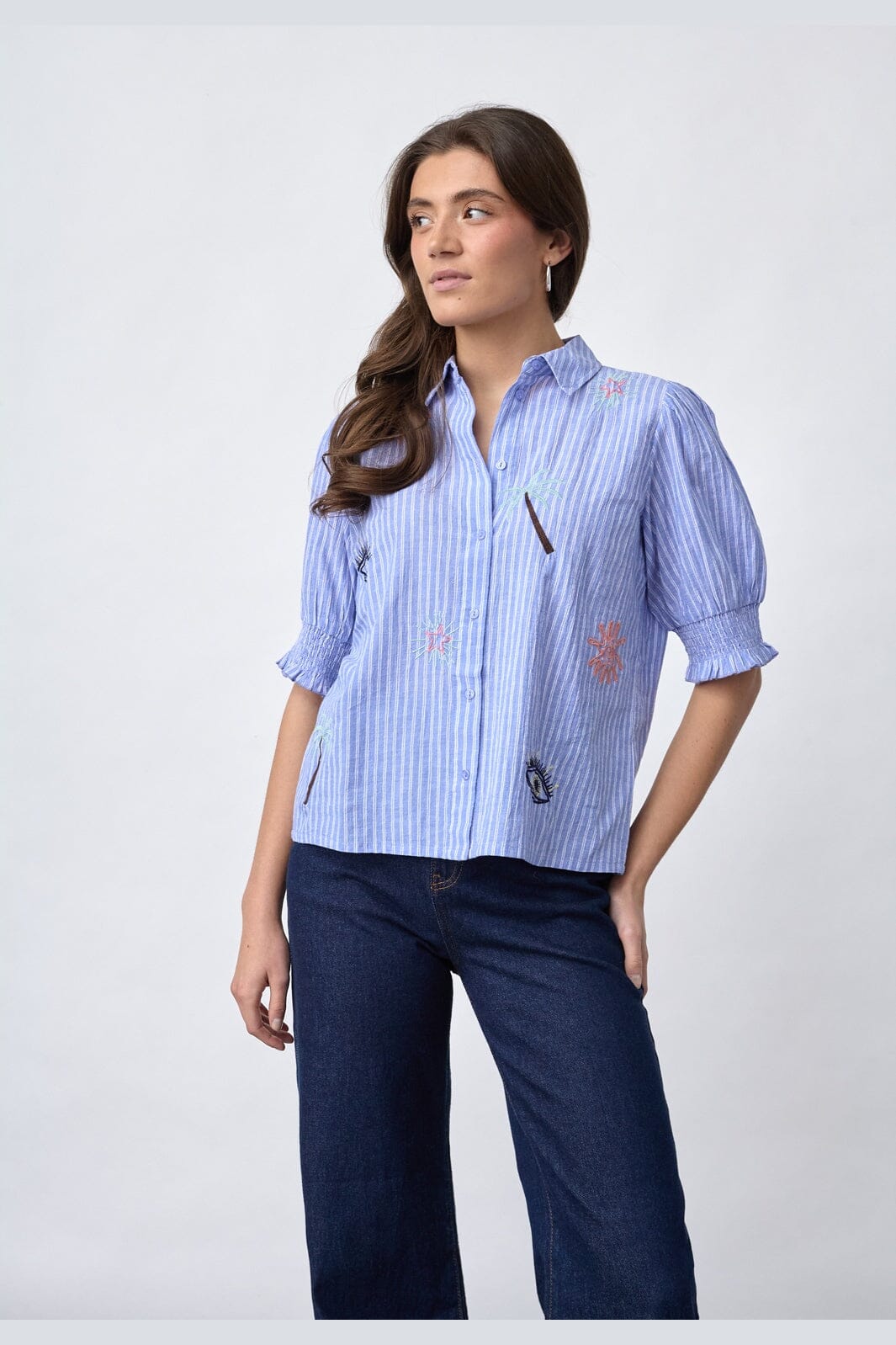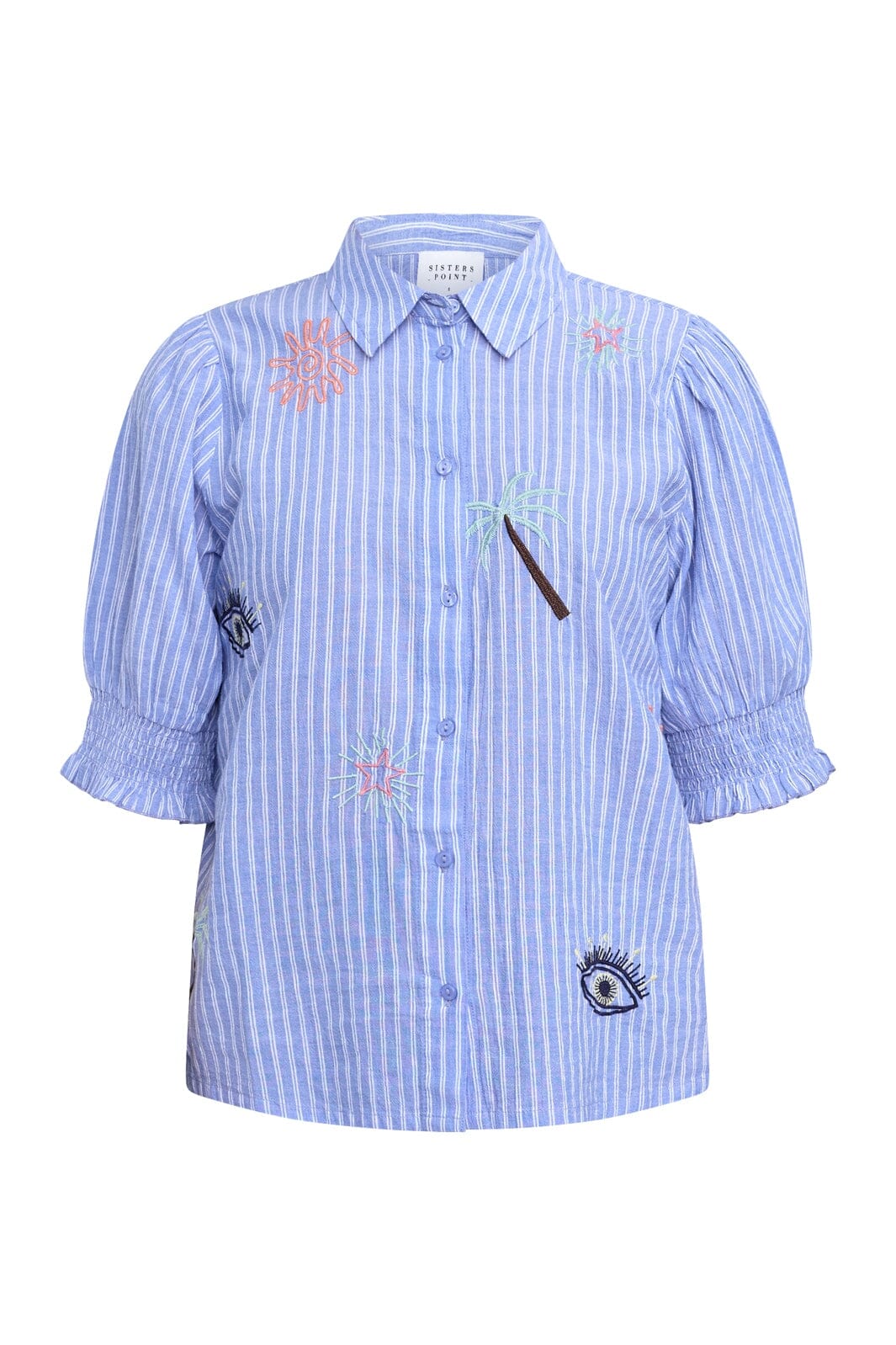 Prążkowana koszula od Sisters Point w niebieskie i białe paski. Z przodu ma haftowane motywy palm i słońc.