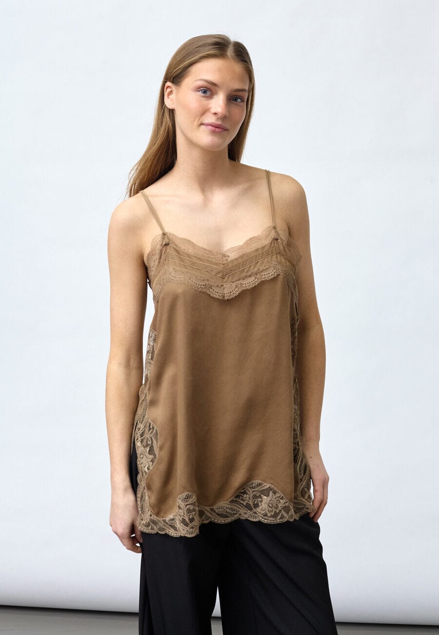 Brązowy top marki Sisters Point z dekoltem w kształcie litery V i koronkowymi wykończeniami. Top ma cienkie ramiączka i luźny krój, który zakrywa biodra.