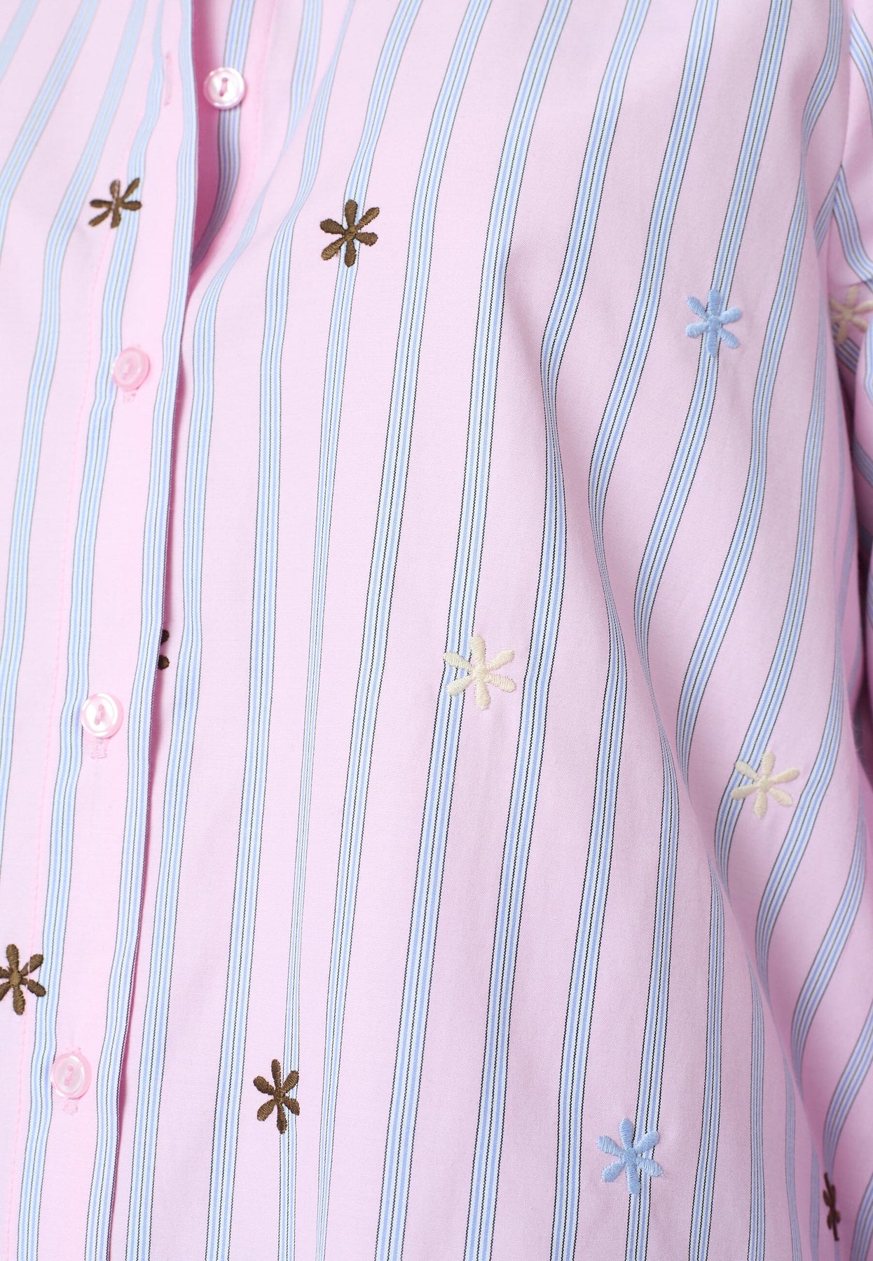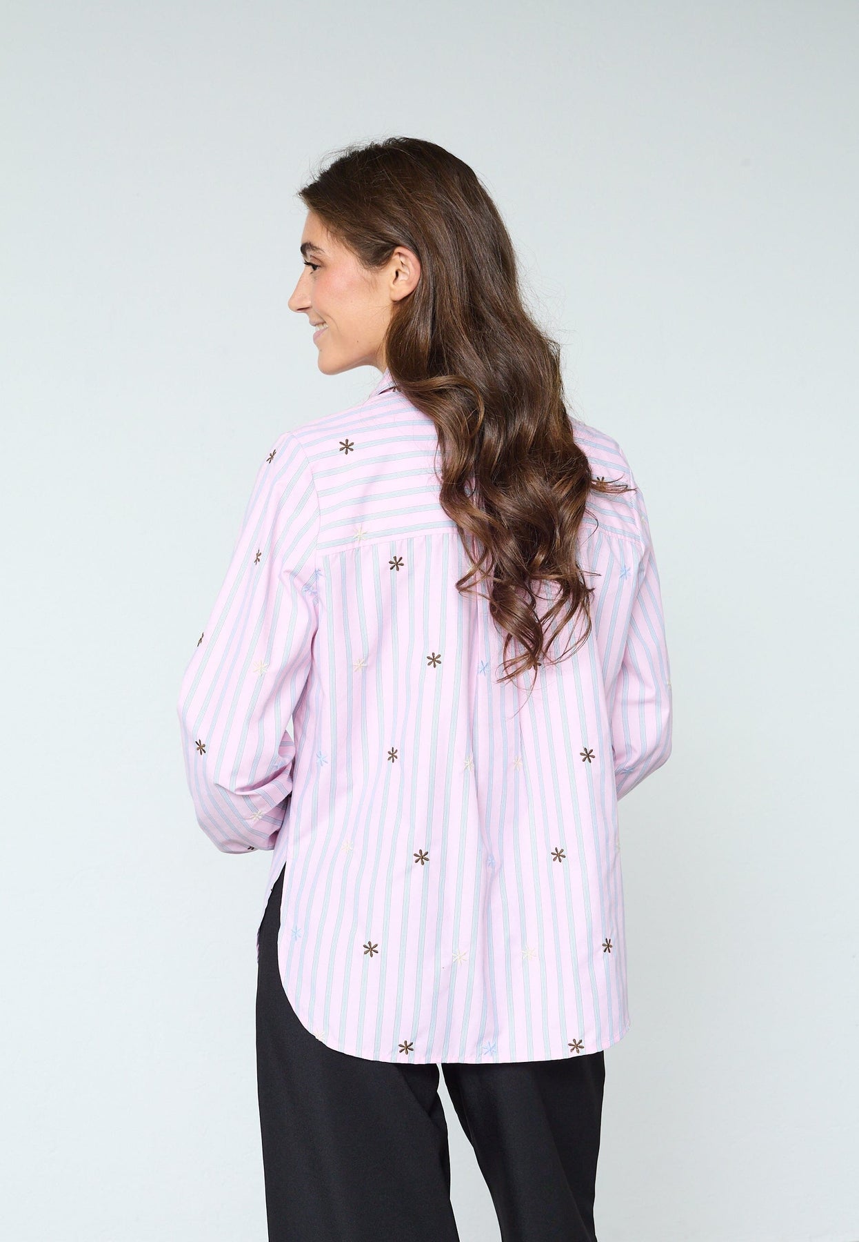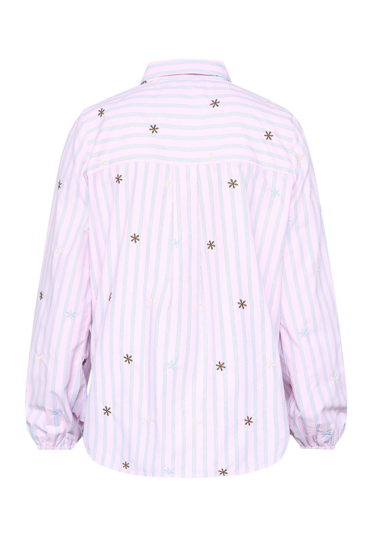 Prążkowana koszula od Sisters Point z haftowanymi kwiatowymi detalami. Koszula ma jasnoniebieskie i jasnoróżowe paski na białym tle.