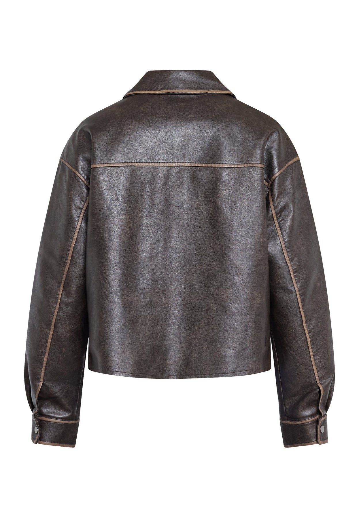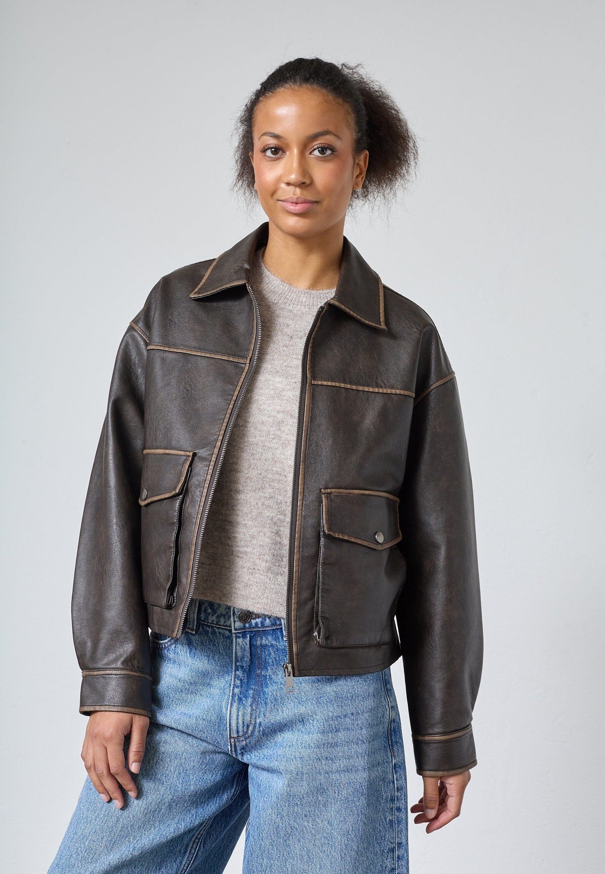 Brązowa kurtka z imitacji skóry od Sisters Point. Kurtka ma kołnierz i zapięcie na zamek z przodu oraz wyraźnie podkreślone szwy wzdłuż krawędzi.