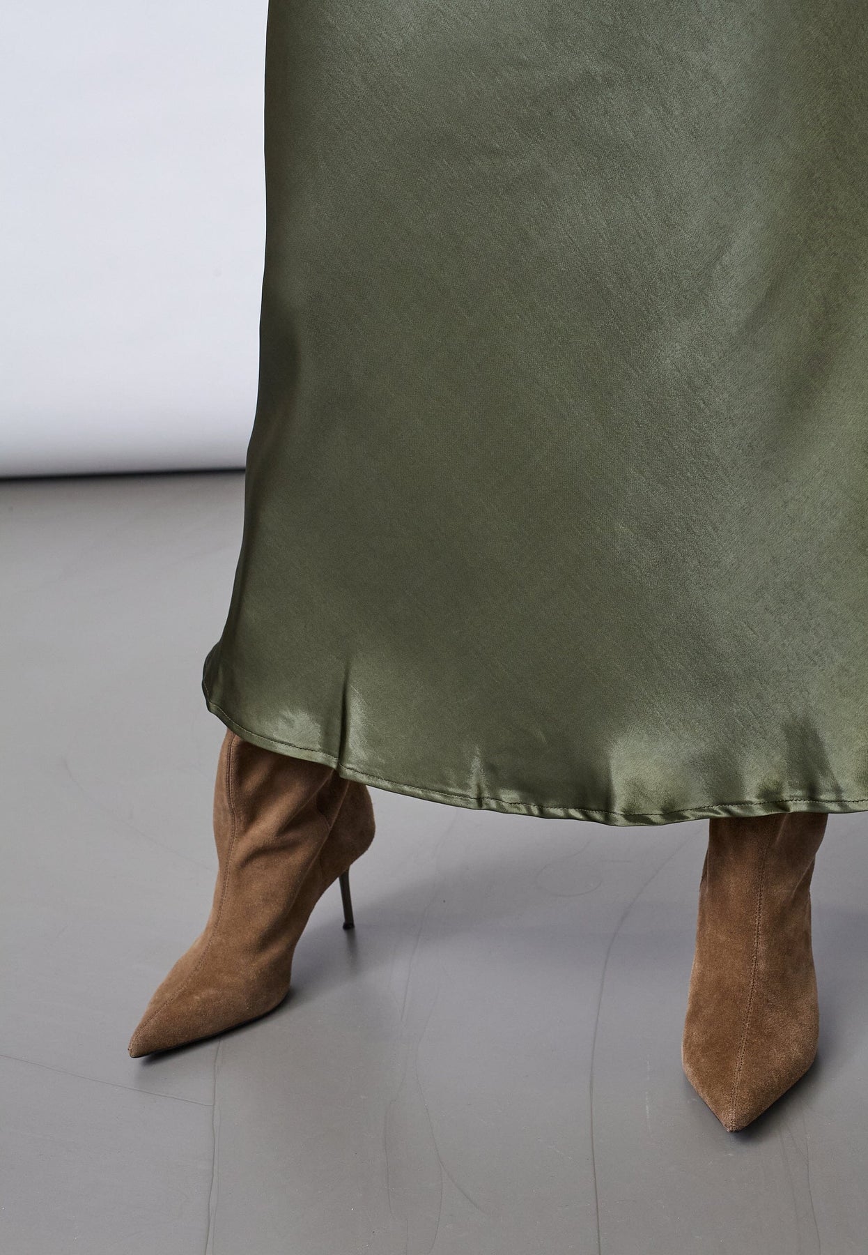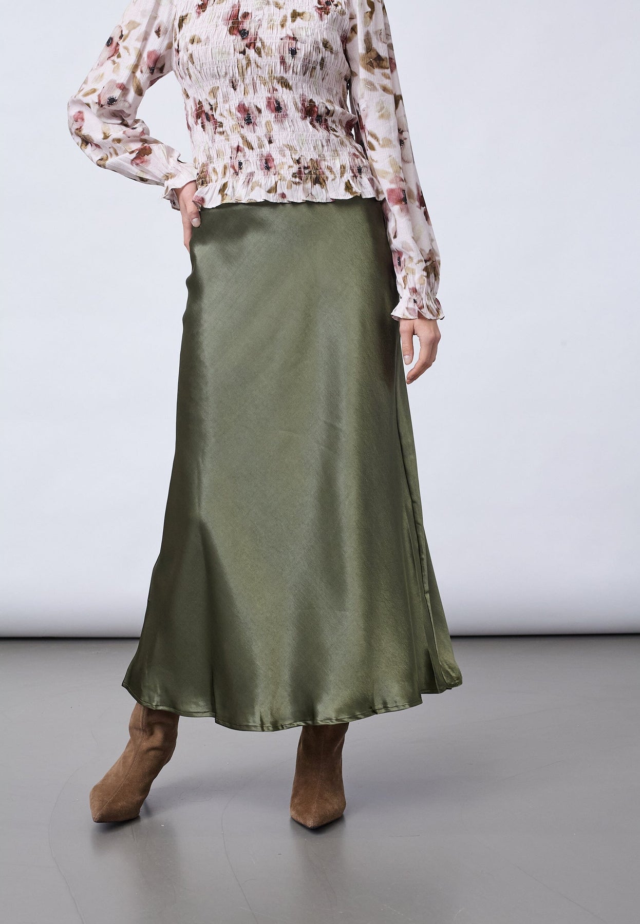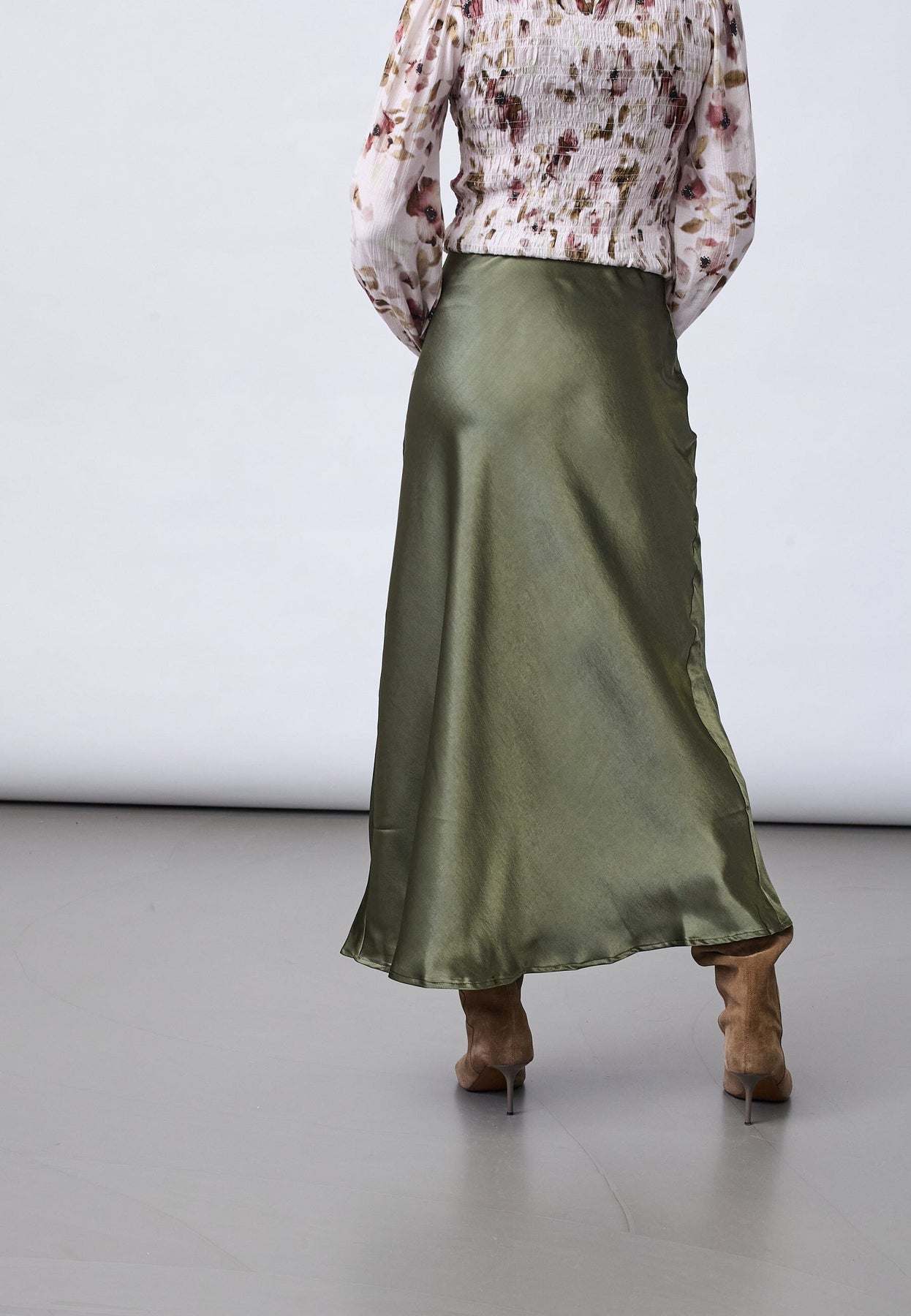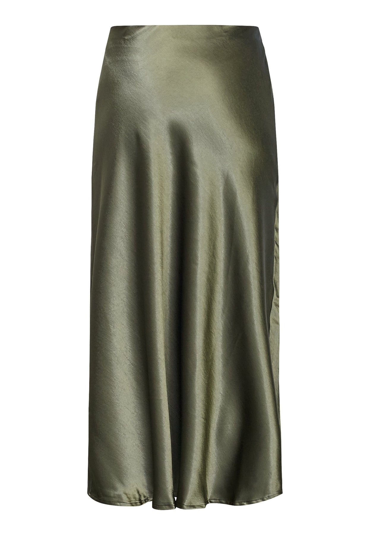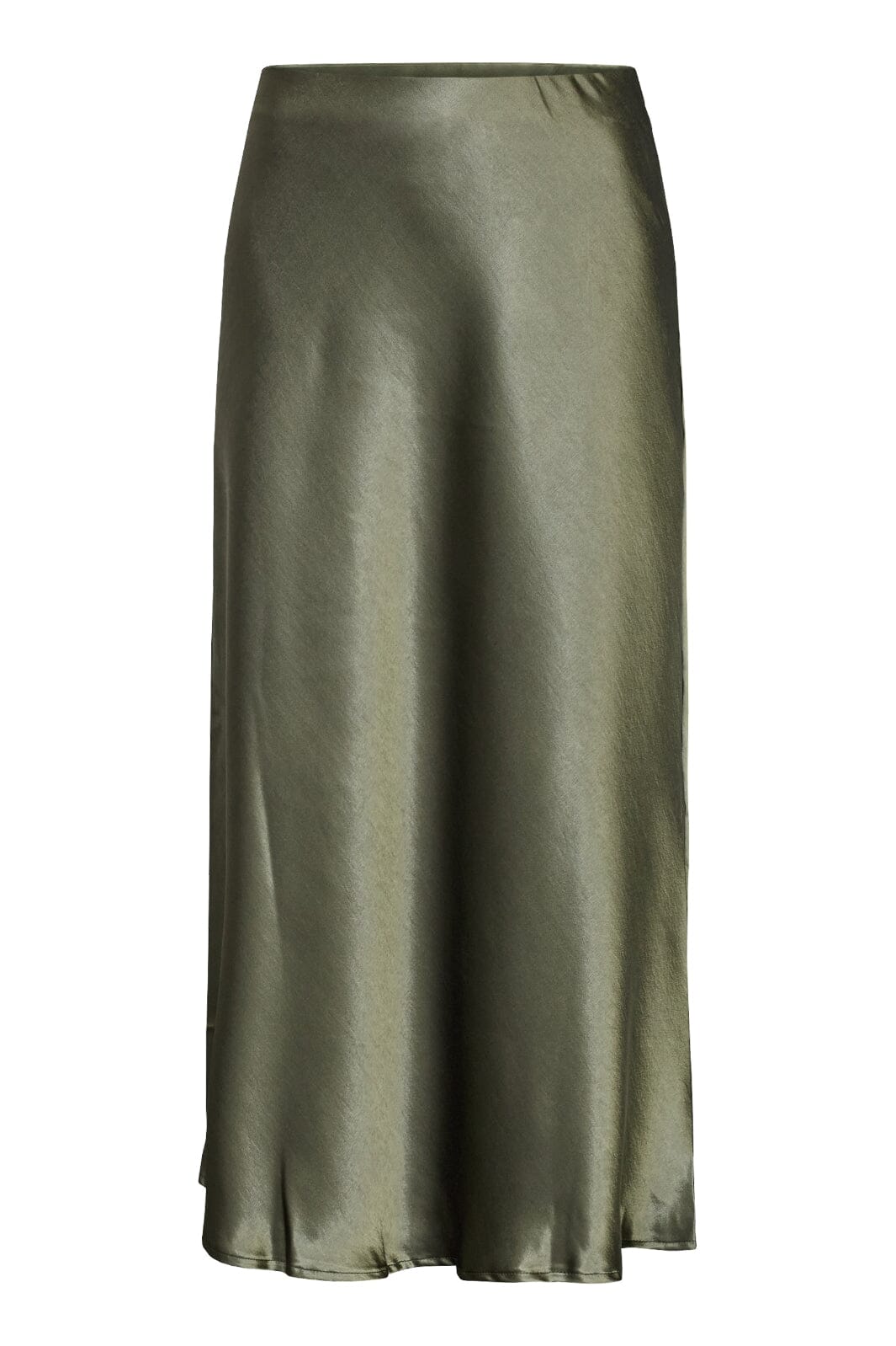 Spódnica marki Sisters Point, wykonana z satyny w oliwkowozielonym odcieniu. Spódnica ma fason w kształcie litery A i długość do połowy łydki.