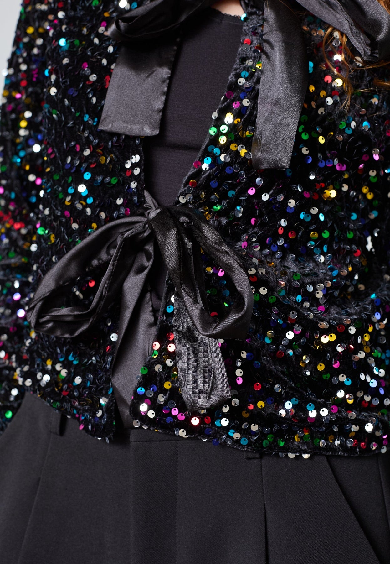 Czarny top od Sisters Point z kolorowymi cekinami na całej powierzchni. Dwie duże kokardy z gładkiego materiału zdobią przód, a top ma długie rękawy z tym samym wykończeniem cekinowym.