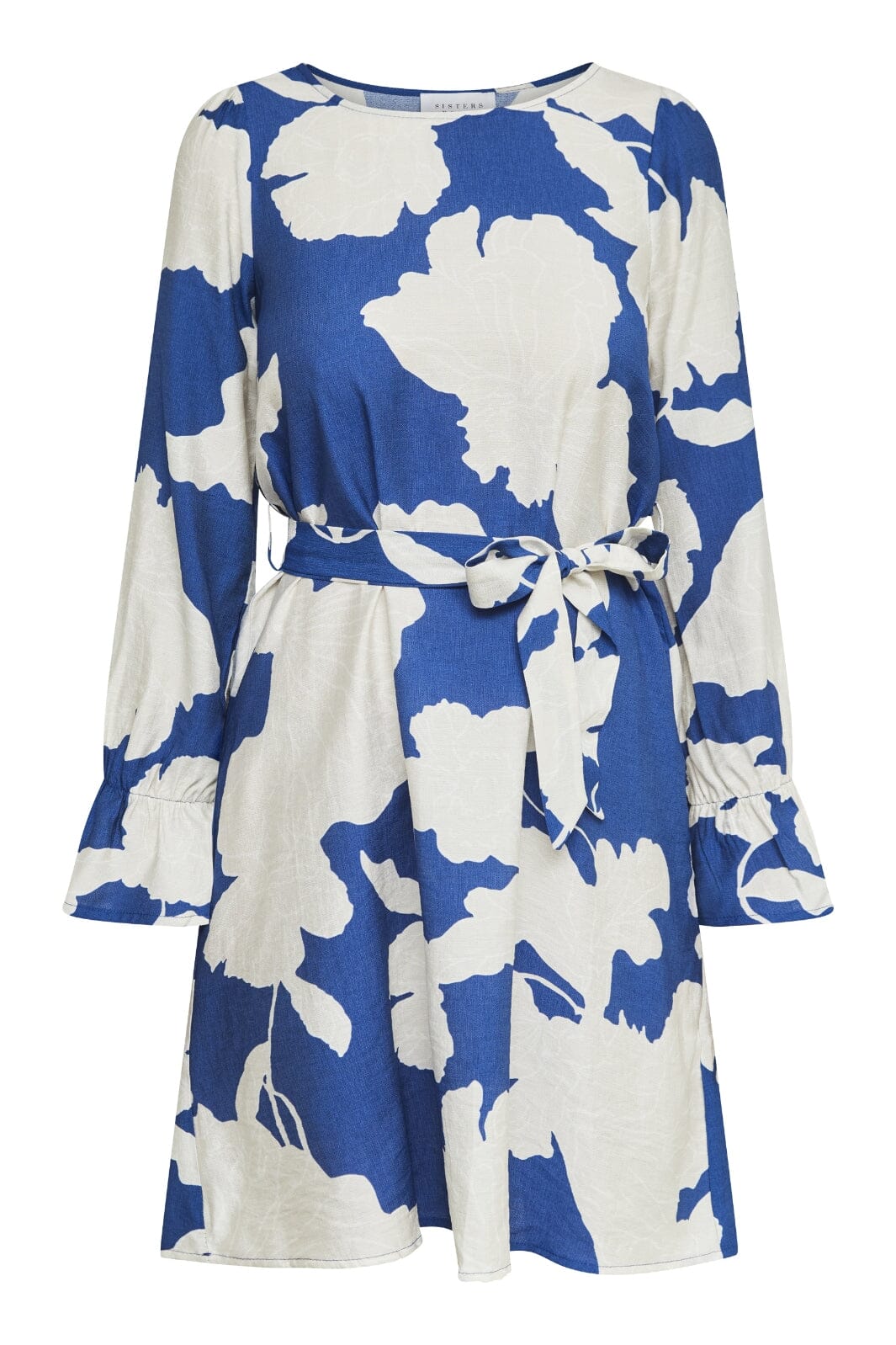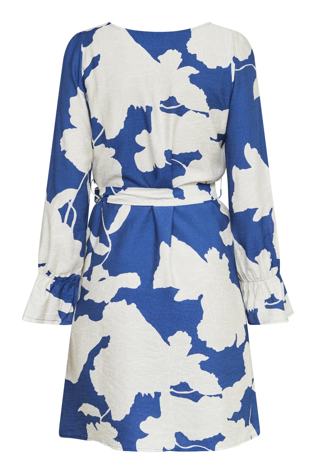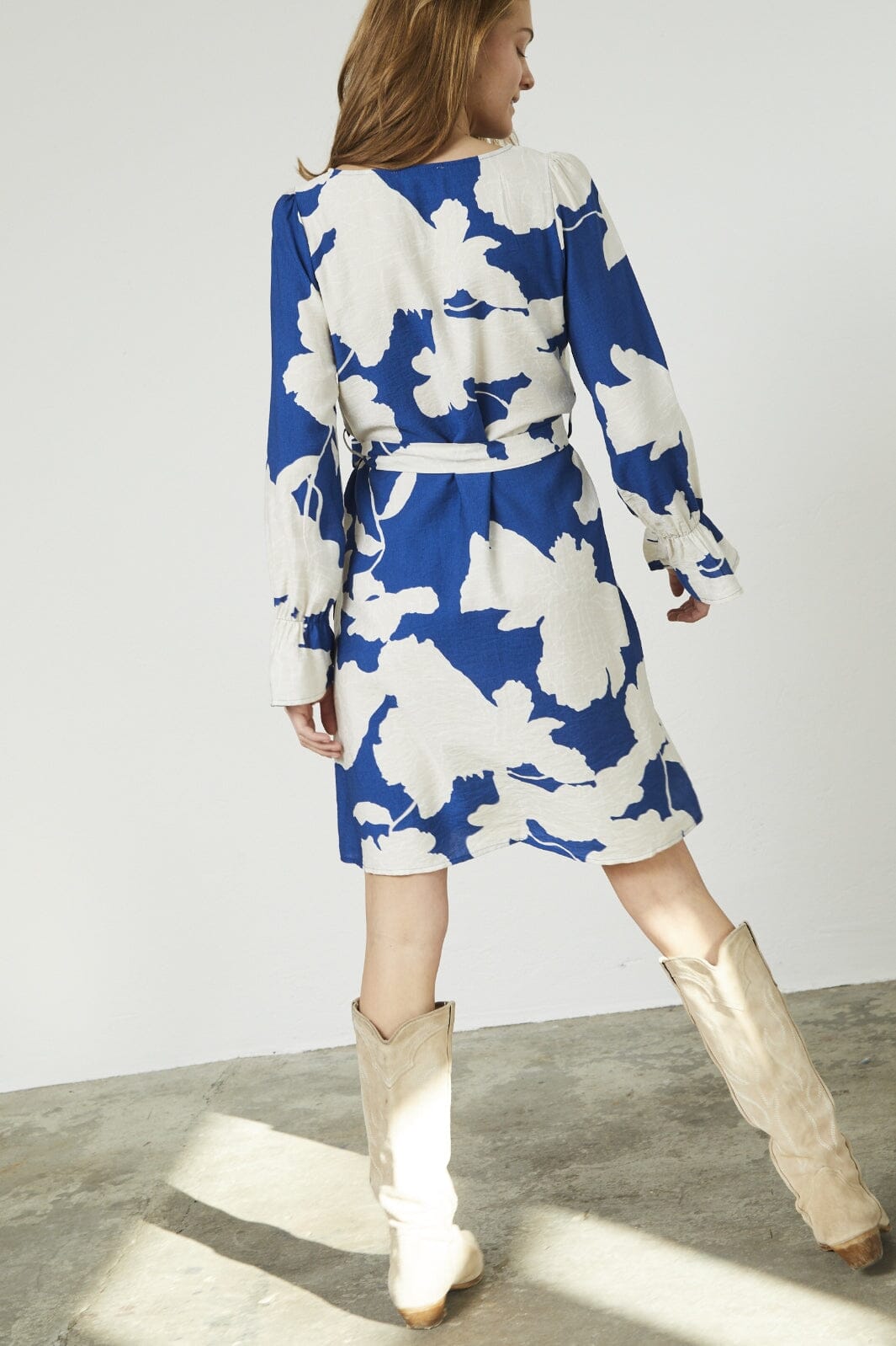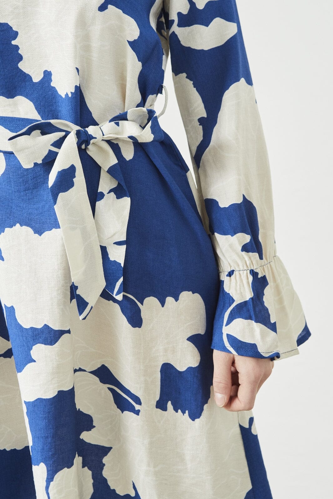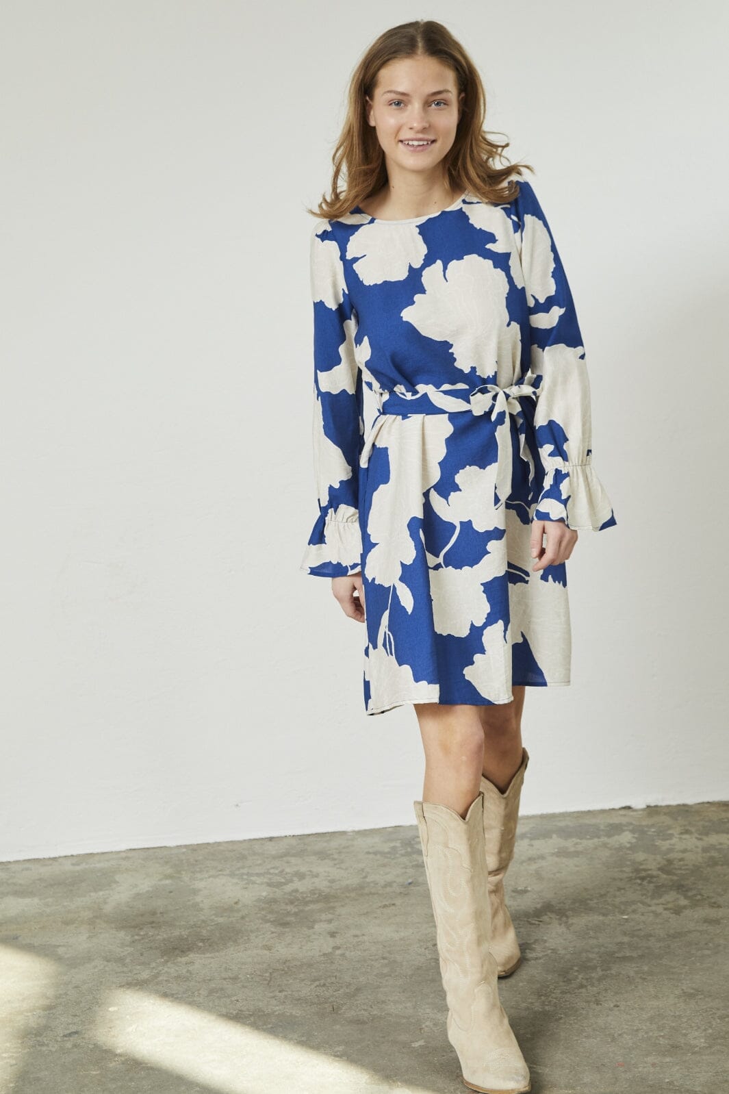 Midi sukienka od Sisters Point z dużymi białymi kwiatami na niebieskim tle. Sukienka ma pasek w talii i długie rękawy z gumką przy nadgarstkach.
