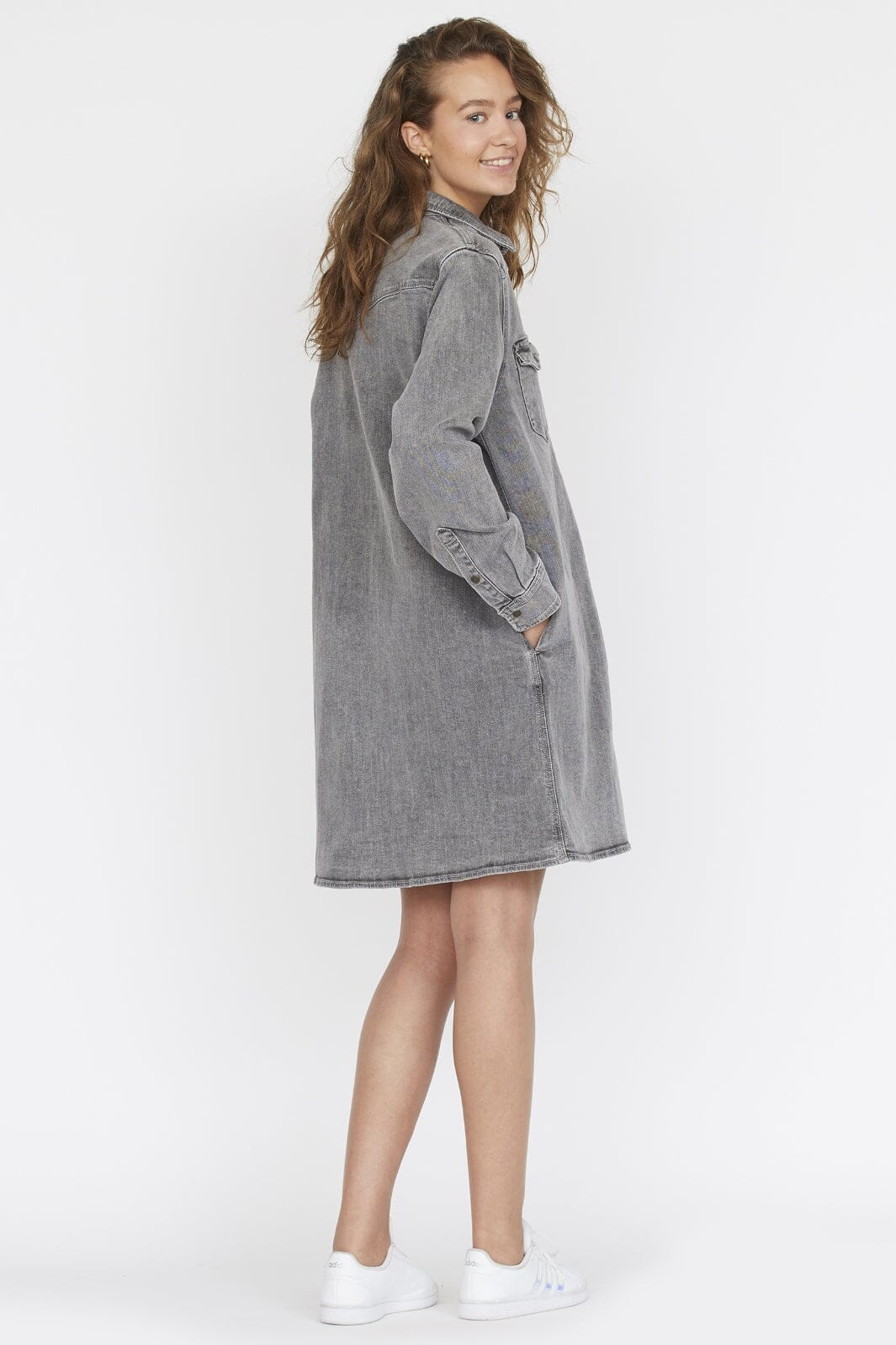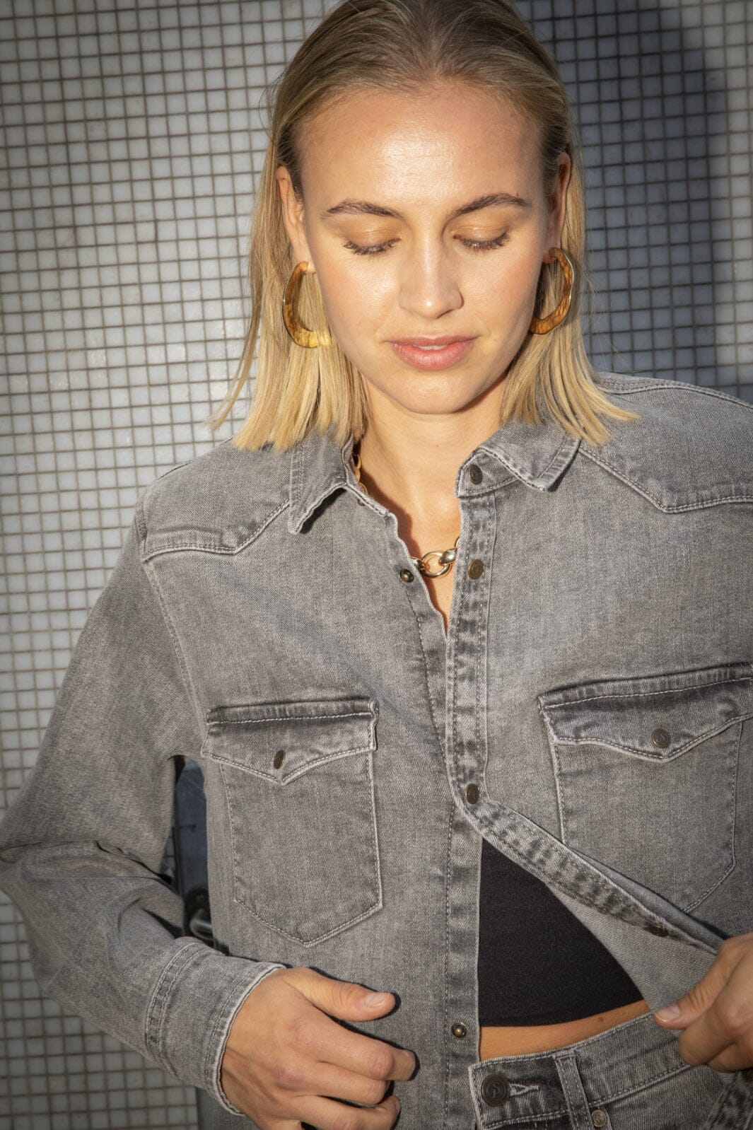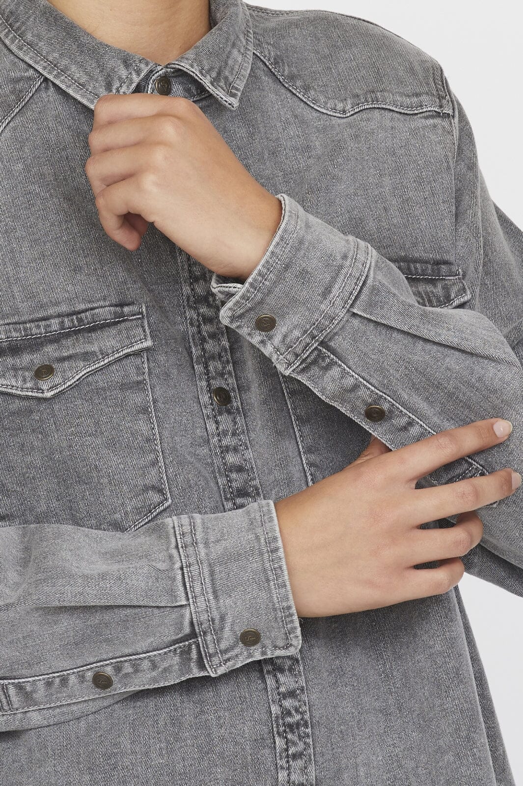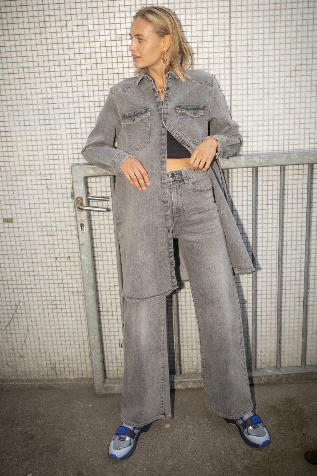 Jasnoszara koszula dżinsowa o luźnym kroju. Koszula ma długie rękawy, kołnierzyk i dwie kieszenie na piersi. Luźna sylwetka zapewnia dużą swobodę ruchów.