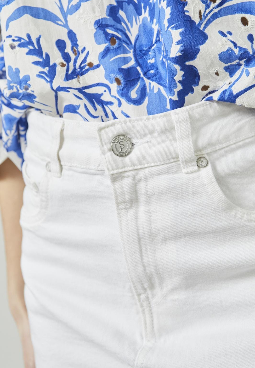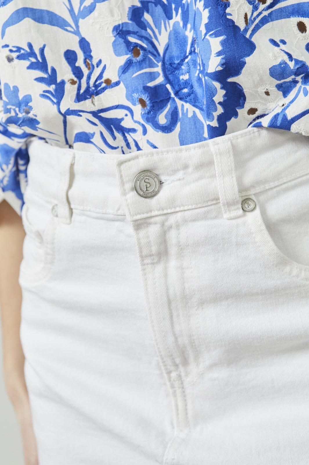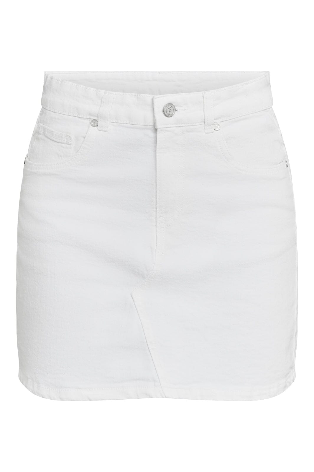 Biała spódnica dżinsowa od Sisters Point o krótkiej długości. Ma dopasowany krój i pas z zapięciem na guzik i zamek błyskawiczny. Spódnica wykonana jest z miękkiej mieszanki bawełny.