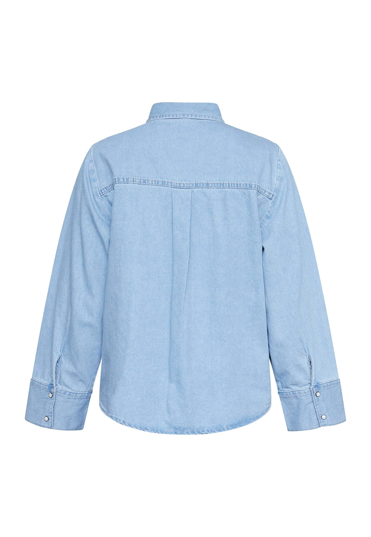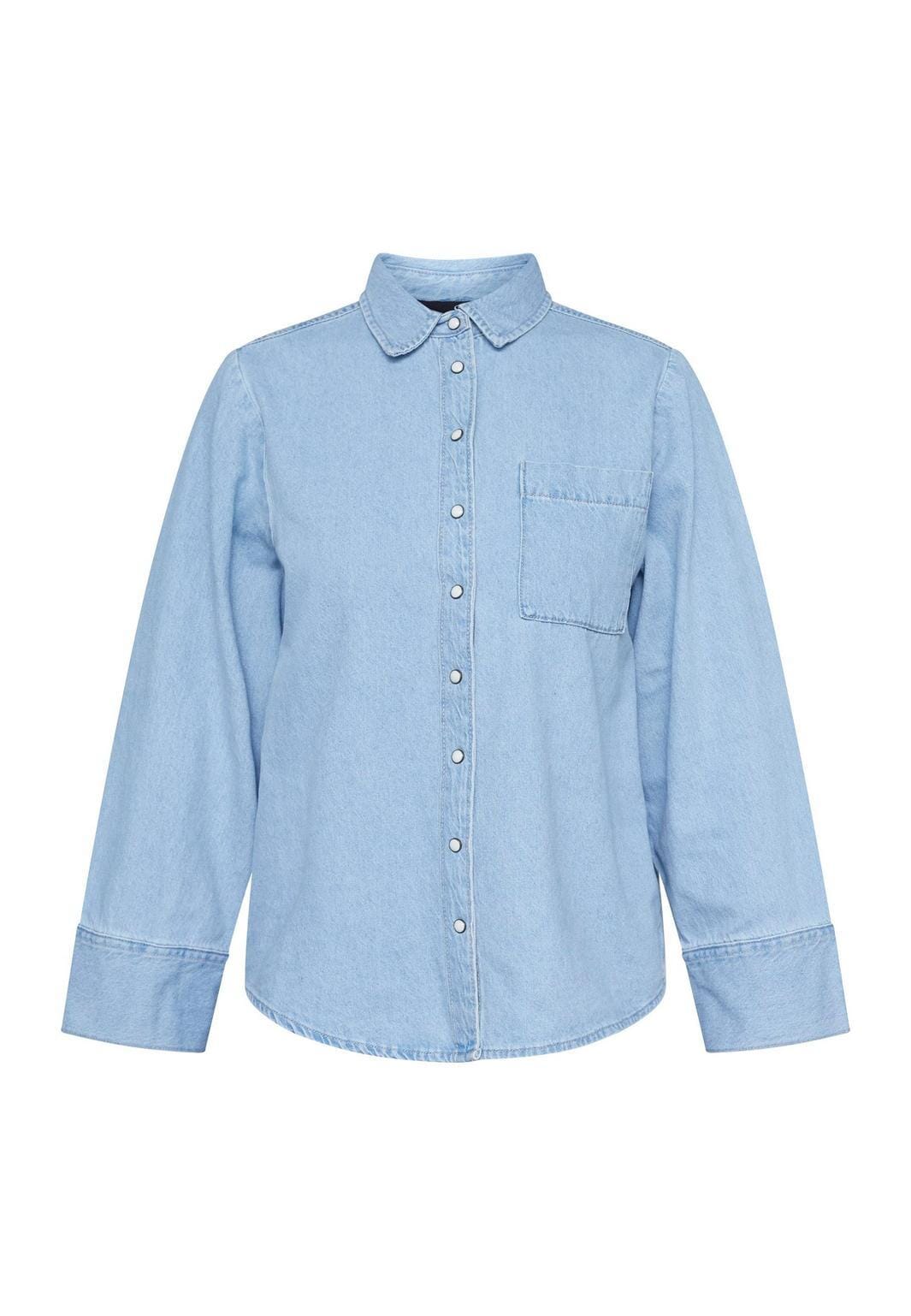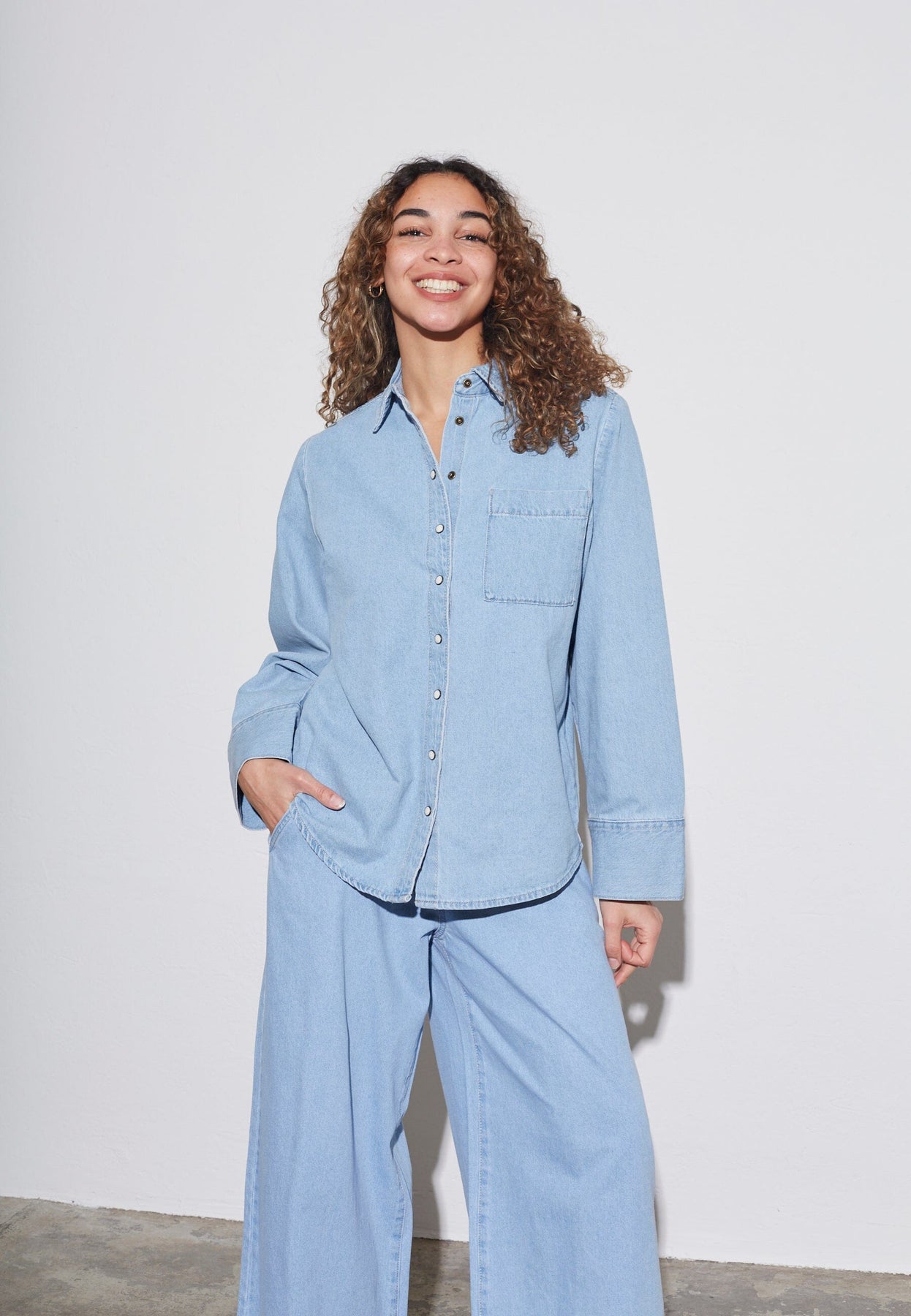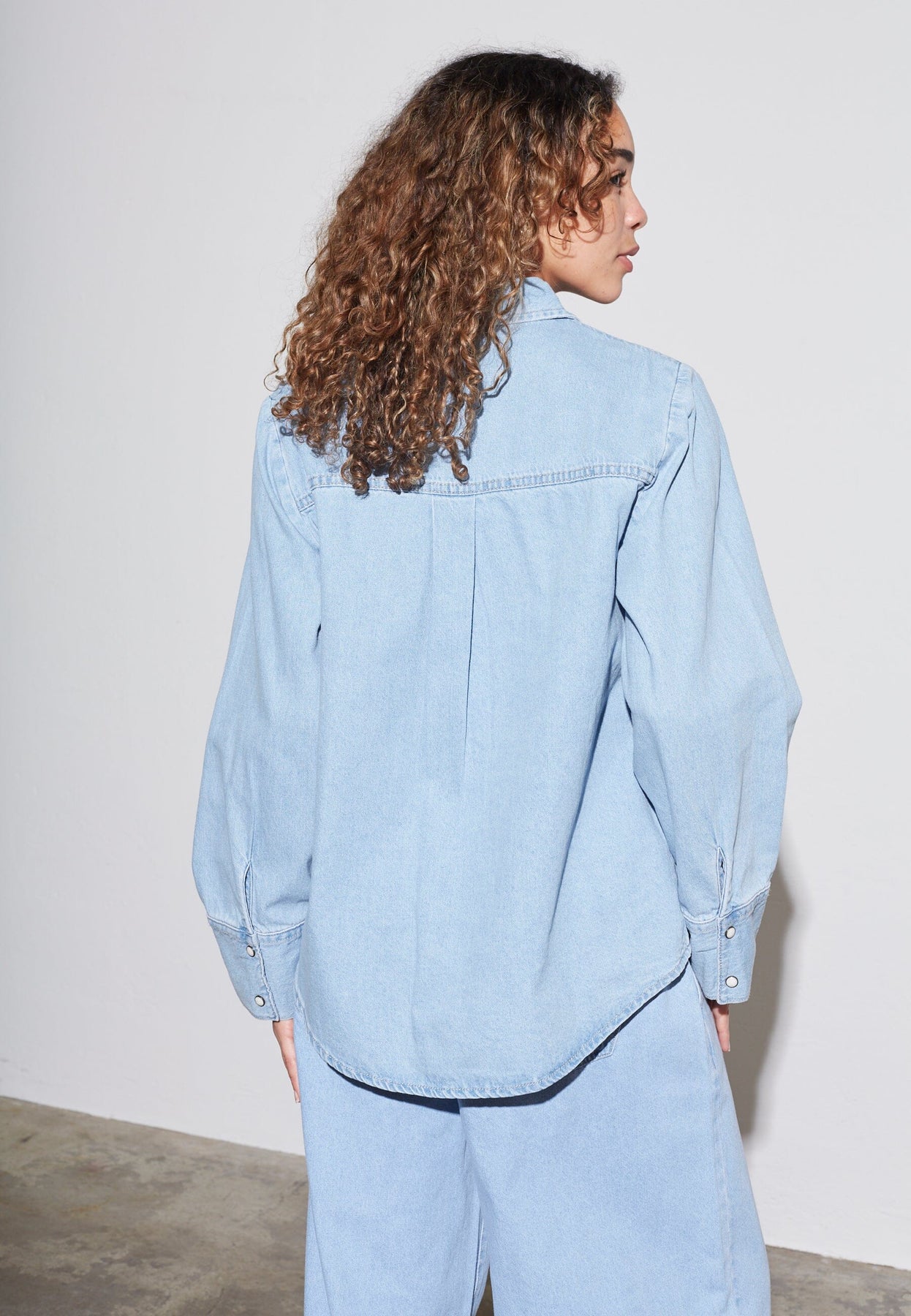 Jasnoniebieska koszula dżinsowa od Sisters Point z zapięciem na guziki i kołnierzykiem. Koszula ma kieszeń na piersi i długie rękawy z dekoracyjnymi szwami oraz falbanami na plecach.