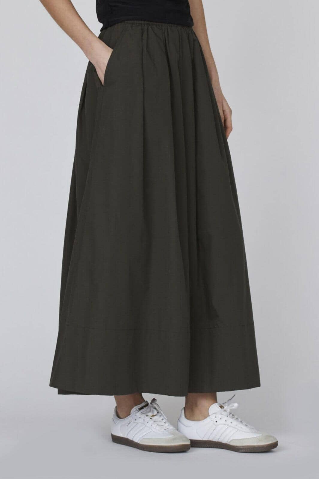 Długa spódnica od Sisters Point w kolorze khaki. Ma luźny krój i elastyczny pas z kieszeniami po bokach.