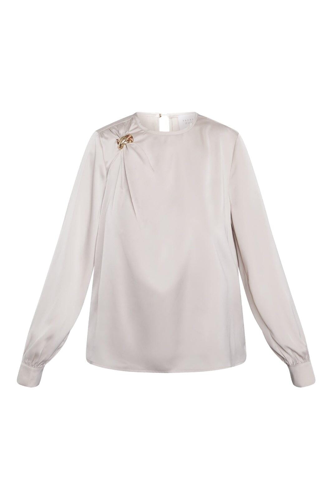 Jasna, kremowa bluzka marki Sisters Point z długimi rękawami i złotą metalową klamrą na ramieniu.